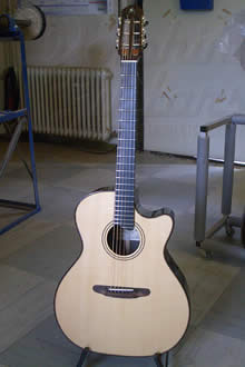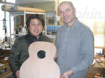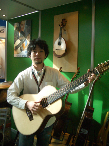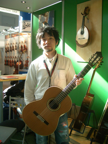 当店スタッフの柘植。昨年5月から1年間の予定(2008年6月帰国予定)でALBET & MUELLERで修業しています。彼の製作したギターは既にドイツ国内で販売されています。帰国後の活躍が楽しみですわい。