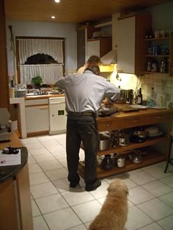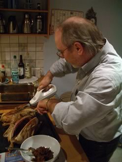自らカモを調理して取り分けてくれるんですが、後ろ姿はギター製作中と変わらない!(笑)