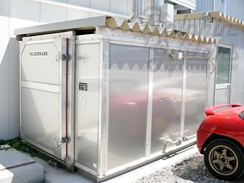 最近取り入れられた材の乾燥マシーン。自然乾燥を終えた材はこのマシーンに入れられ人口乾燥を加えます。