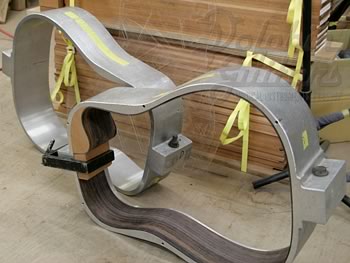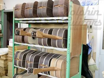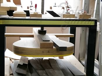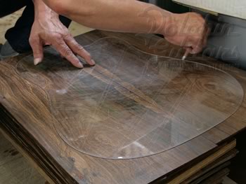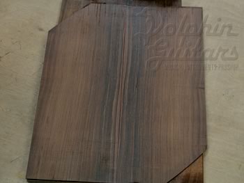 当店カスタム・オーダーギターの内のひとつのモデルはドレッドノート・カッタウェイ仕様です。既に型は製作して頂いていた様で、秋に向けてまずはプロト・タイプの製作に取りかかります。特殊な木目を持つ材は、木取りで雰囲気が変わります。型を当てて「この部分をこんな感じ・・・どう?」ってな具合です。