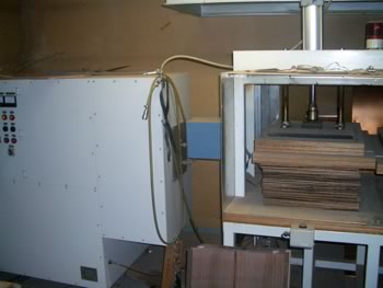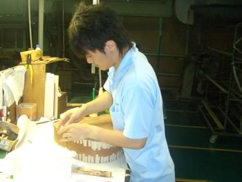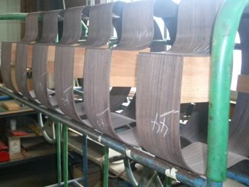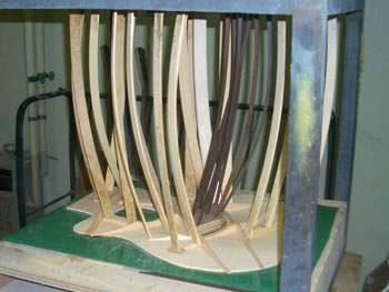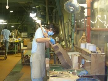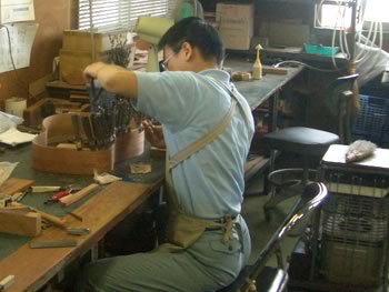 ライニング接着待ち(左)ボディー内部のライニングの接着作業、これも1本、1本手作業。