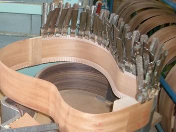 ネックをセットして(左)バインディングを巻き付けています。これも地道な作業です。