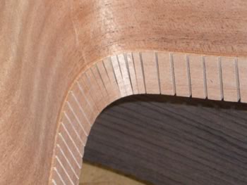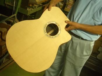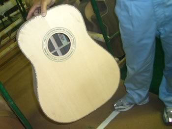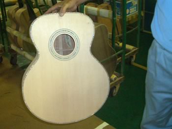 Sシリーズのトップ材、 バインディングやネックをセットする前のギターのボディー