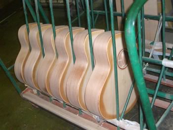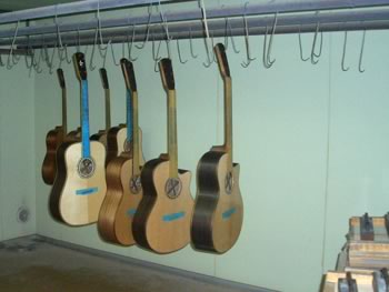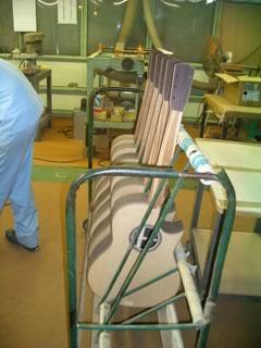 中塗り塗装を終え、乾燥途中のギター。しかしラインとは言いますが、数名のスタッフでそれぞれ専門の作業を行う様子は、海外の・・例えばサンタクルーズやコリングスの様です。