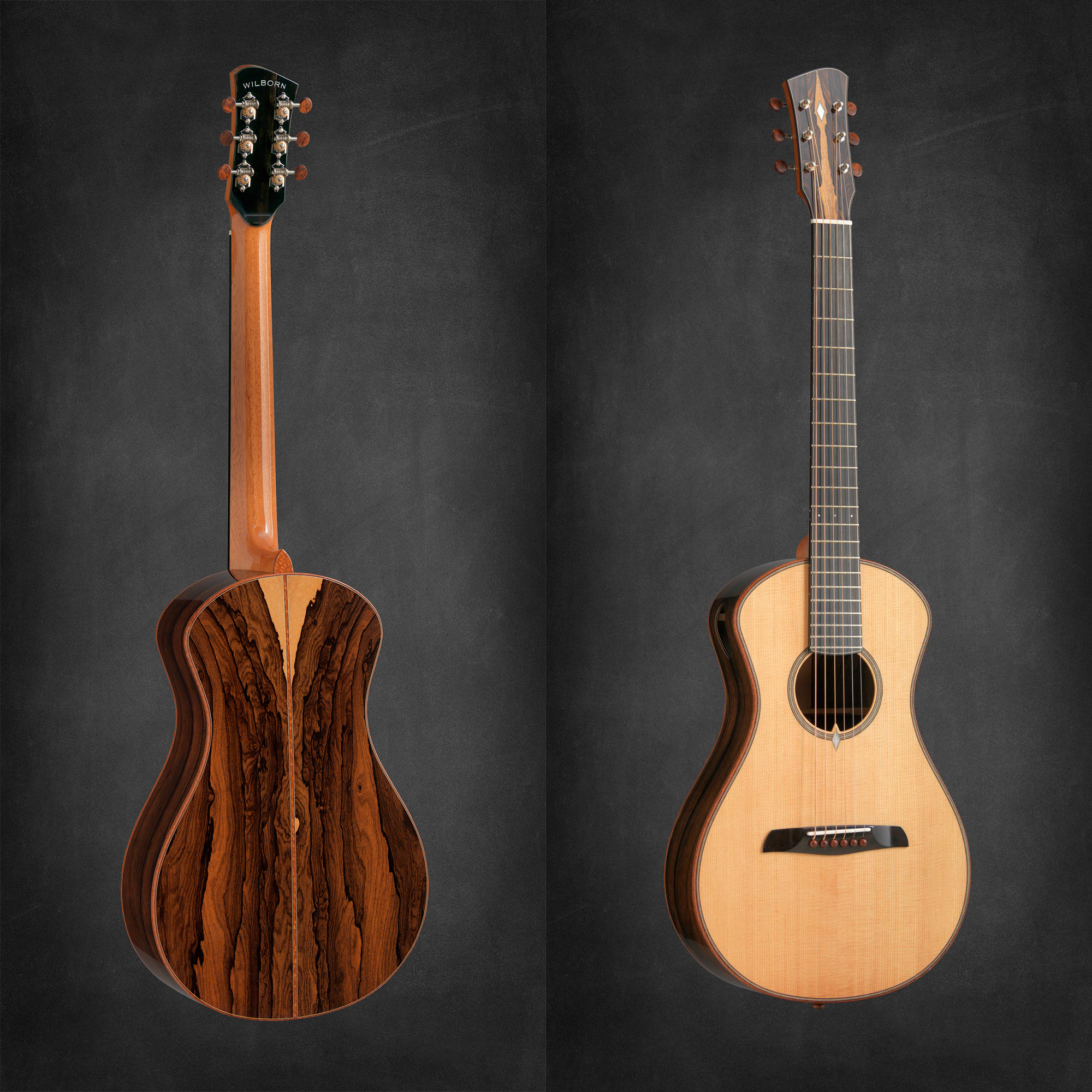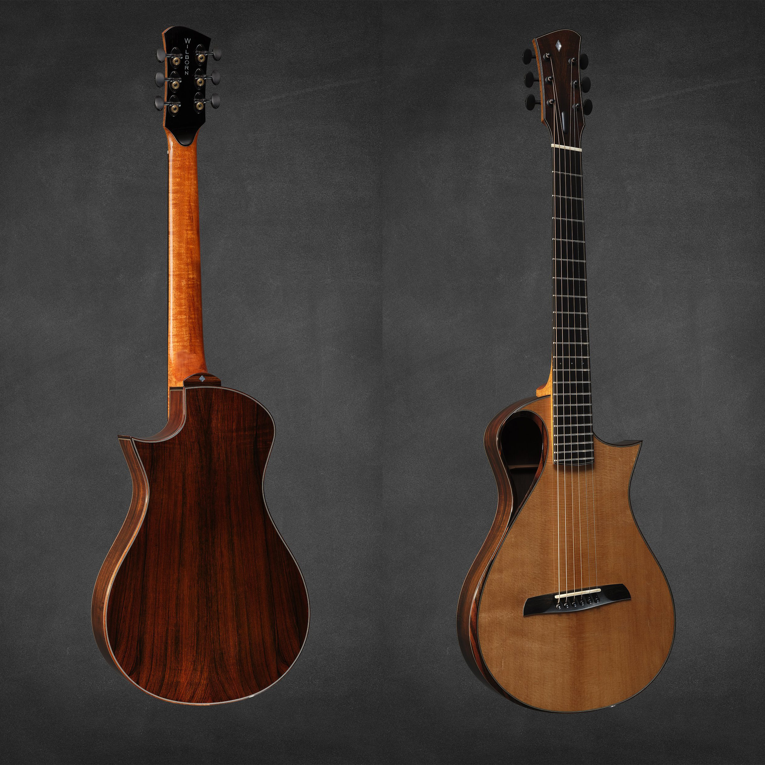 演奏家としての経験を背景に、プレイヤーの視点を反映した独創的なデザインや構造を特徴とし、既存の概念にとらわれない発想で生み出されるギターは「品質への絶対的なこだわりと豊かなトーンを追求する情熱」に裏打ちされています。その仕上がりは細部まで精巧で、使用する木材・ハードウェア・塗料のすべてに最高グレードのみを選び抜き、製作工程の最初から最後まで一貫してウィルボーン氏自身の手で行われています。