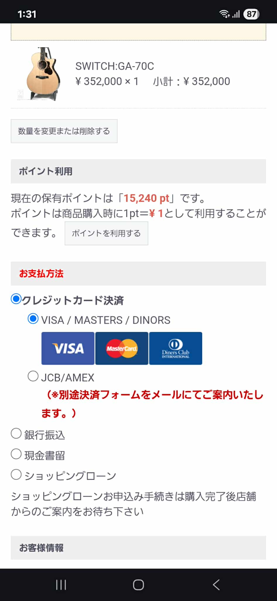 (6)「お支払い方法」の選択に移ります。ご希望の決済方法を選択してください。