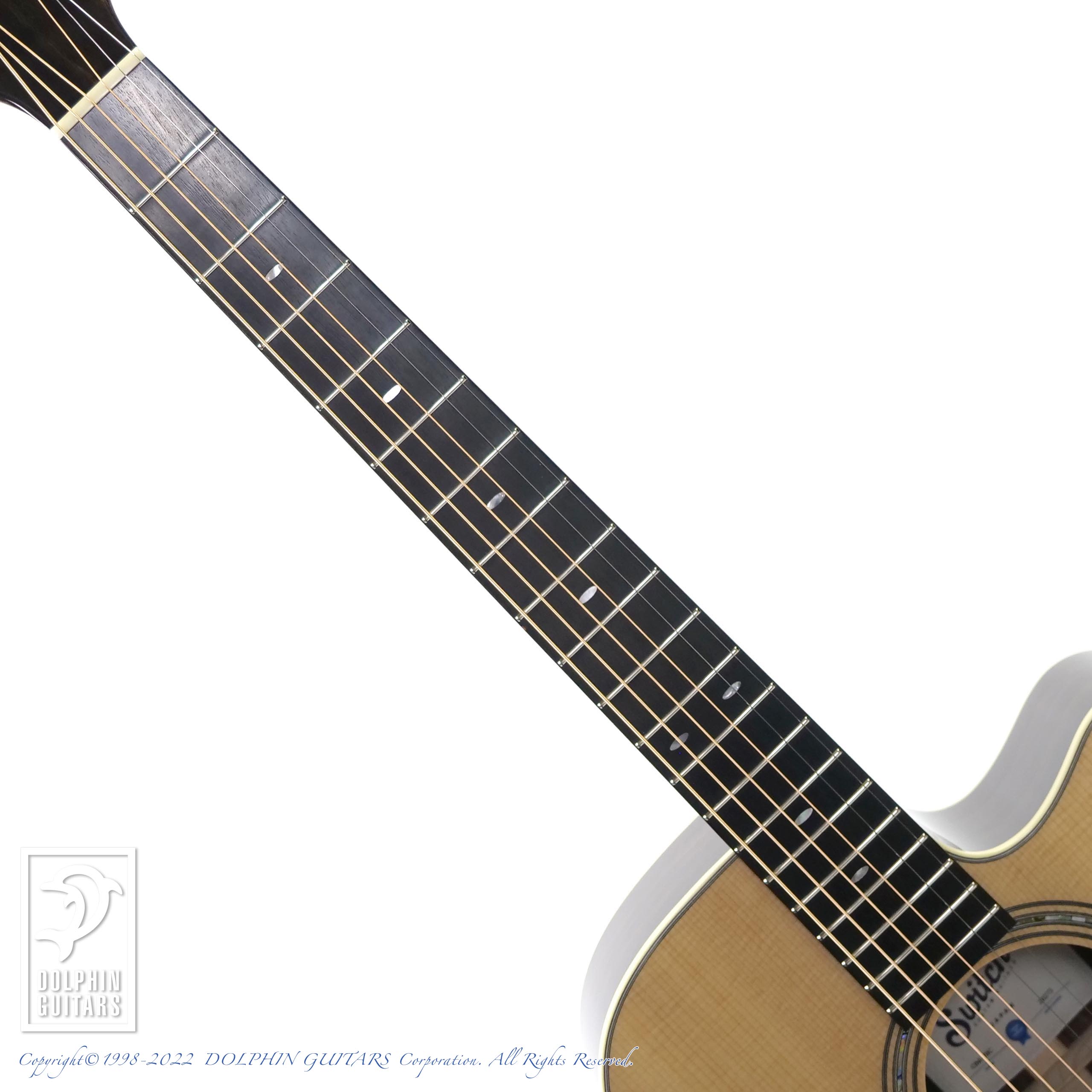 ローアクションなセッティング&ソフトタッチでも十分な音圧を得られるように設計されており、抜群の操作性能を誇ります。全体的にやや甘いトーンが心地よく、その中にキラリと感じるスプルースの高音特性、インディアンローズの持つ低域の重量感もバランス良く混ざり合います。OMシェイプの反応の良さはフィンガースタイルはもちろんのこと、しなやかなストロークでの弾き語りにもベストマッチします。