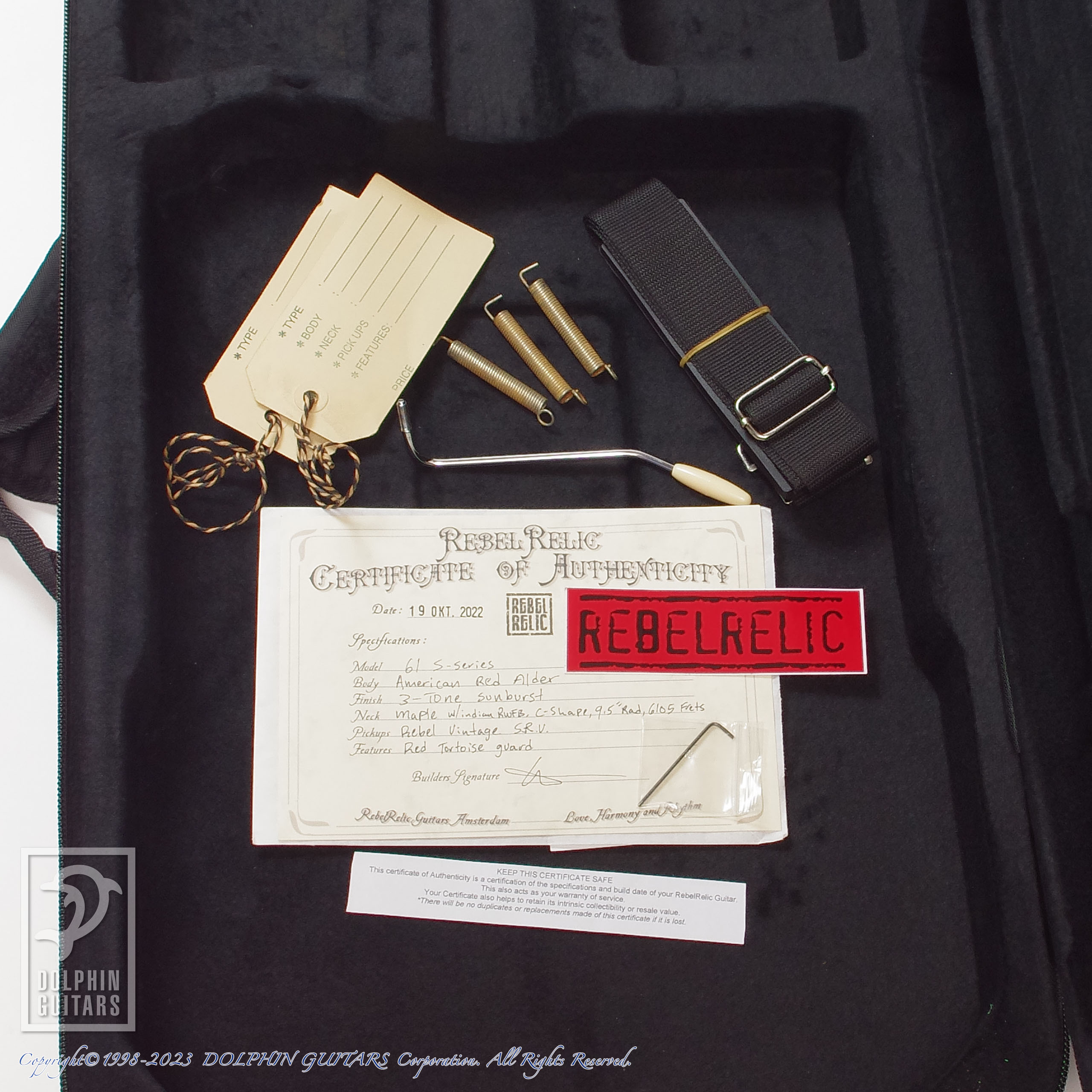 その他:42mmナット幅、648mmスケール、オリジナルRebel Vintage S.R.V.ストラトピックアップ、1vol-2Tone-5wayレバースイッチ、レッドトーティスPG、クレイドットポジションマーク。