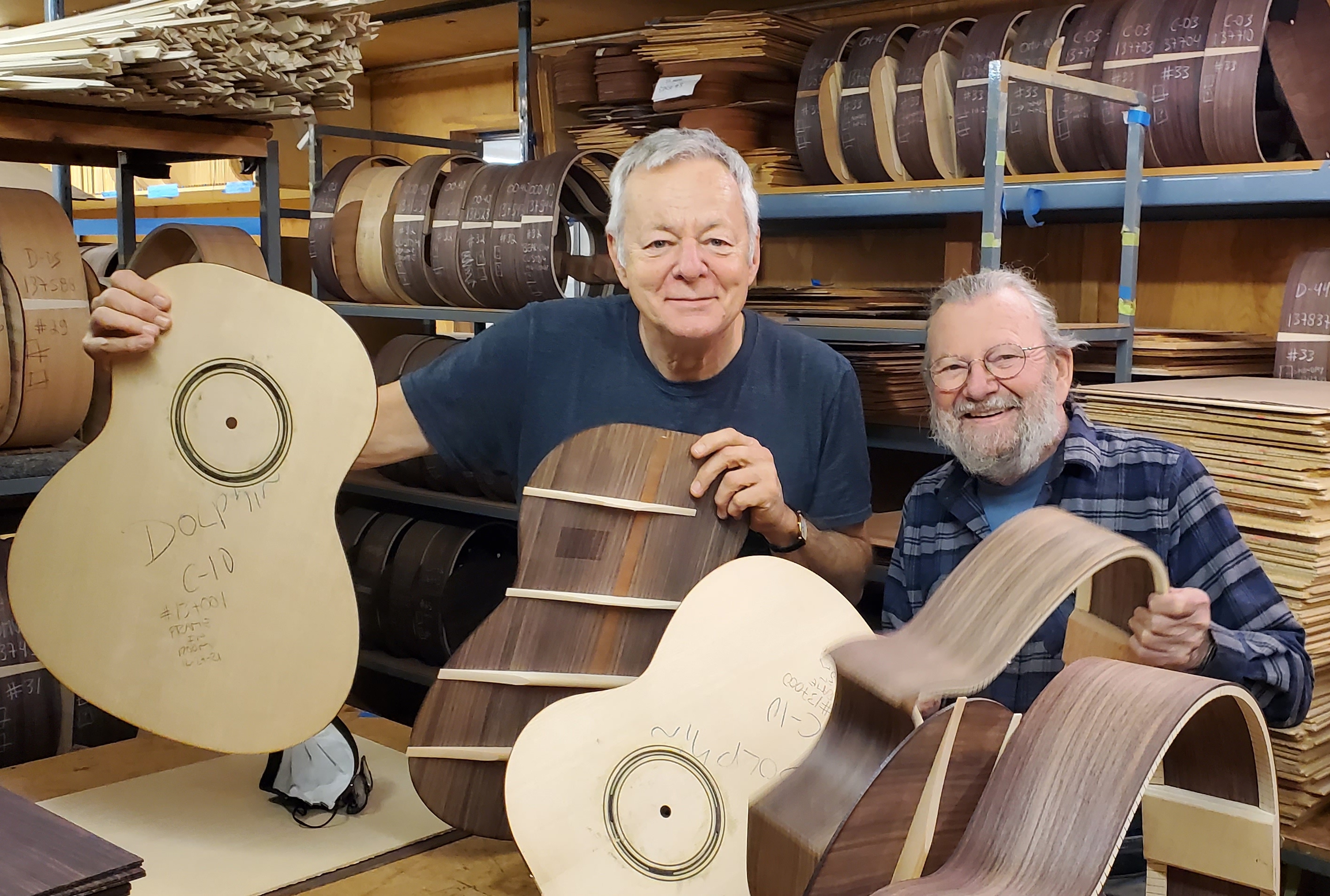 写真は2022年1月某日、トミー本人が偶然ラリビー社を訪れ、製作中のトップ材を片手に写真を撮ってくれました。右に写るのはジャン ラリビー氏です。