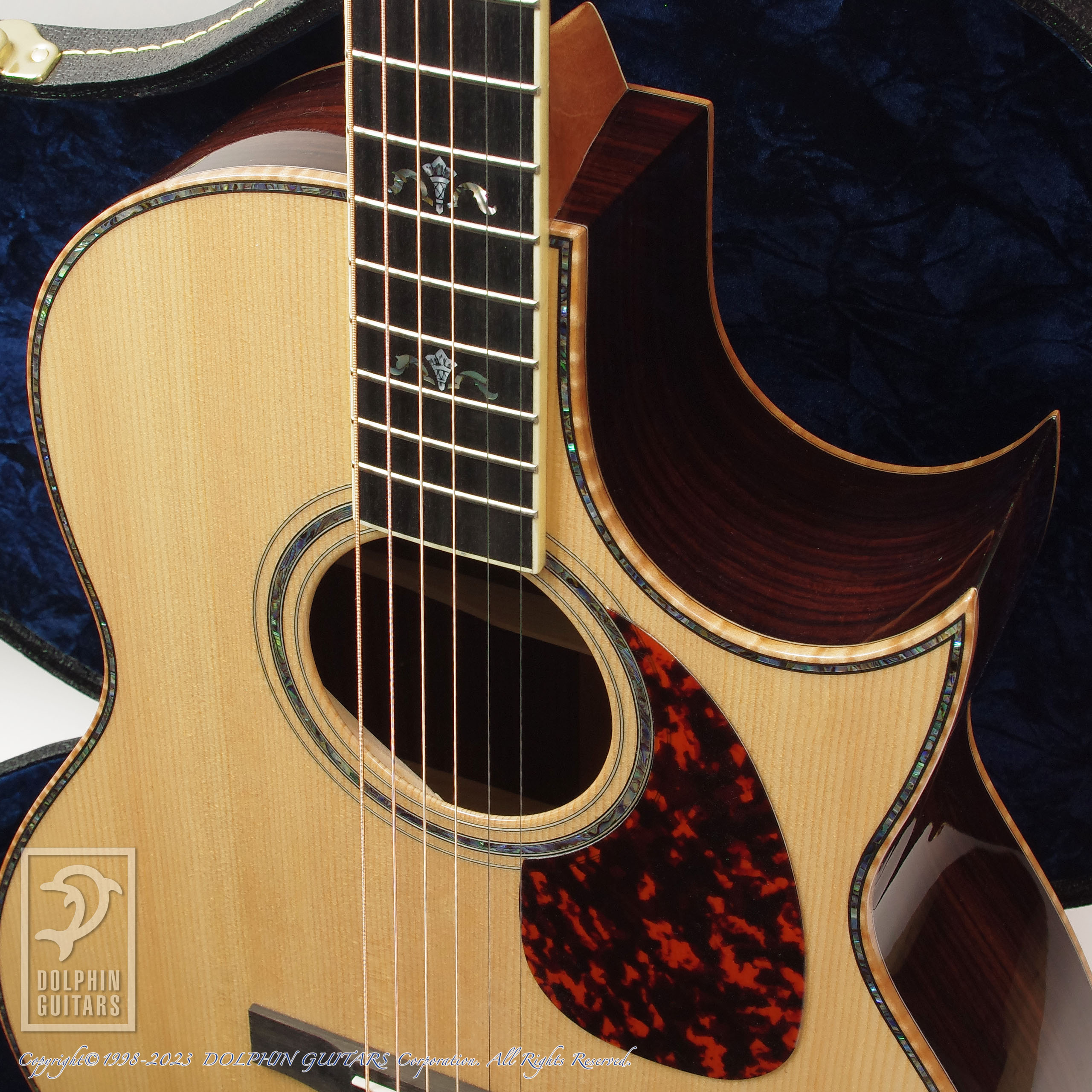 その他:12Fジョイント、エンジェルヘッドストック、トーチ&ウィング指板インレイ、アバロンロゼッタ&パーフリング、フローレンタインカッタウェイ。