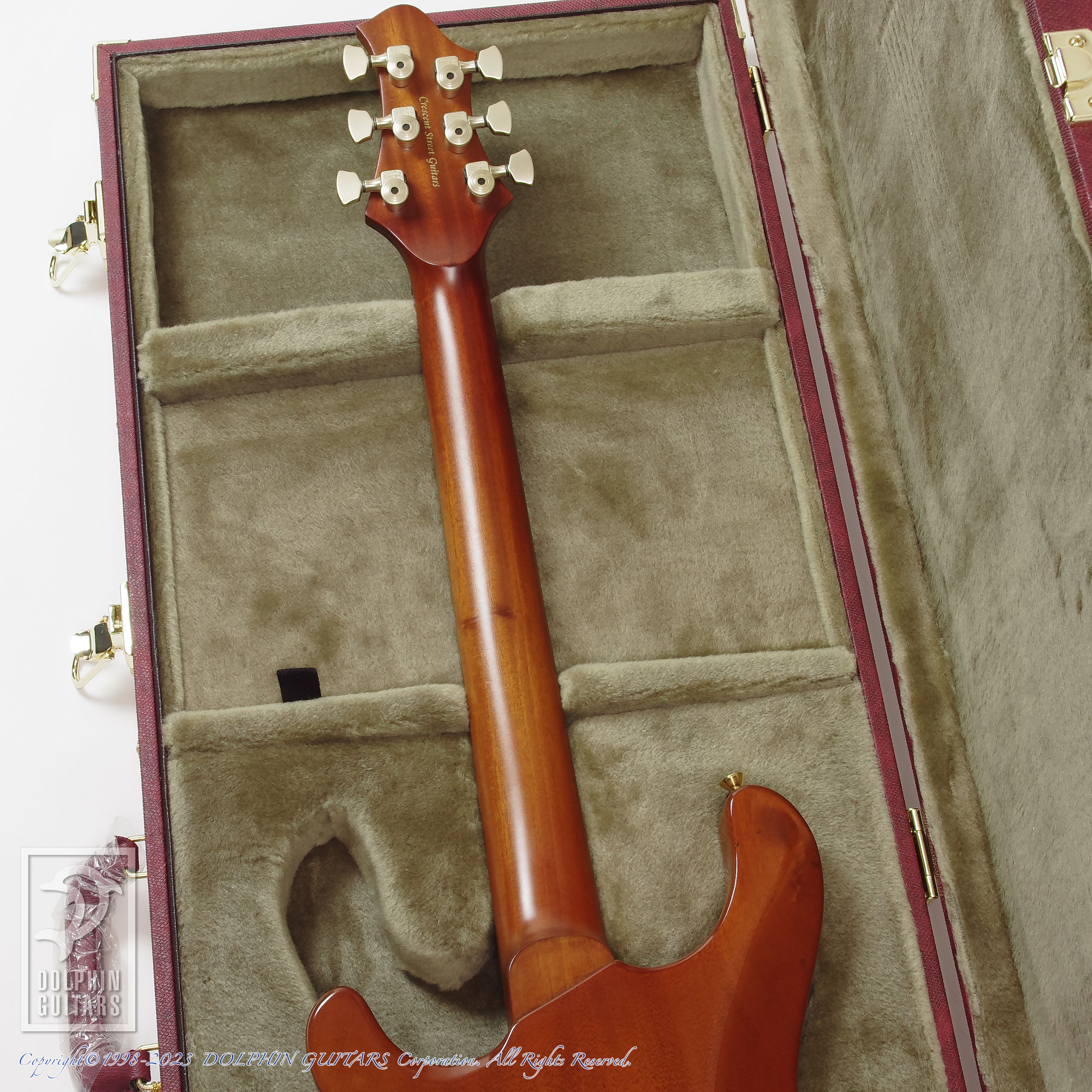 バックパネルはブビンガ材にて製作。フィニッシュの質感も含めハンドメイド感が伝わってきます。ホンマホの木目も美しい。ケースは本モデルに合わせて製作された日本製の専用ハードケースが付属。その他仕様書やピックアップの元箱、トレモロアーム、レンチ類も付属します。