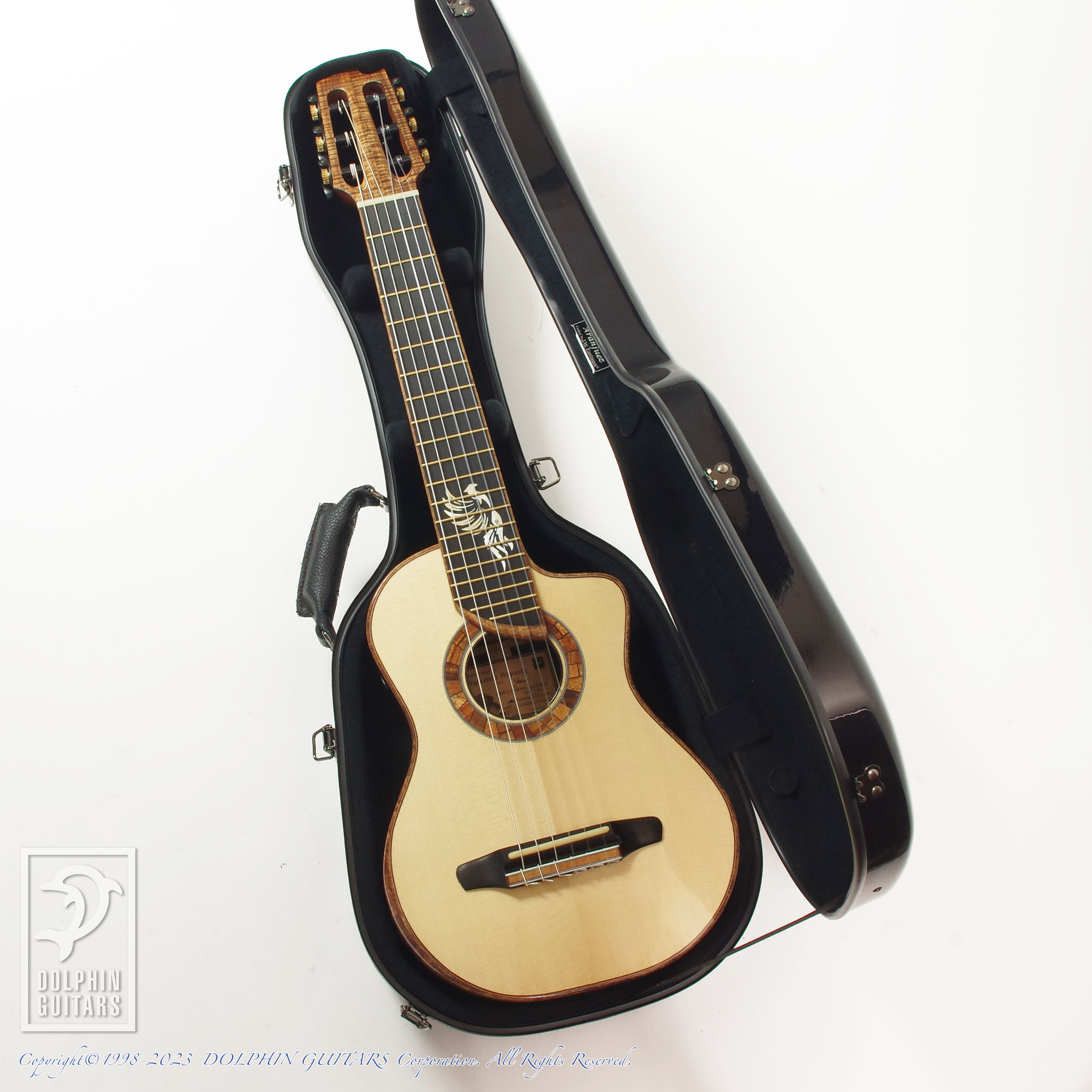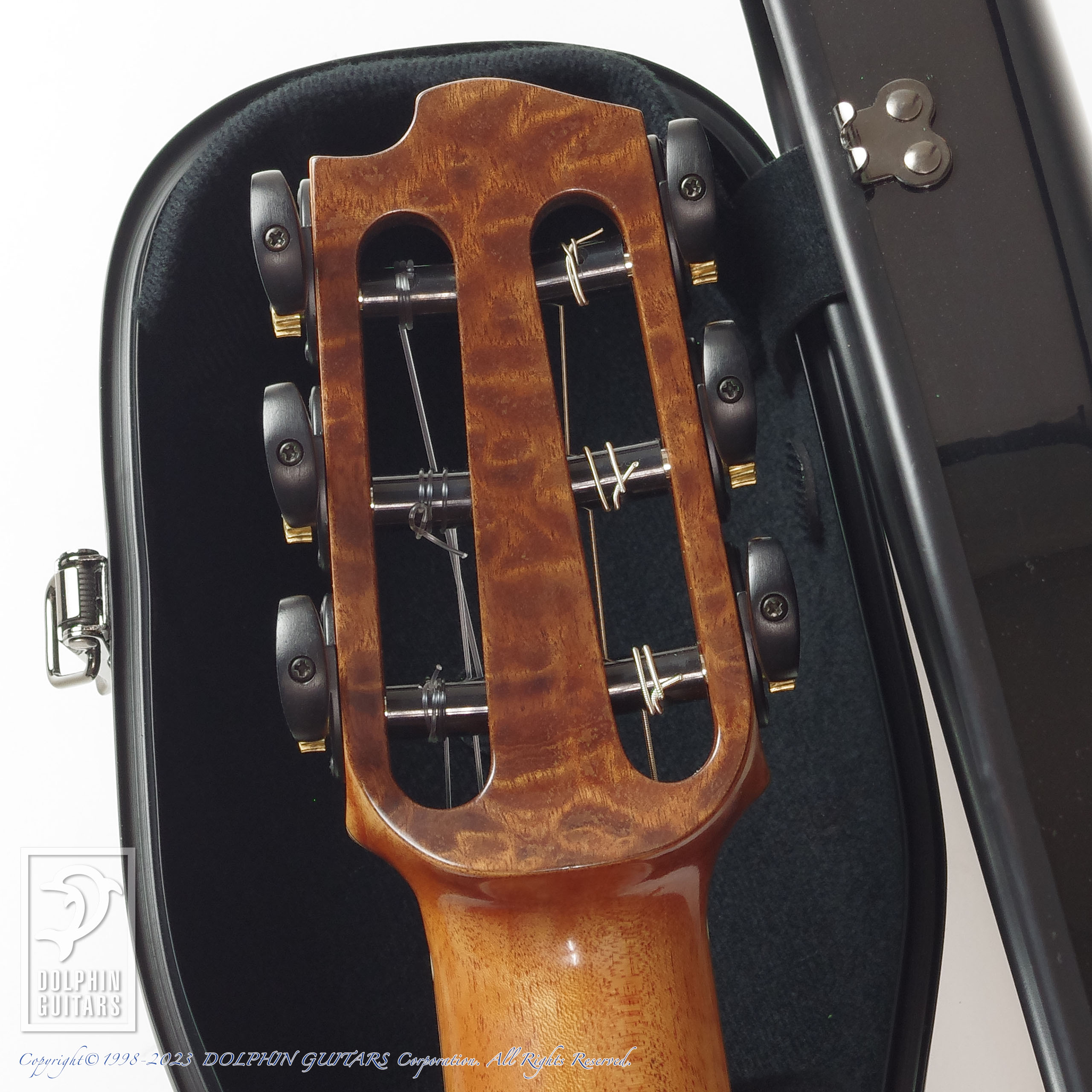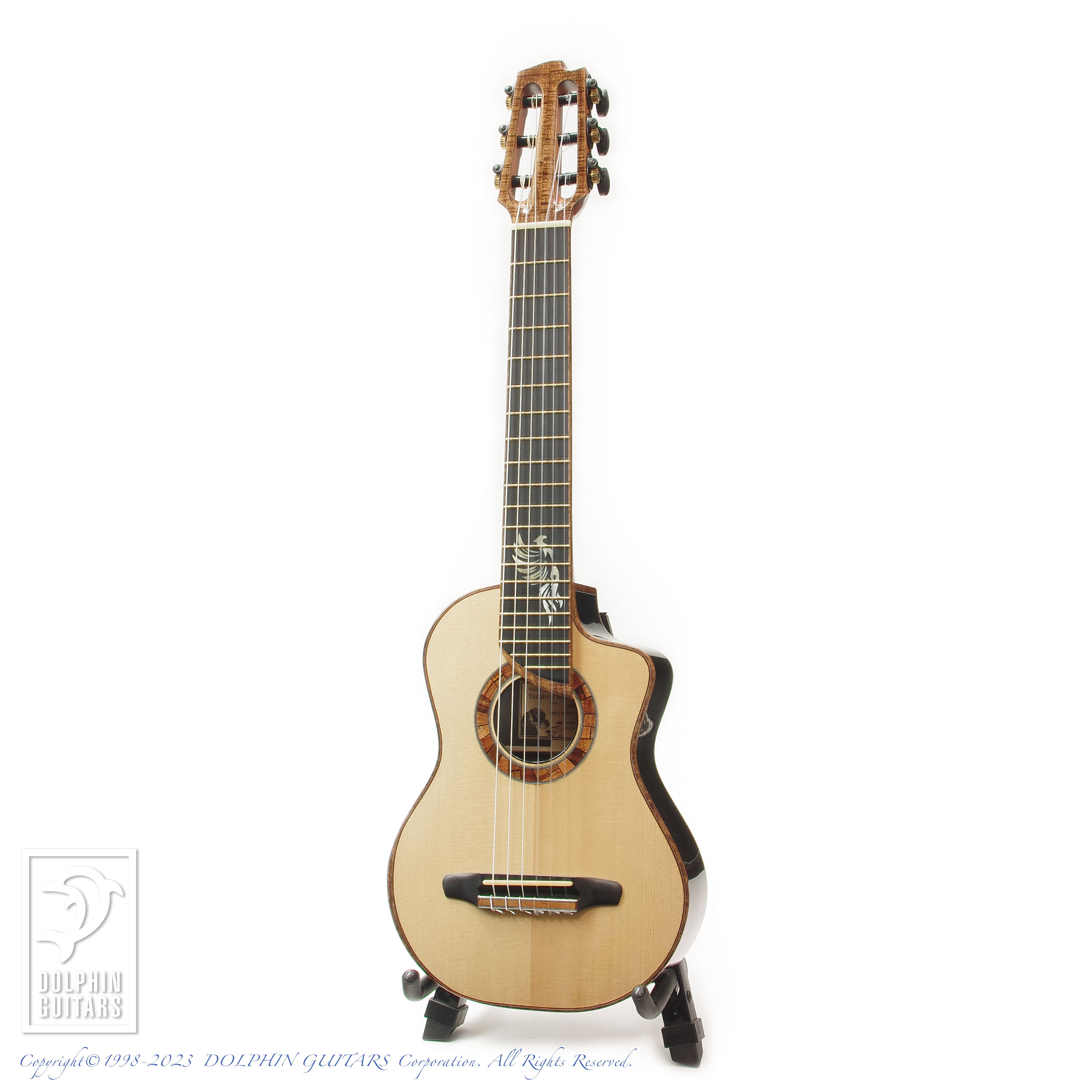 本器はテナーウクレレとほぼ同サイズまでコンパクトにしたオリジナルサイズのピッコロギター、フェニックス指板インレイが施された Lana Piccolo Cutaway (Phoenix Inlay)。TOKYOハンドクラフトギターフェス2023 出展作品です。