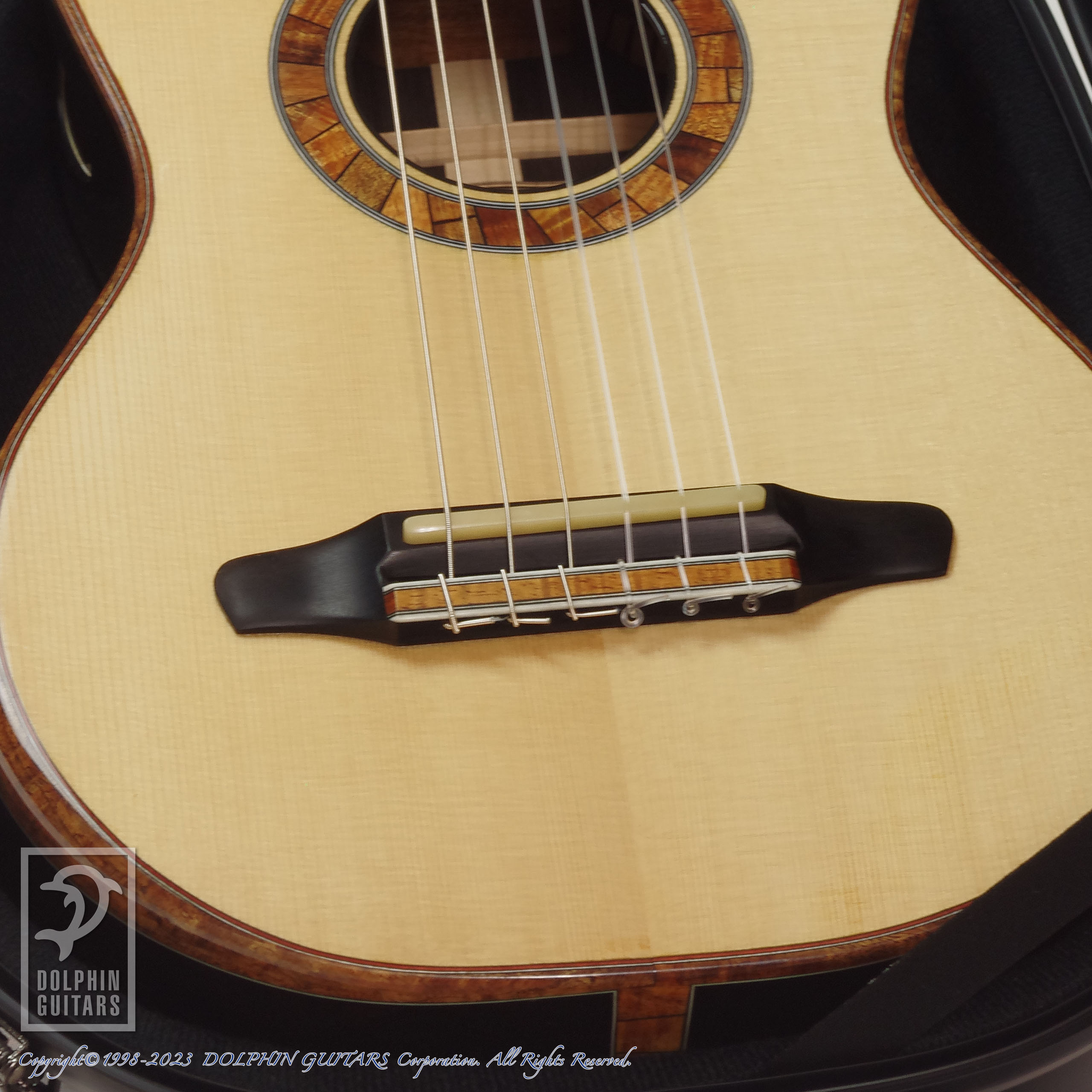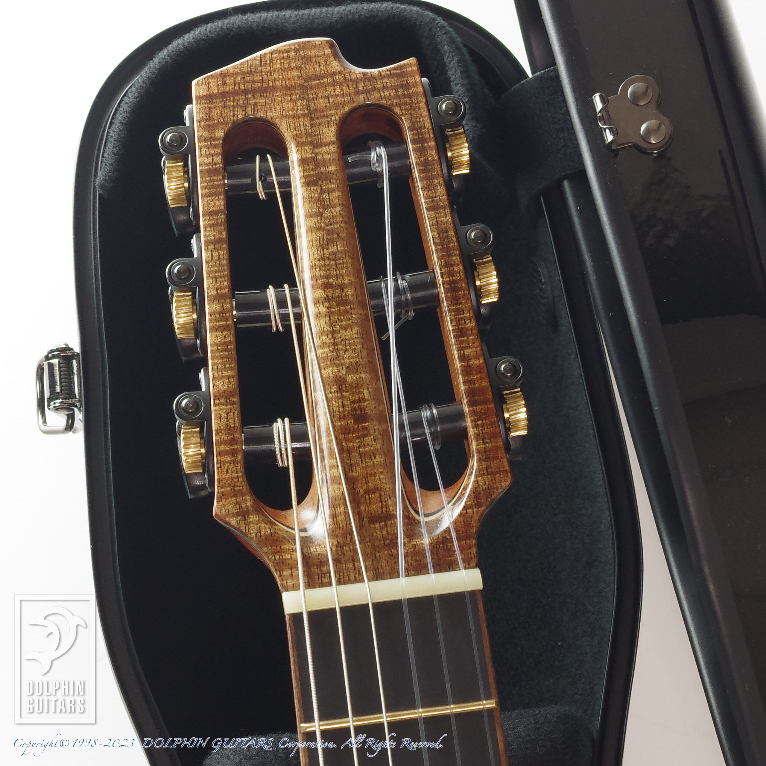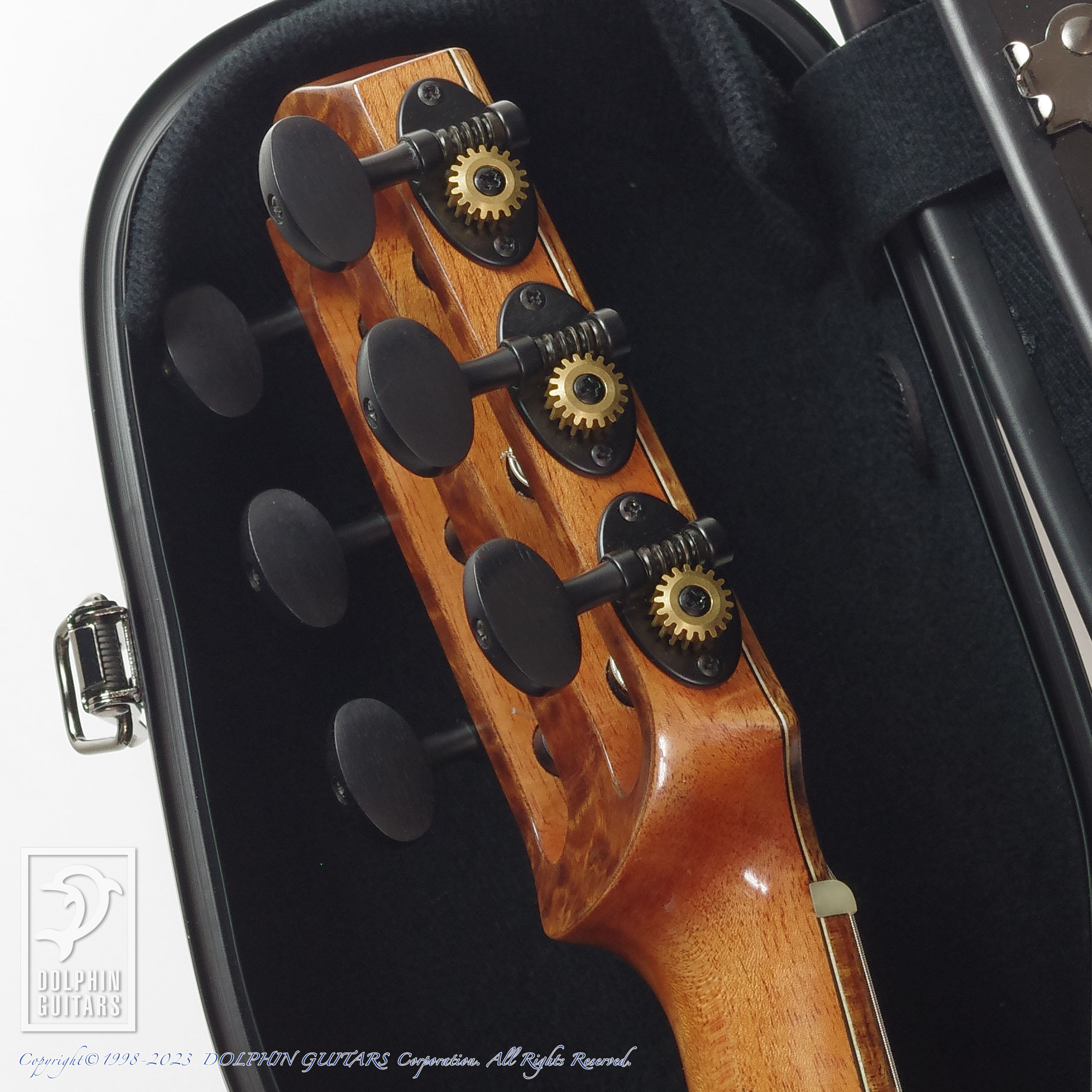 本器はテナーウクレレとほぼ同サイズまでコンパクトにしたオリジナルサイズのピッコロギター、フェニックス指板インレイが施された Lana Piccolo Cutaway (Phoenix Inlay)。TOKYOハンドクラフトギターフェス2023 出展作品です。