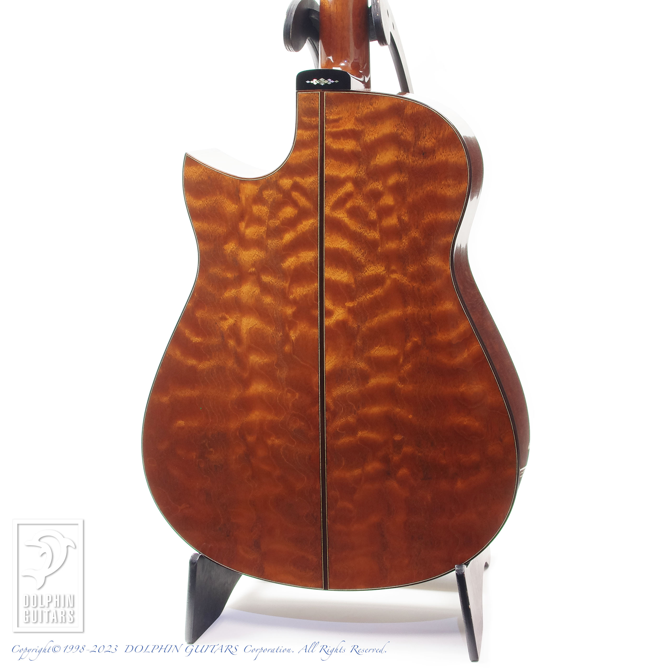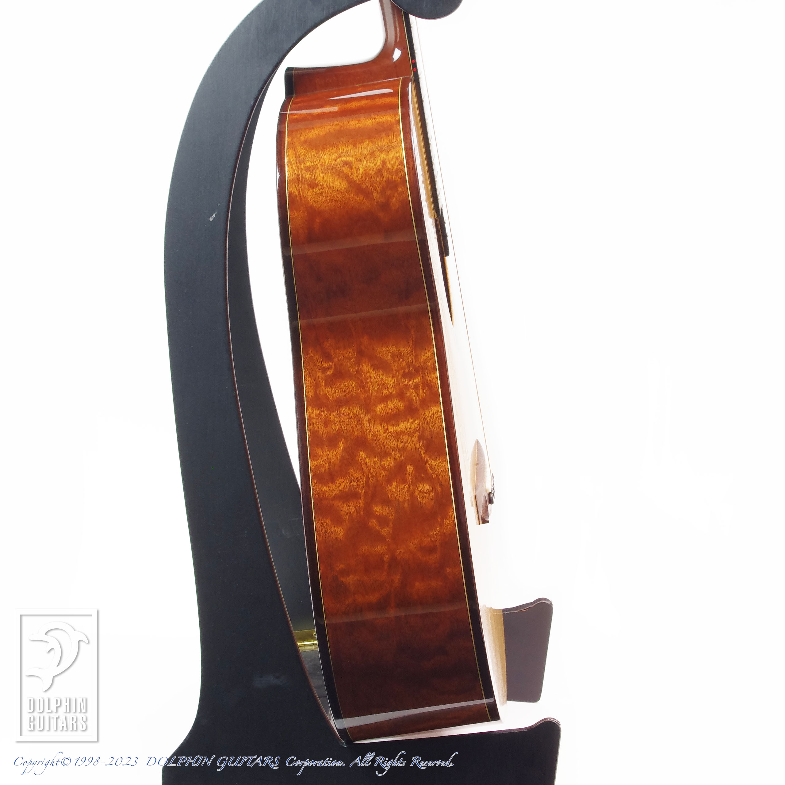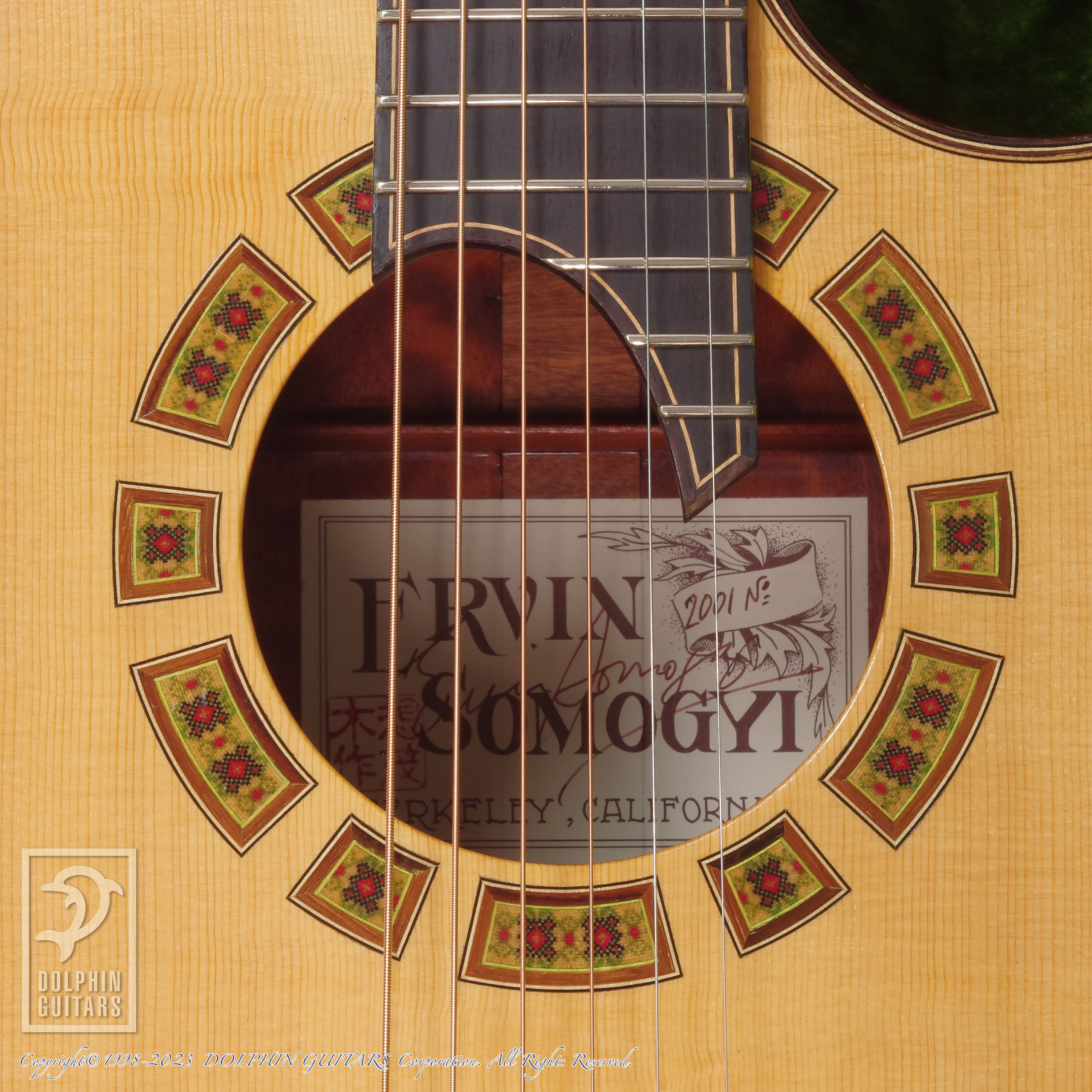 まるで "The Tree"であるかのような鱗状の美しいキルテッドマホガニーや、12Fジョイントにスロッテッドヘッド仕様はソモギ氏の作品の中でも大変珍しい仕様となっており、重厚で迫力あるサウンドはもちろん、倍音豊かなナチュラルリヴァーブ感、ロングサスティーンなど、圧倒的な表現力を持つ個体であります。ブレイシングは様々な構造を持つソモギ氏ですが、本器にはXとファンのハイブリッドと言えるオリジナルのブレイシング構造を採用しております。