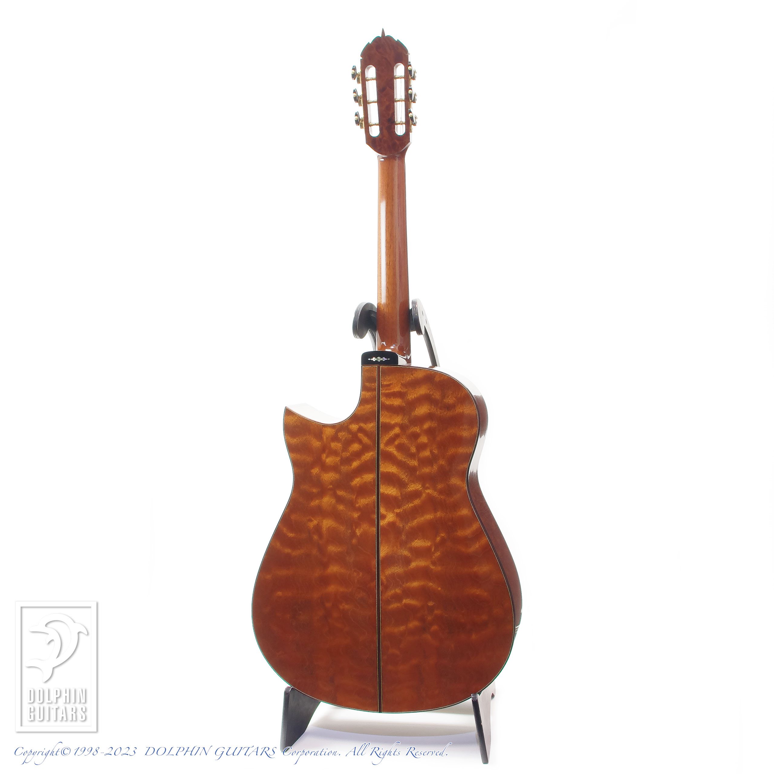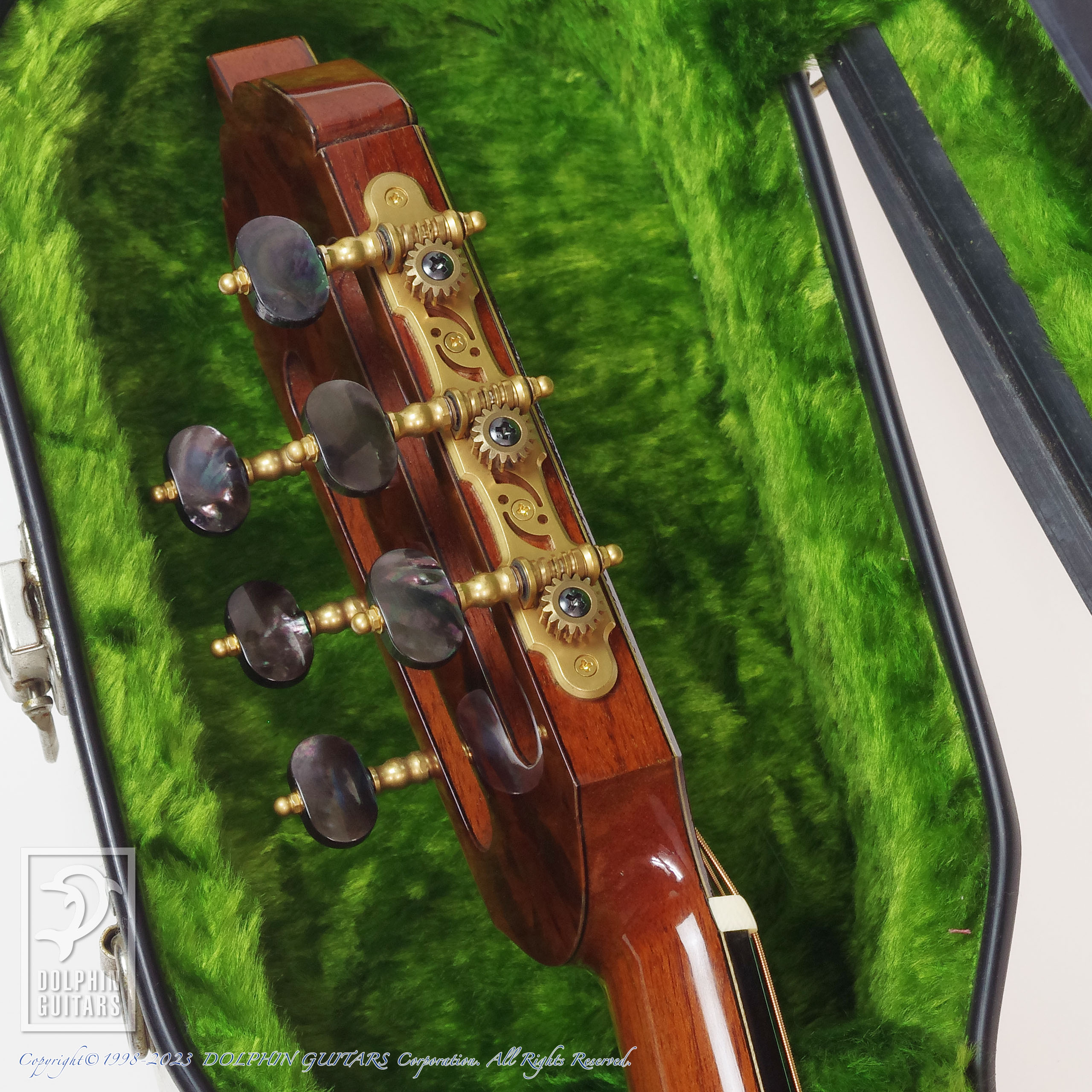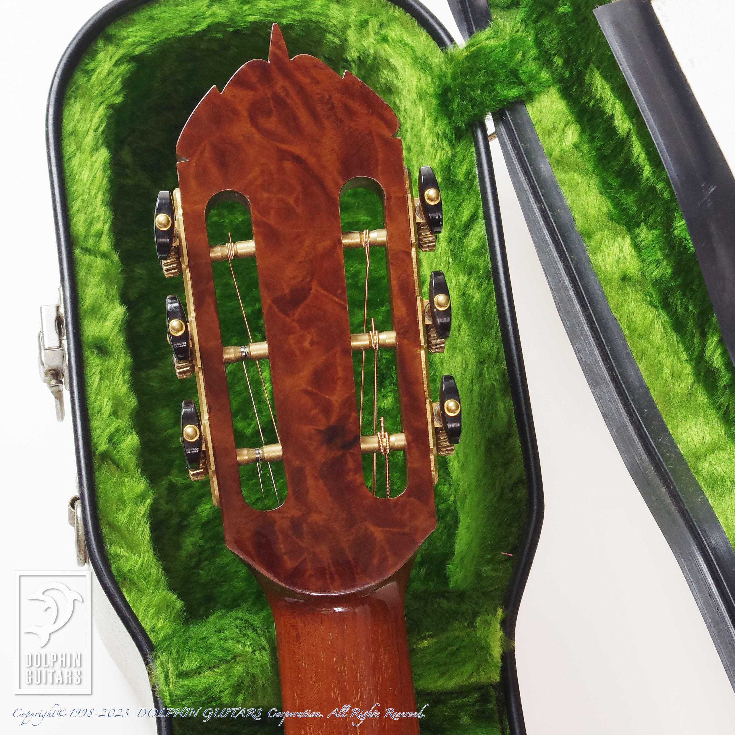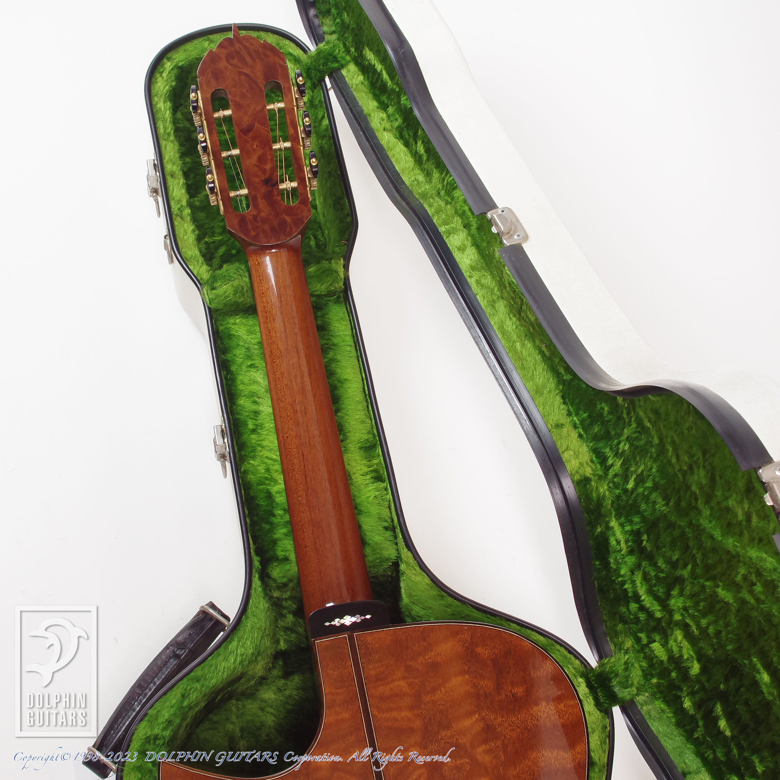 まるで "The Tree"であるかのような鱗状の美しいキルテッドマホガニーや、12Fジョイントにスロッテッドヘッド仕様はソモギ氏の作品の中でも大変珍しい仕様となっており、重厚で迫力あるサウンドはもちろん、倍音豊かなナチュラルリヴァーブ感、ロングサスティーンなど、圧倒的な表現力を持つ個体であります。ブレイシングは様々な構造を持つソモギ氏ですが、本器にはXとファンのハイブリッドと言えるオリジナルのブレイシング構造を採用しております。