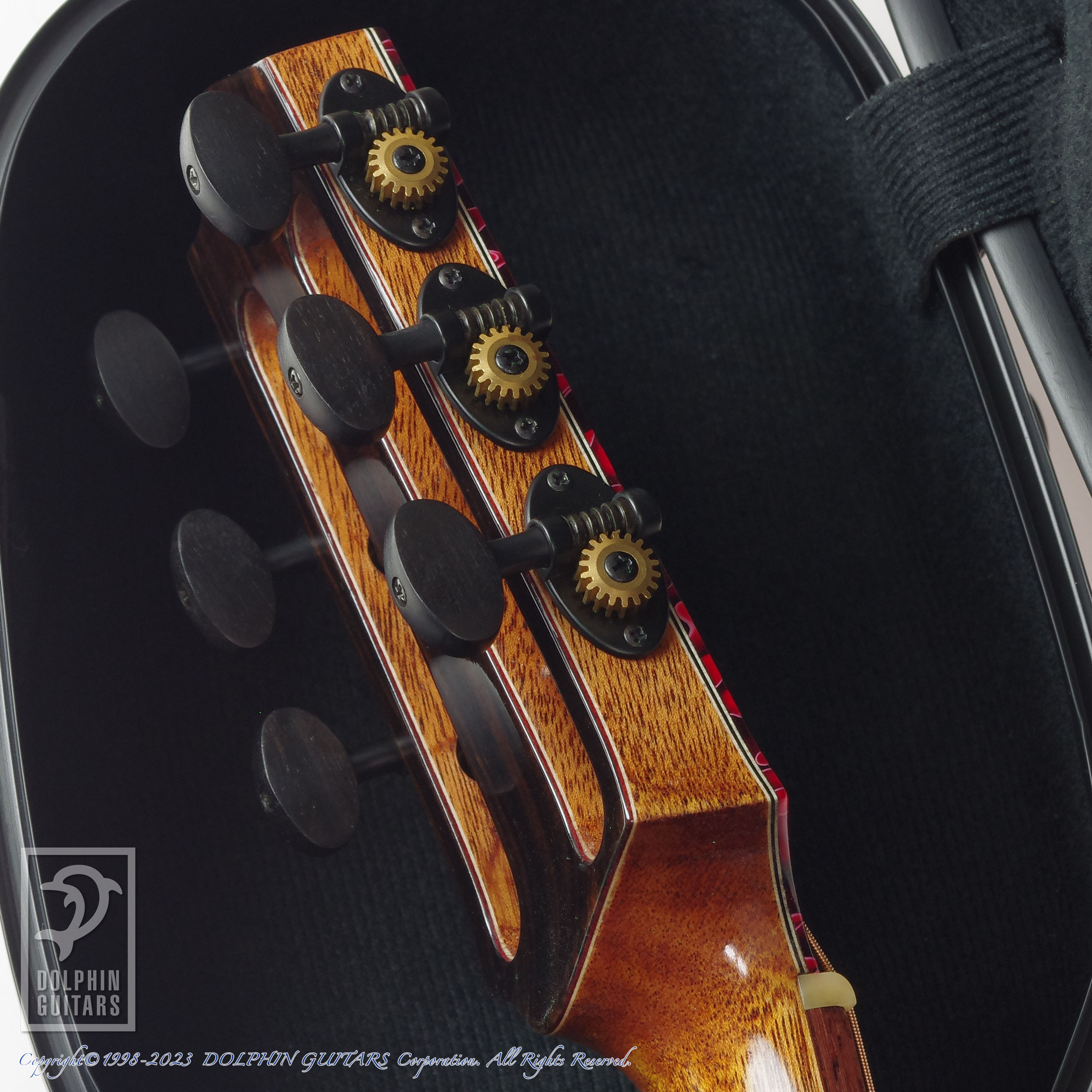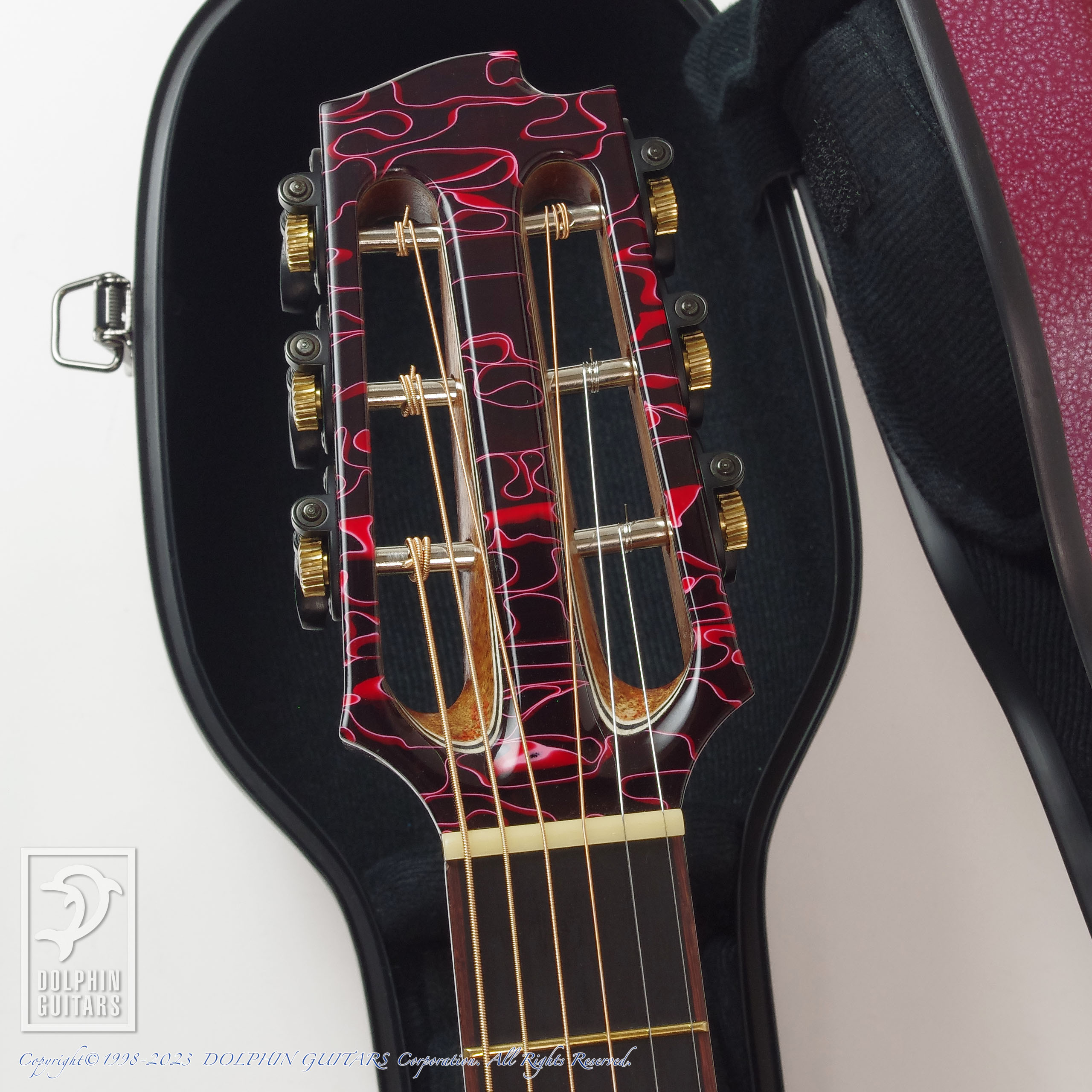 ヘッドプレートやロゼッタ、指板エンド、ヒールキャップにはレジンを使用し、オリジナリティ溢れるデザインに仕上げております。フレットはEVOゴールドを使用。ニッケルシルバーフレットよりも程よい硬質感がプラスされたトーンとなっております。