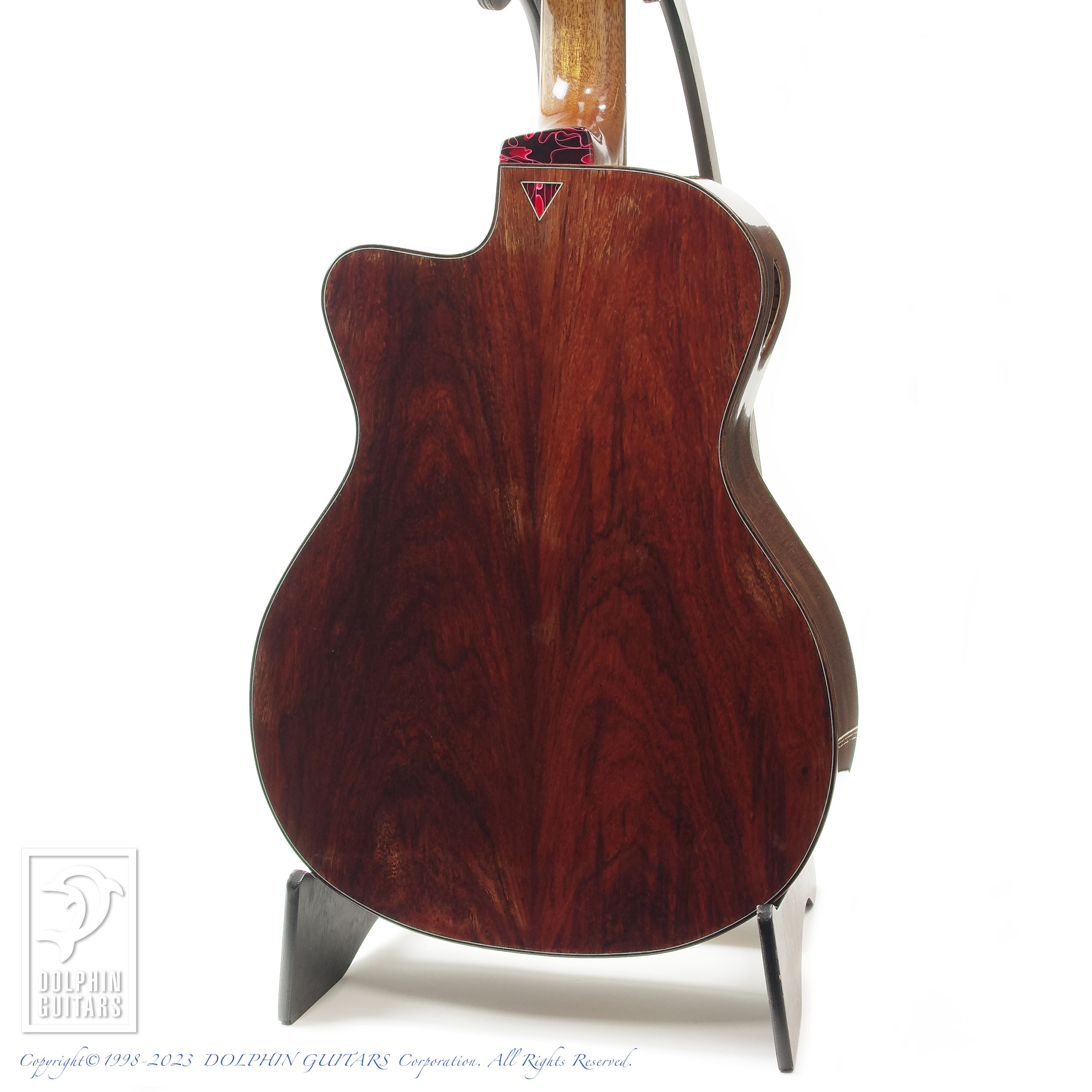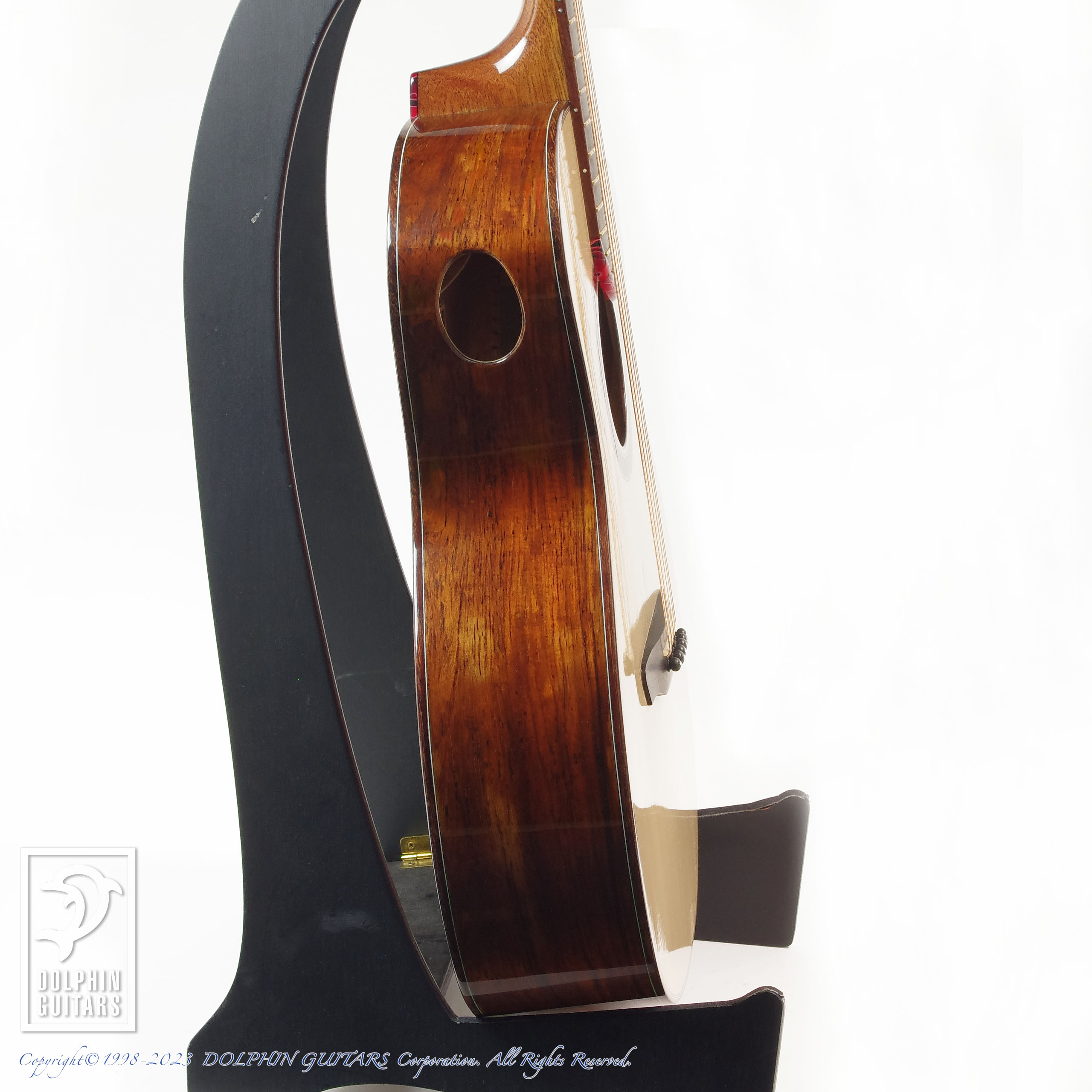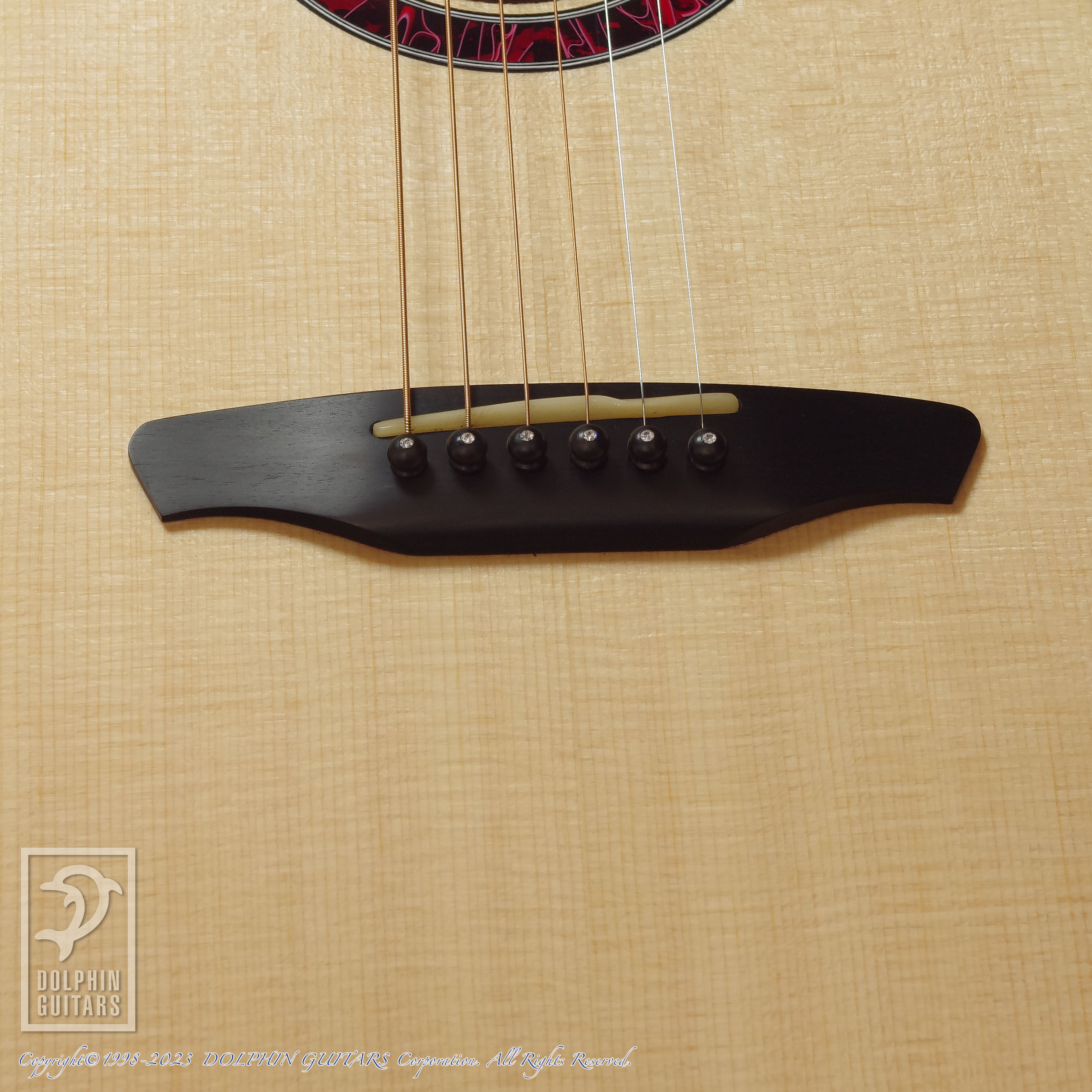 ボディサイズはオーソドックスな14Fジョイント ダブルオー。カッタウェイデザインやボディラインの美しいシェイプです。ボディは約100mmとやや薄胴になっていることで抱えた際のコンパクトさも感じるでしょう。