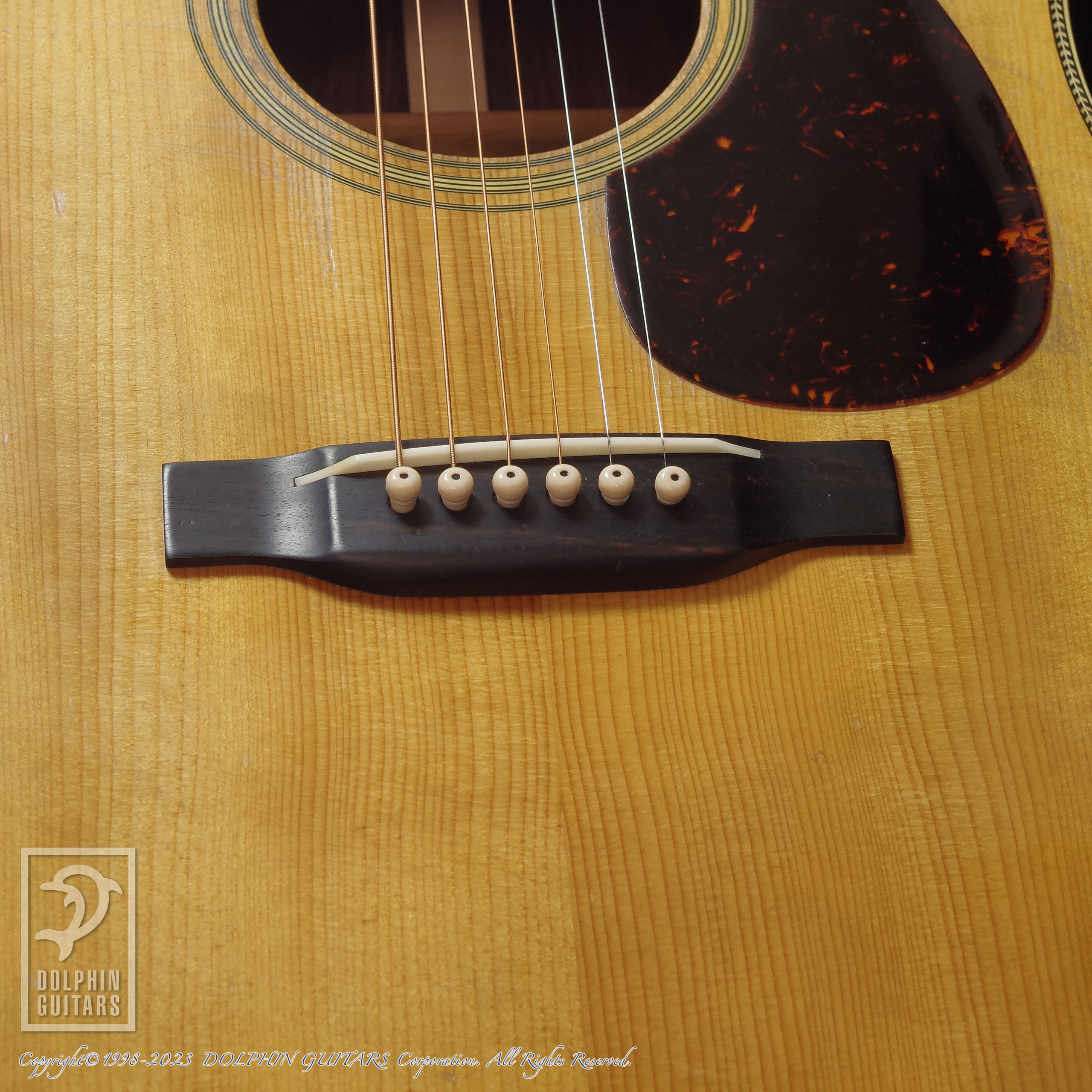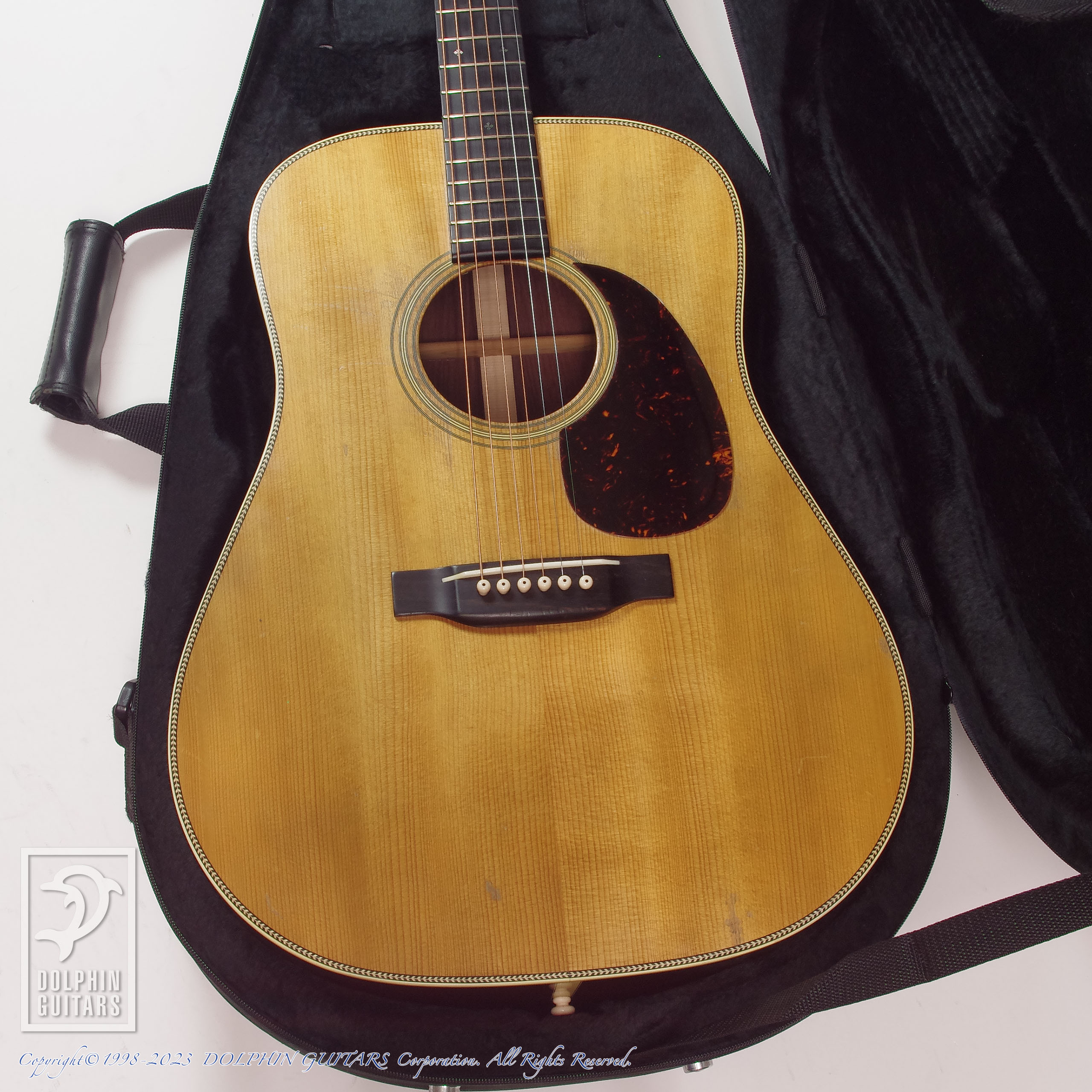 1940年D-28を再現したモデル。ダイアモンドスクエアインレイを施した指板に、ロングサドル、ヘリンボーンをあしらったパーフリング、ジグザグ・バックストリップ、エイジド加工も相まって、ヴィンテージのような堂々のルックスです。さらに、ヴィンテージ仕様の追求は見た目のみにとどまらず、ギター内部やサウンドにも渡ります。サウンドを大きく左右するブレイシングはリアシフト・スキャロップドXブレイシングを採用し、トップ材とブレイシング材にはトリファイド加工が施されており、ヴィンテージのようなルックスに、ど迫力なサウンドを聴かせる絶品サウンドの個体です。