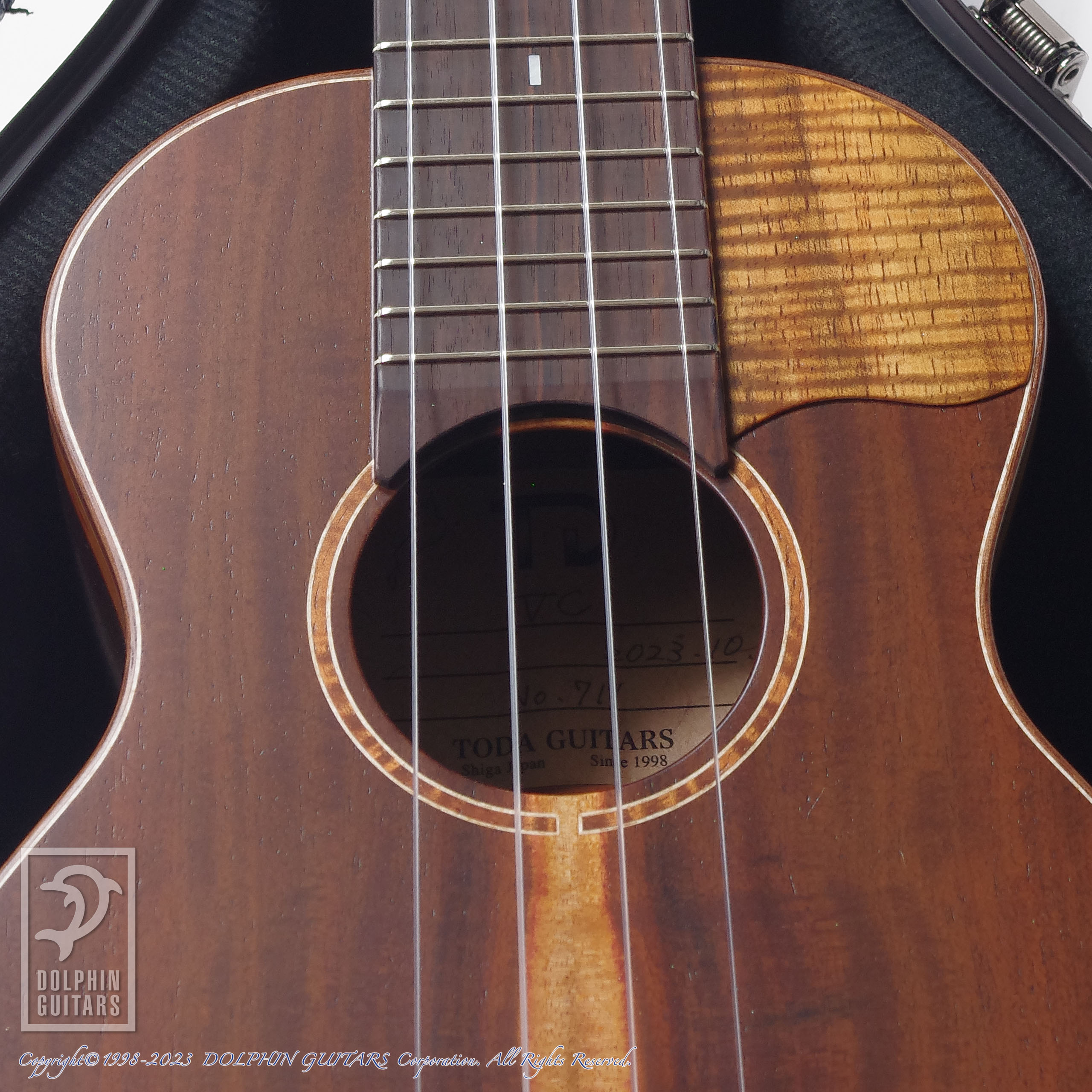 弦高は4弦12F上 2.6mm / 1弦2.4mmのセッティング。サドル高さもかなり余裕があり、理想的なネックアングルであります。低めの弦高セッティングをご希望の方は調整後にお渡しいたしますのでご注文時にお申し付けください。弦はトダギターズ オリジナルウクレレ弦を使用。