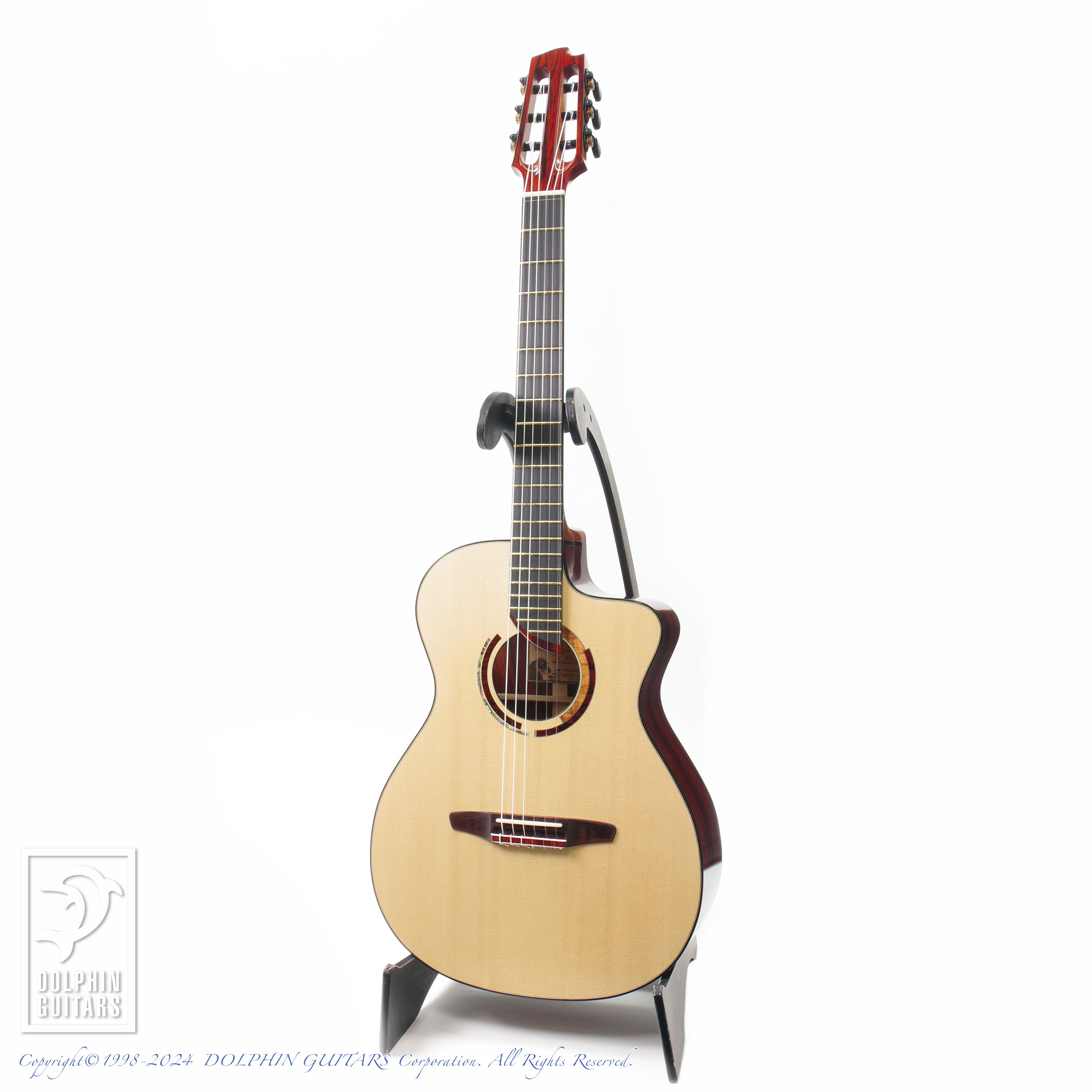 薄ボディならではの抱えやすさ、高いポジションでのコードワークを容易に行える操作性、クラシックギターとしては細めの45mmナット幅、14Fジョイント構造などなど、現代的な仕様を備えておりエレキギター、アコースティックギターからの持ち替えもスムーズなジャズナイロンモデル。