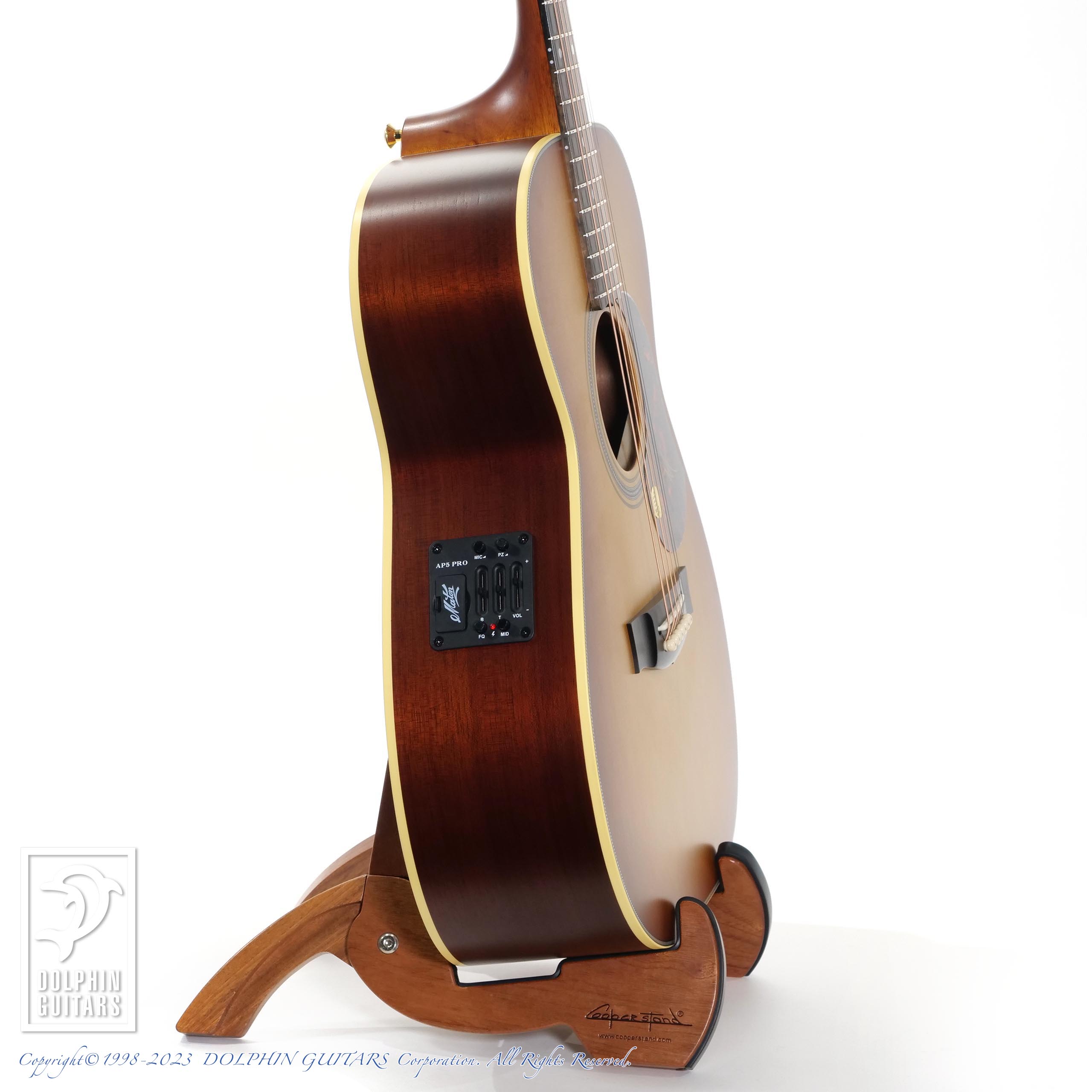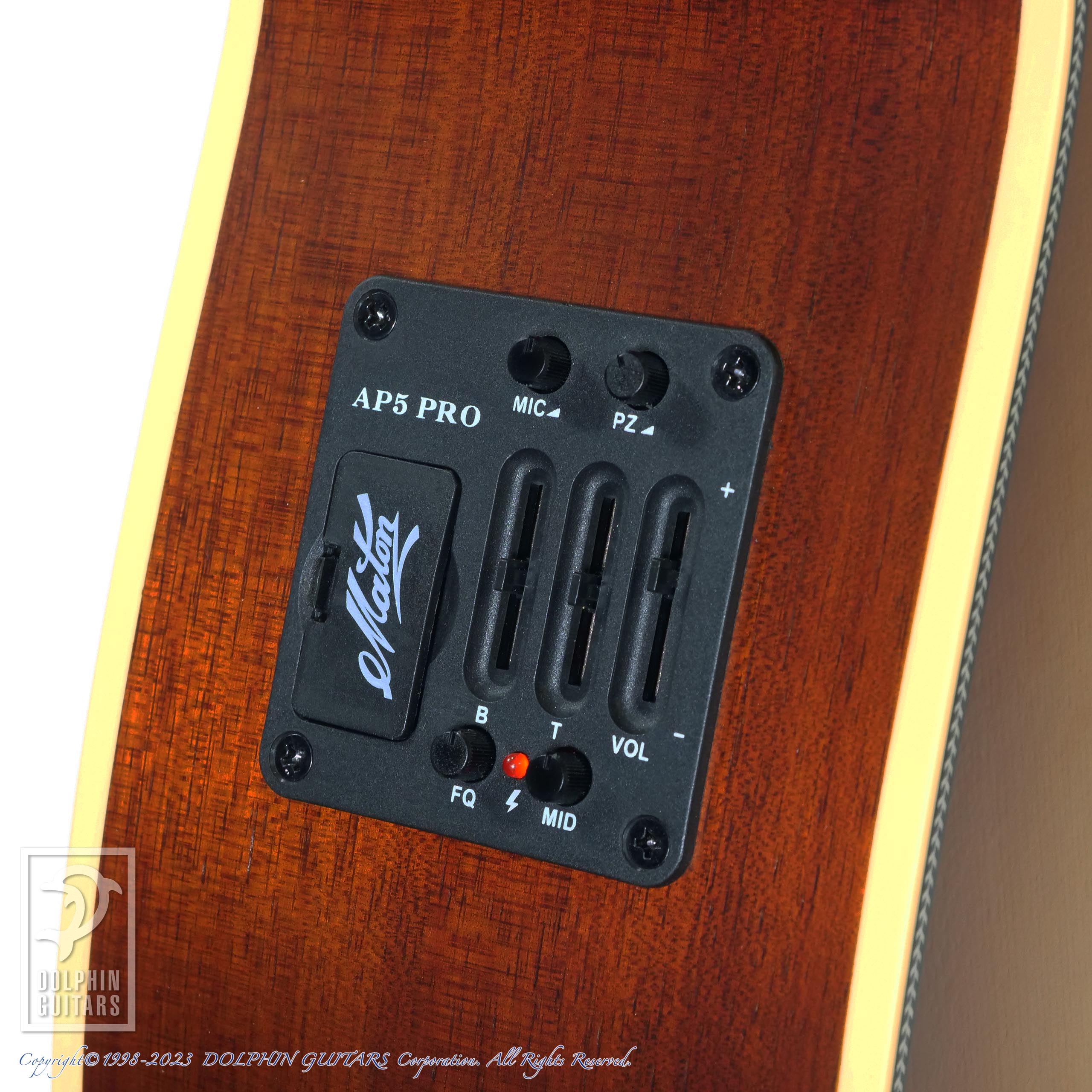 搭載されたAP5-Proピックアップ・システムは、クリアで透明感のあるマイクサウンドと力強いピエゾの存在感でどんな現場でもナチュラルなアコースティックサウンドをアウトプットできます。また、マスターボリュームに加え、マイクボリュームとピエゾボリュームも装備しているため、バランス調整もより精細に、よりスムーズに行うことが可能。まさにプロフェッショナル仕様の一本です。