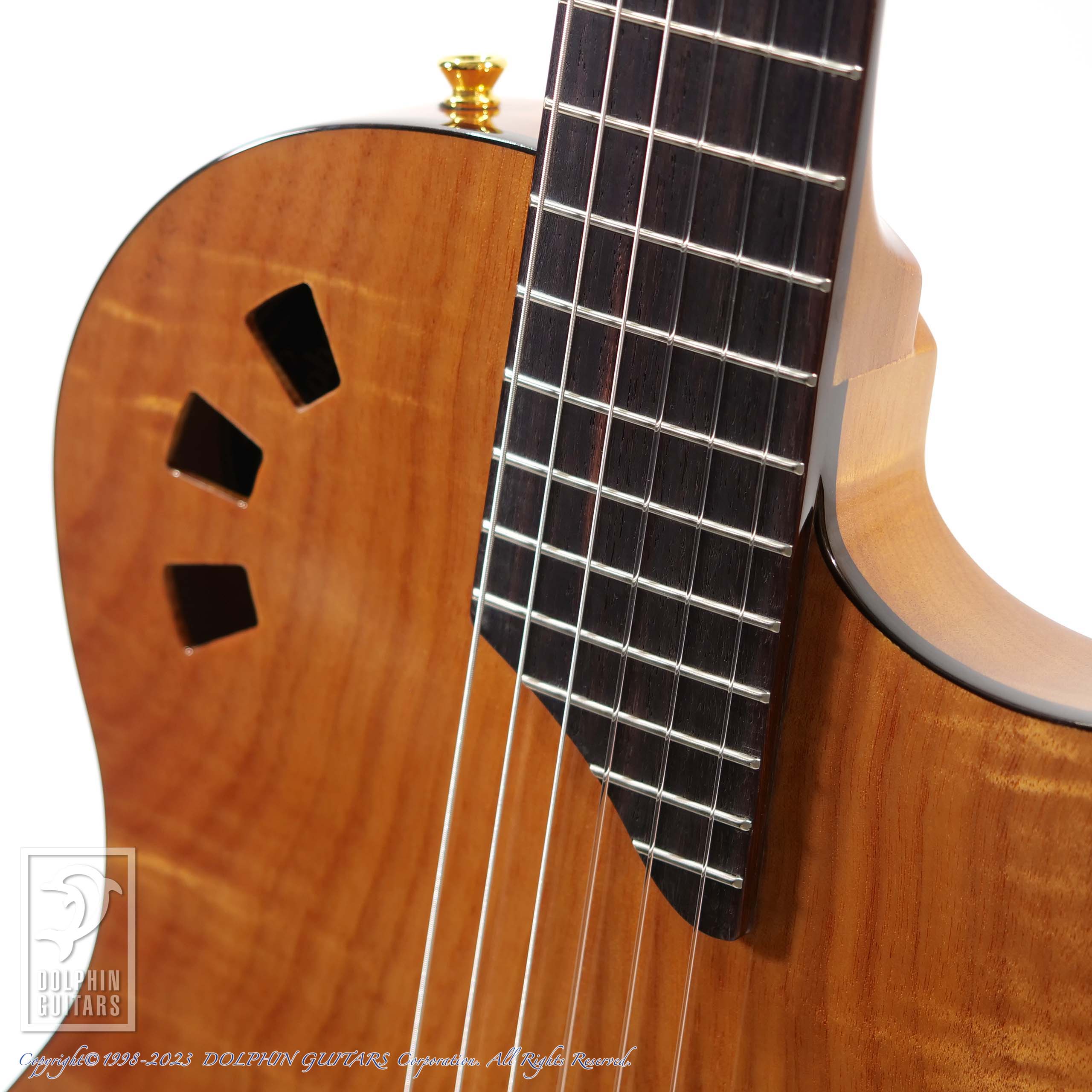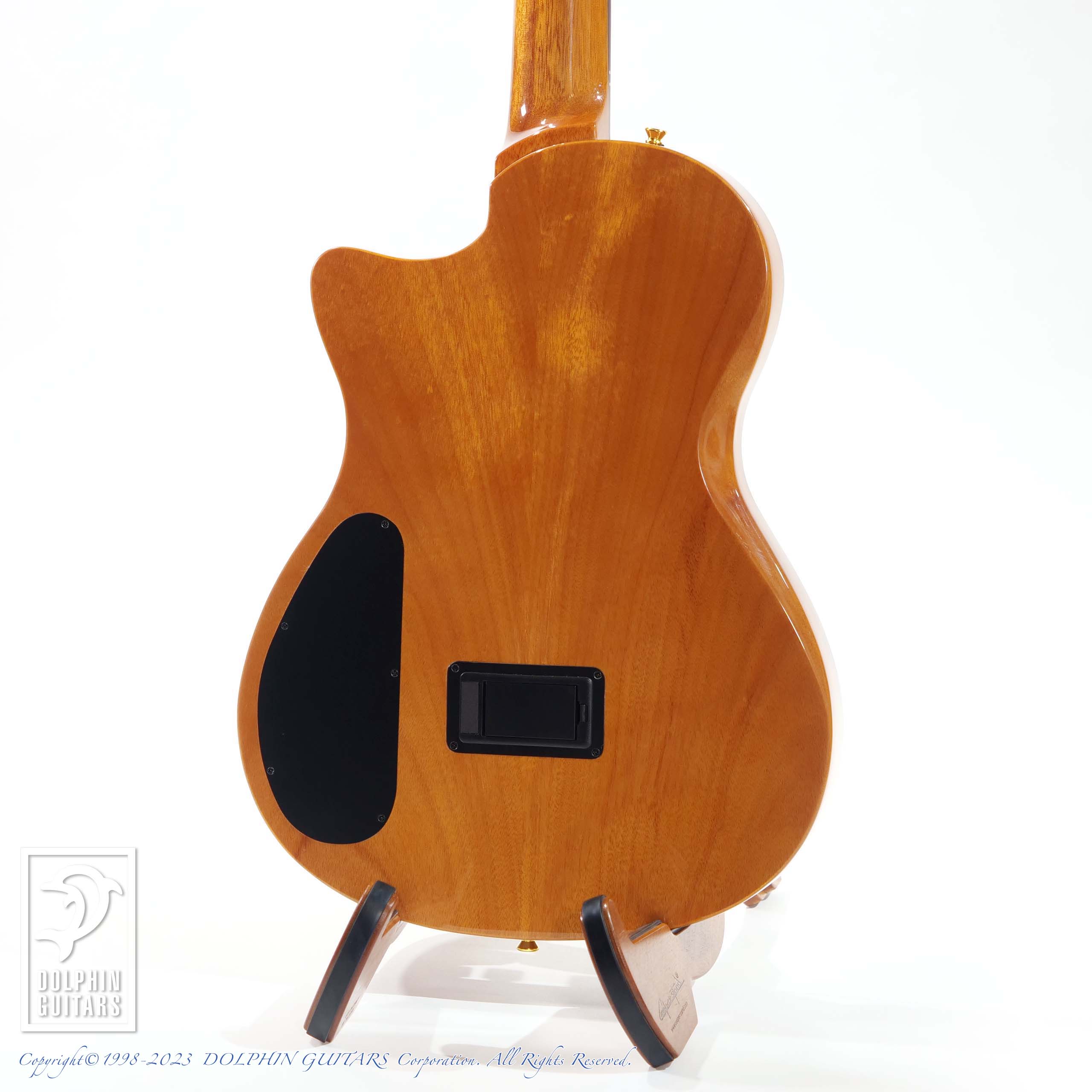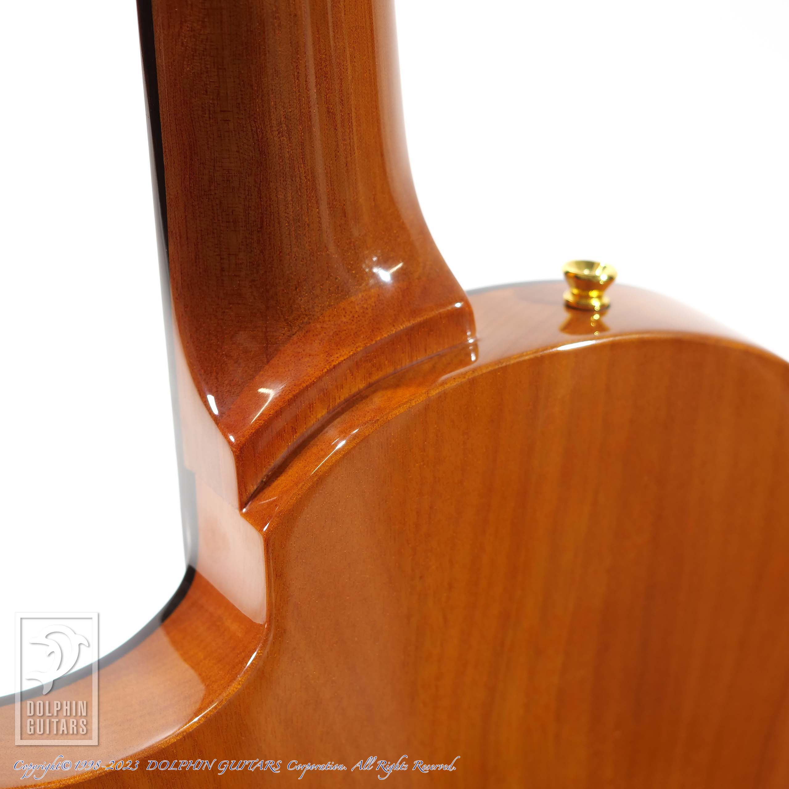 単板のスプルースに薄いフレームメイプルを貼り付けたトップとマホガニー削り出しボディの組み合わせは、ルックスと豊かなサウンドを両立させています。