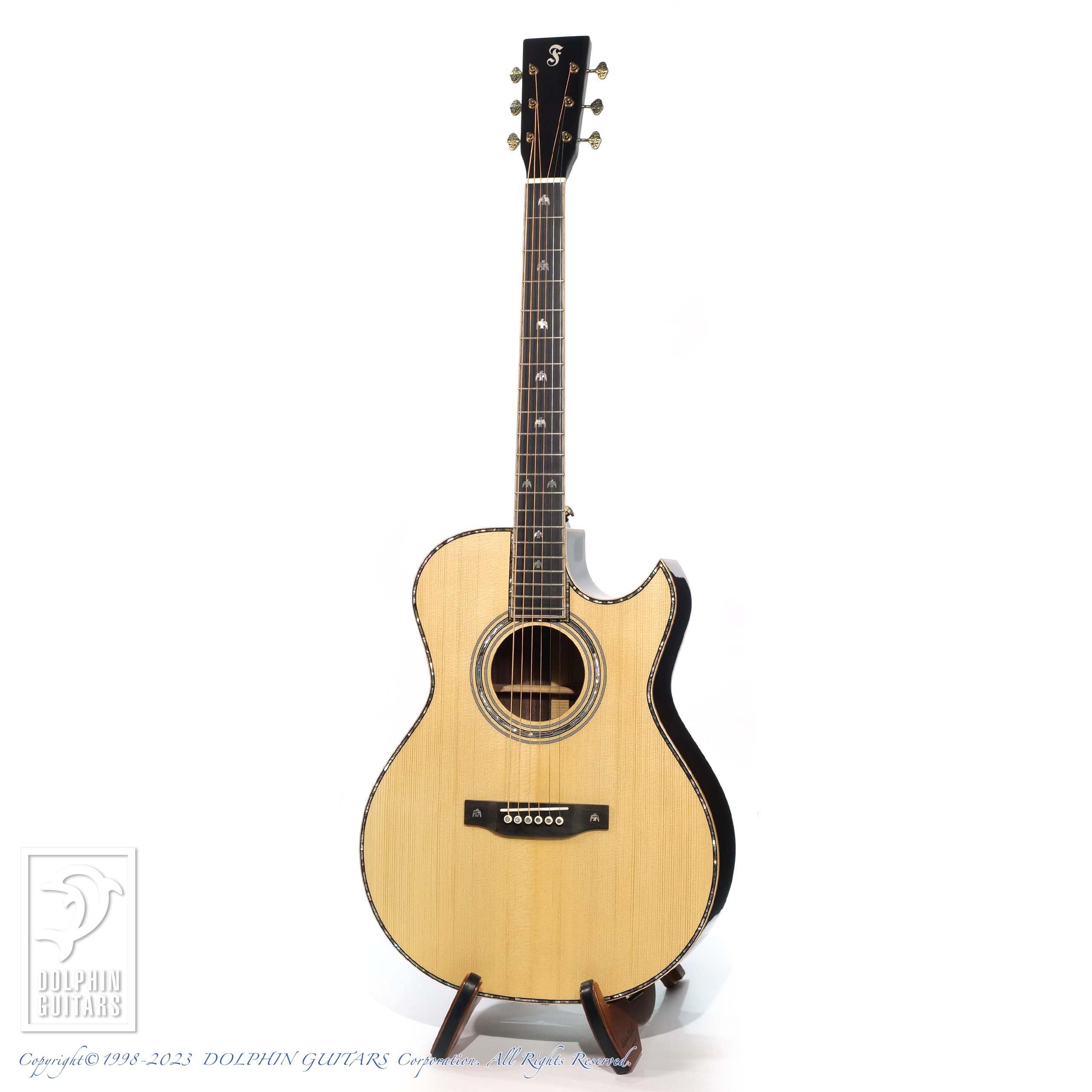 本器はALL SOLIDシリーズ、正にオルソン氏の設計・意匠が見受けられるプレミアムスモールジャンボモデル、 V33S SJ FC(Florentine Cutaway)