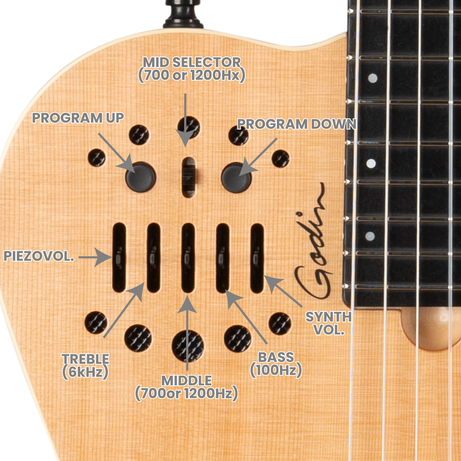 | Controls | PIEZO VOL., SYNTH VOL., TREBLE (6kHz), MIDDLE (700 or 1200Hz), MID SELECTOR (700 or 1200Hz), BASS (100Hz), PROGRAM UP, PROGRAM DOWN, |