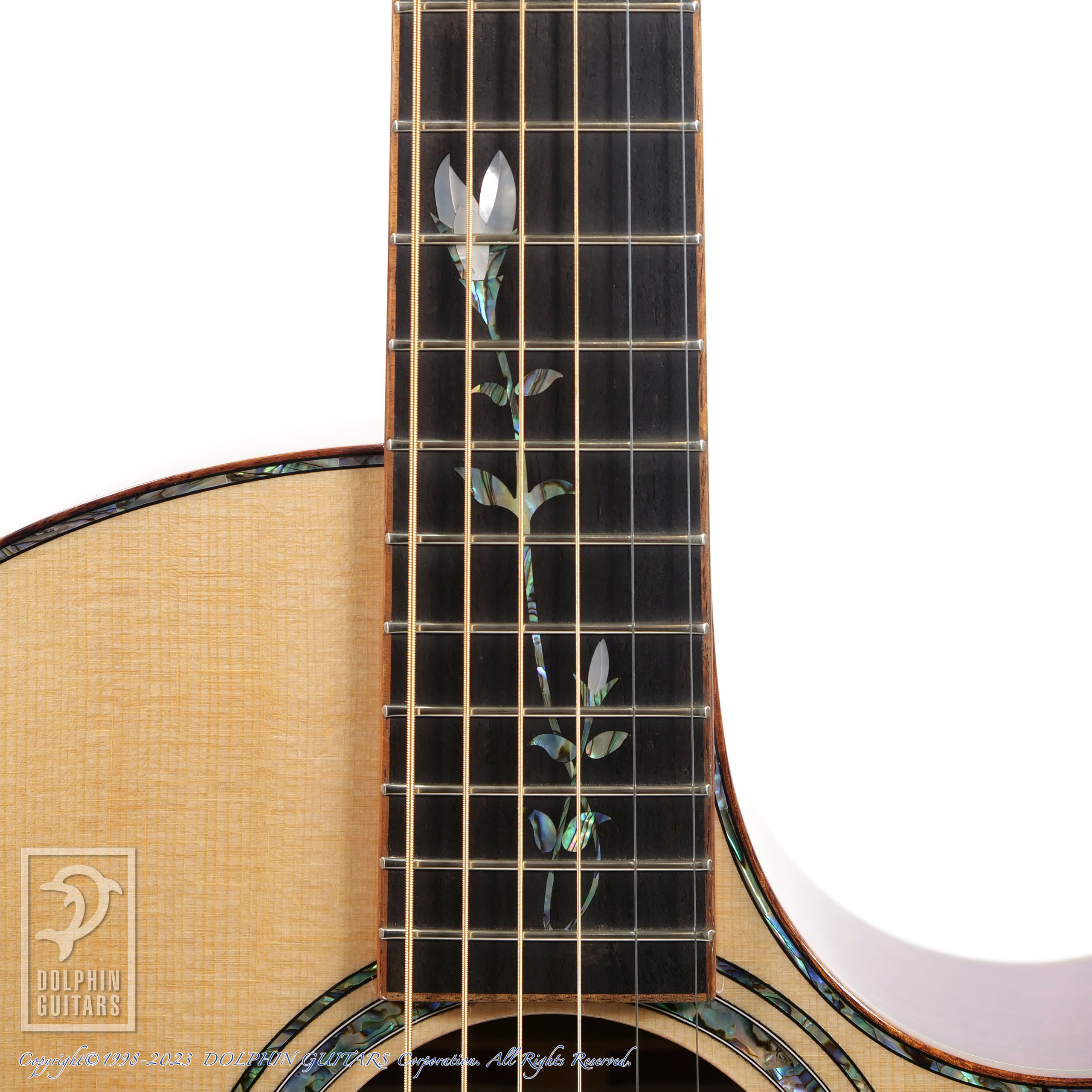 最高級のエボニーフィンガーボードにはリンドゥをモチーフにした美しいインレイ。ボディトリムやロゼッタには美しいアバロンシェルの飾りが光ります。