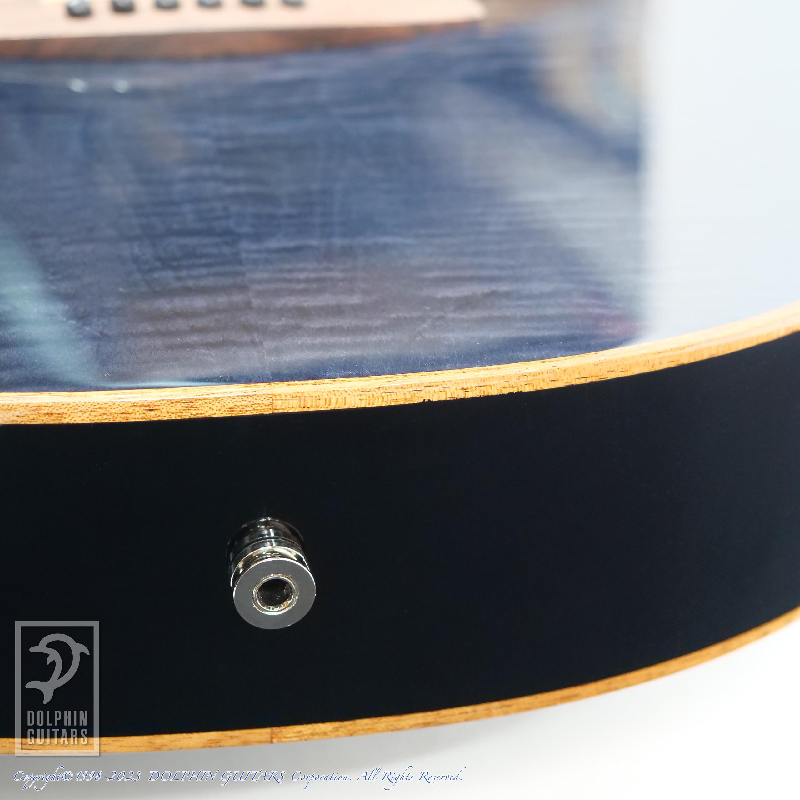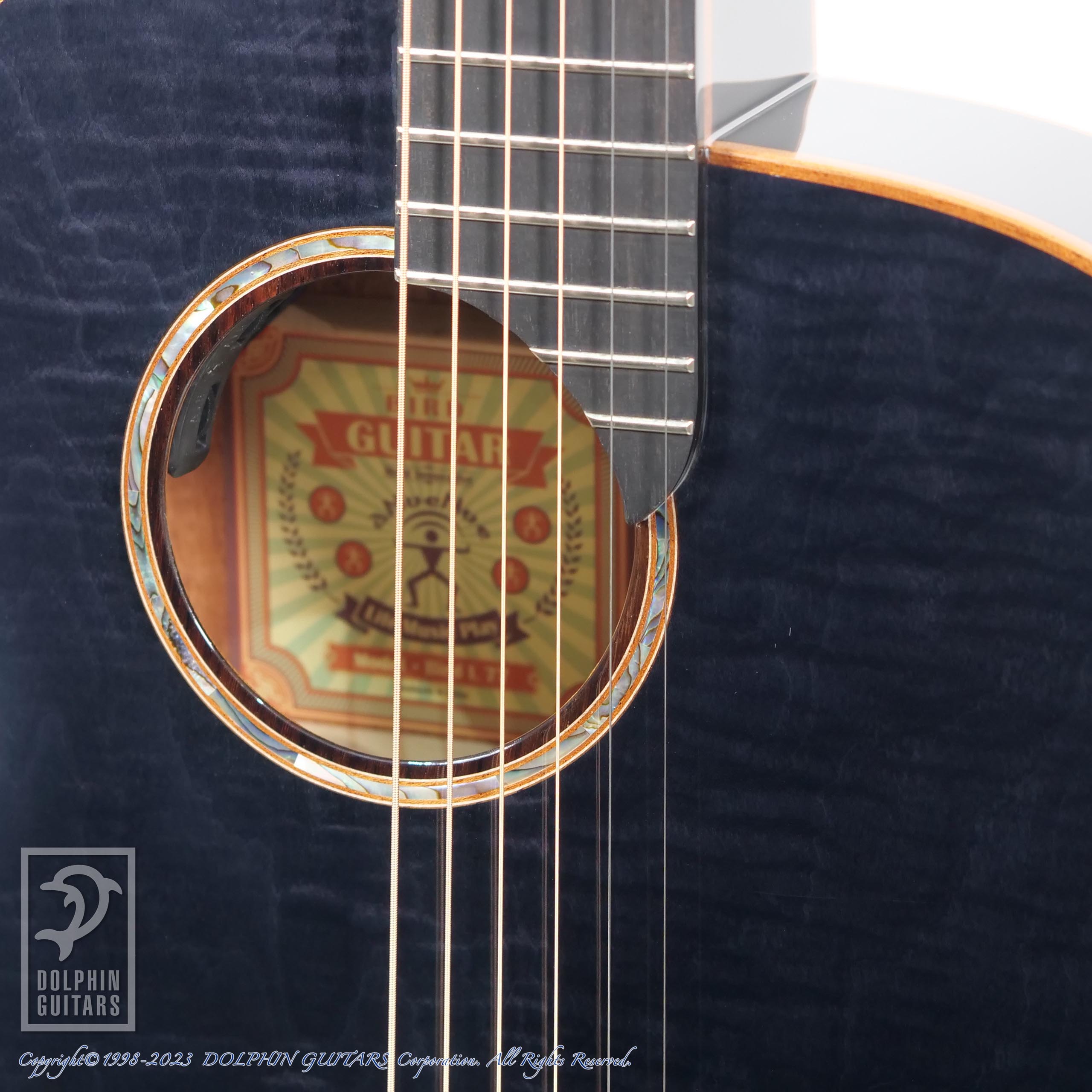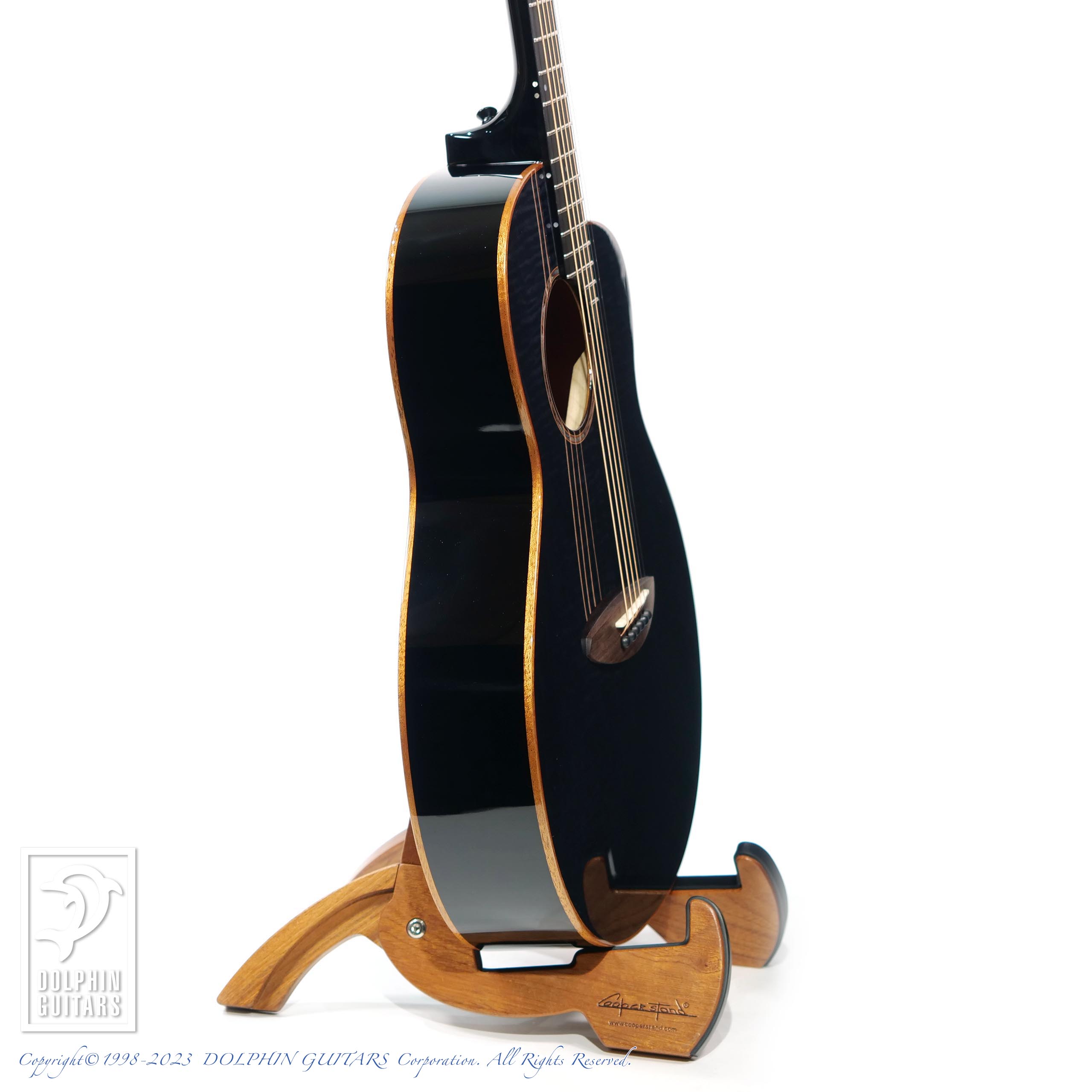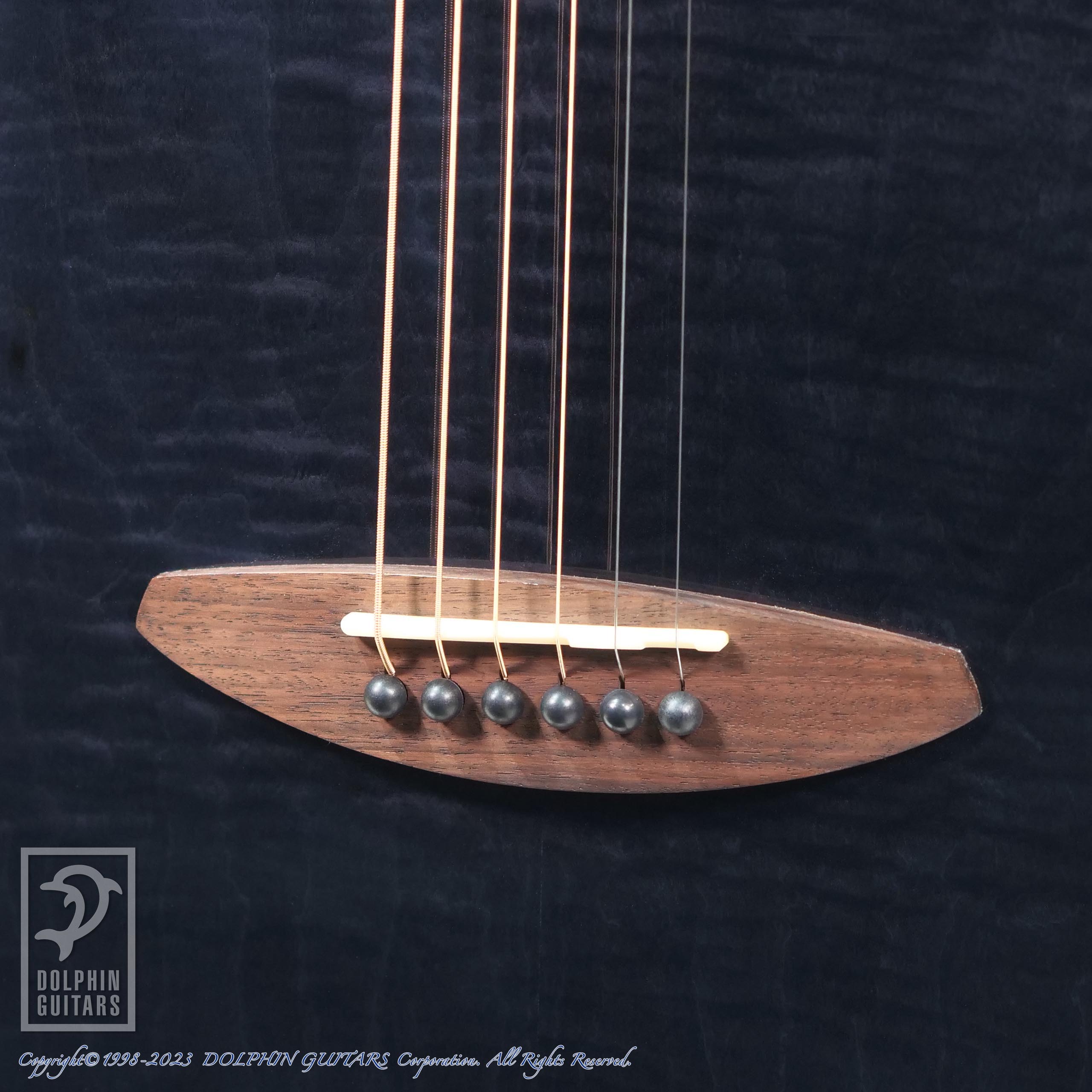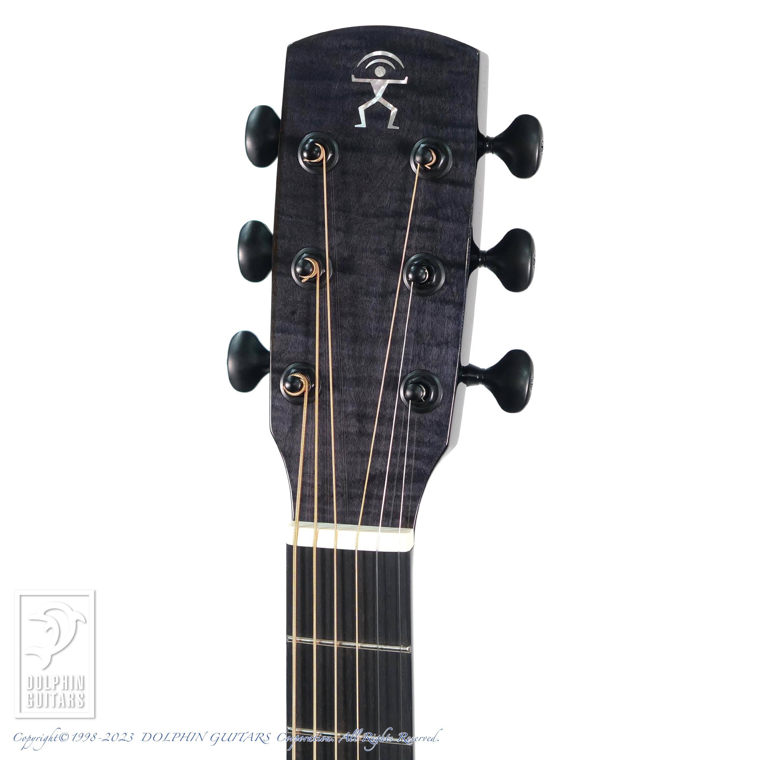 カーリーメイプルをセダー材の表面に配した美しいギター。シースルーブラック塗装により、杢目が浮かび上がるような幻想的な印象を与えます。サイド&バックはほのかにラメが輝く凝った仕様です。