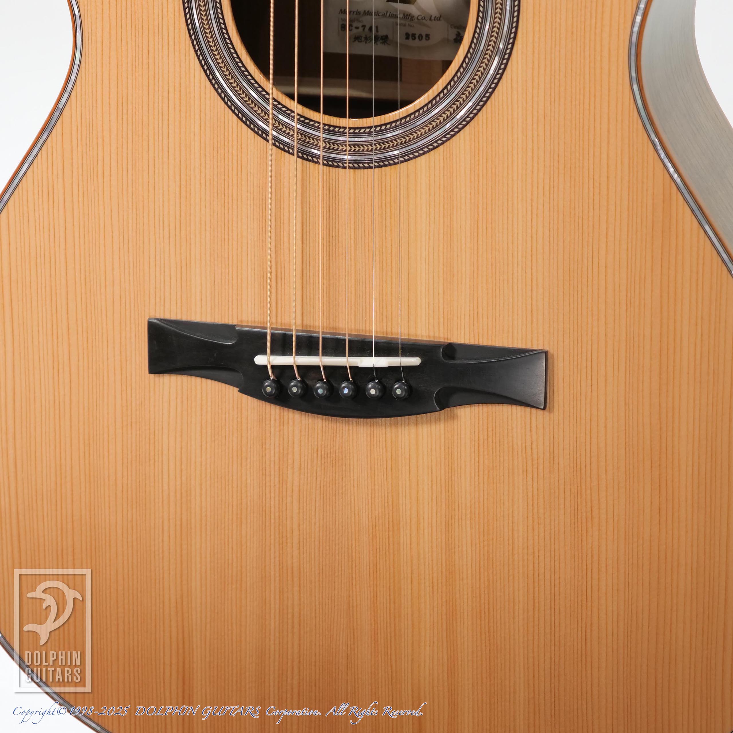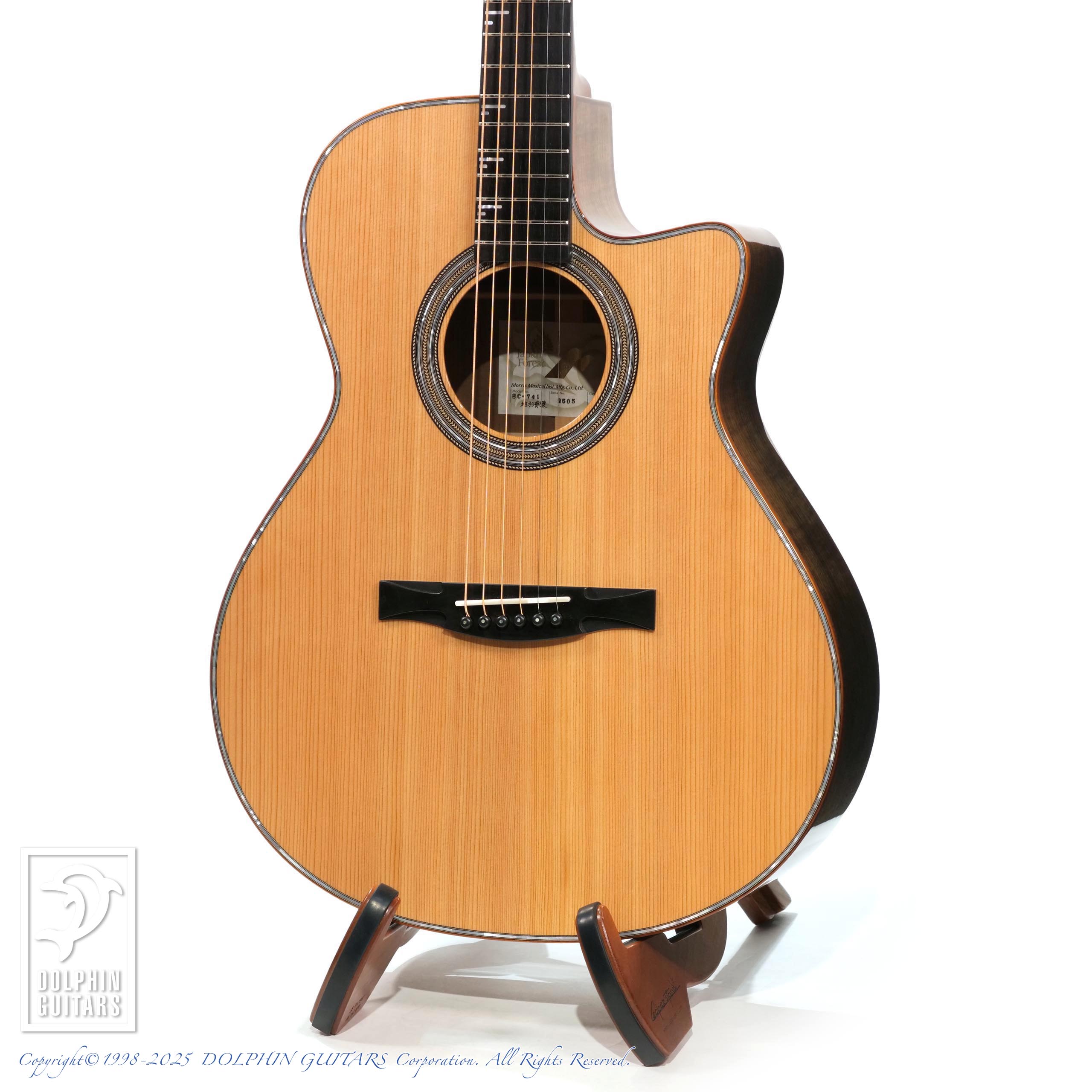 幅広いラインナップを持つMORRISですが、本器は日本の職人が日本の木材を使用し、日本をテーマに作品化することをコンセプトとした新たなシリーズ、"Japan Forest Series"。本器は、そのシリーズの中でも最高峰に位置し、ルシアー森中 巧(もりなか たくみ)氏が全て一人で製作し、宮崎県産の素材をボディに用いたシンボディモデル SC-741 地杉黄檗。