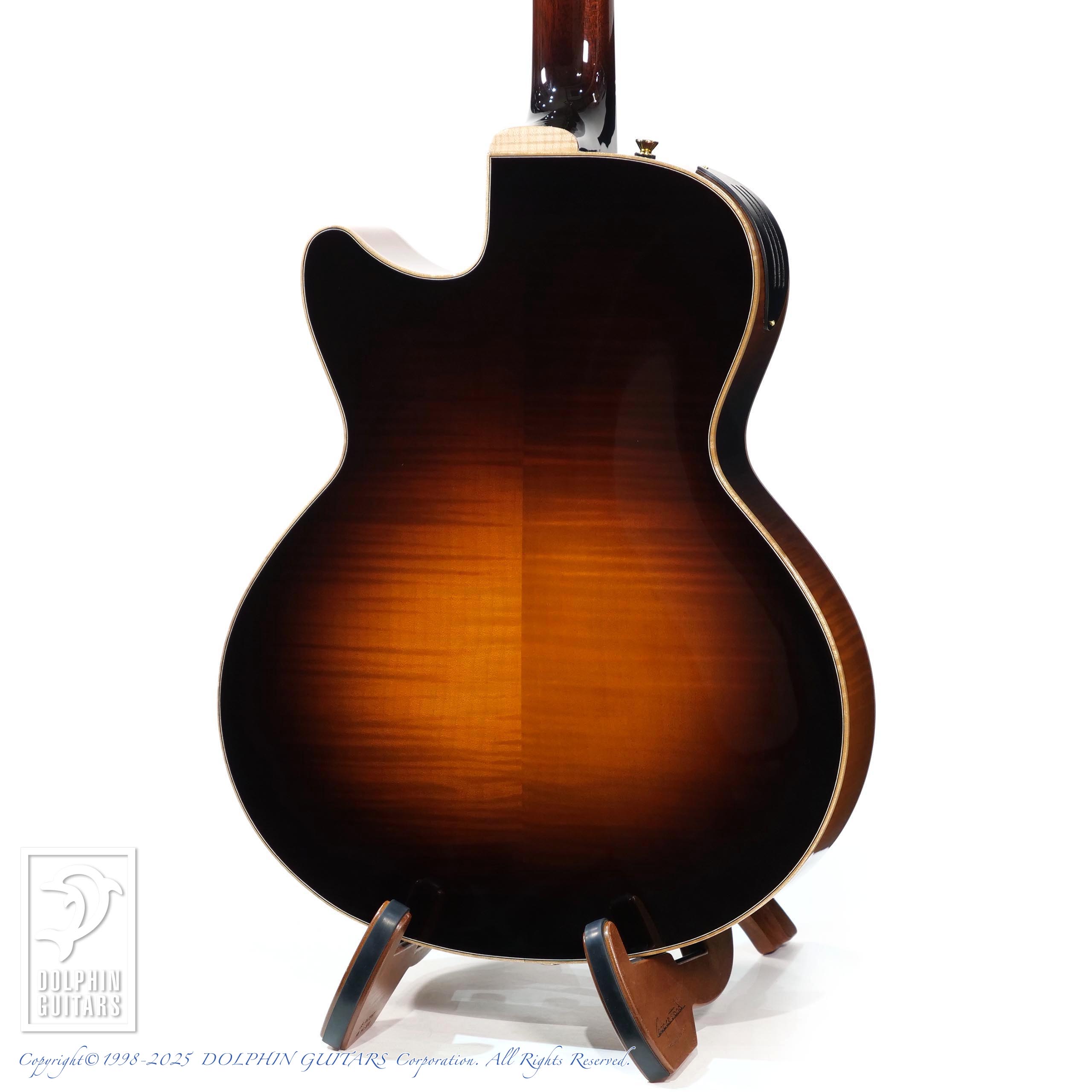 ボディやFホールのバインディングにも使われている、フレイムメイプルの美しい杢目が高級感を演出しております。