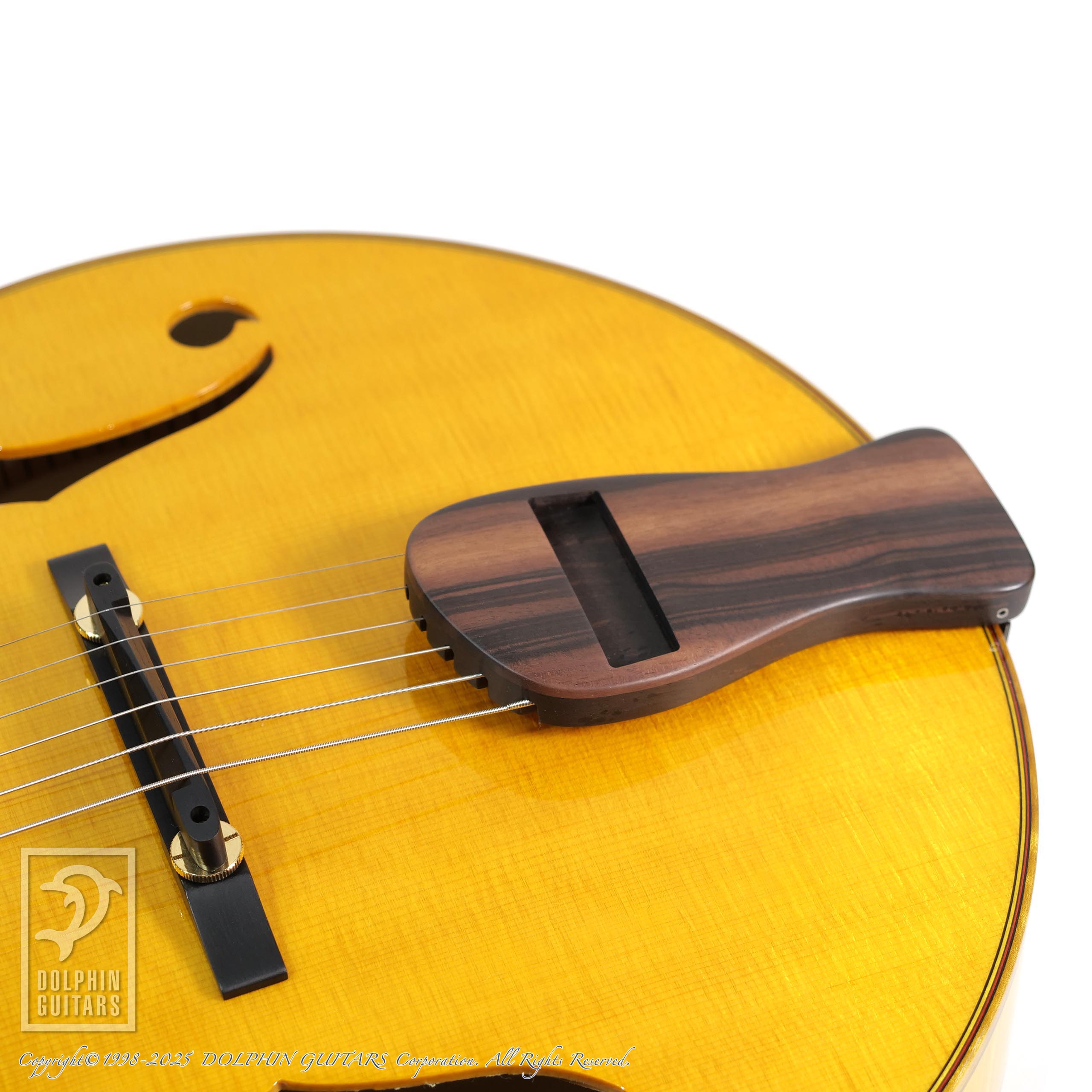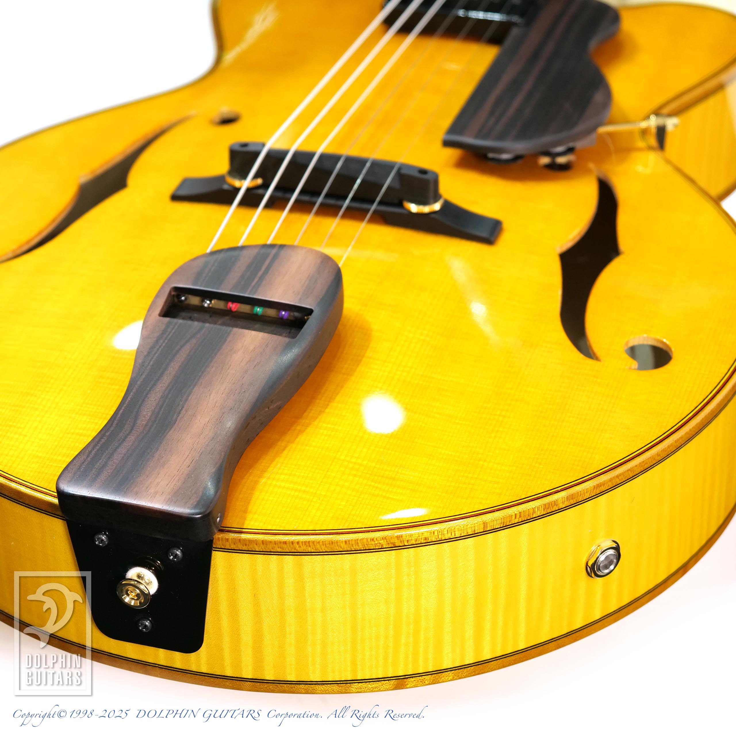 ピックアップはオーソドックスなフロント1ハムバッカーのスタイル。甘さの中に程よく芯があるサウンドは、ジャズはもちろん、弾き語りで使用しても面白いかも知れません。薄いボディ厚は取り回しが良いだけでなく、アンプで鳴らす際のハウリング対策としても優位性を誇ります。
