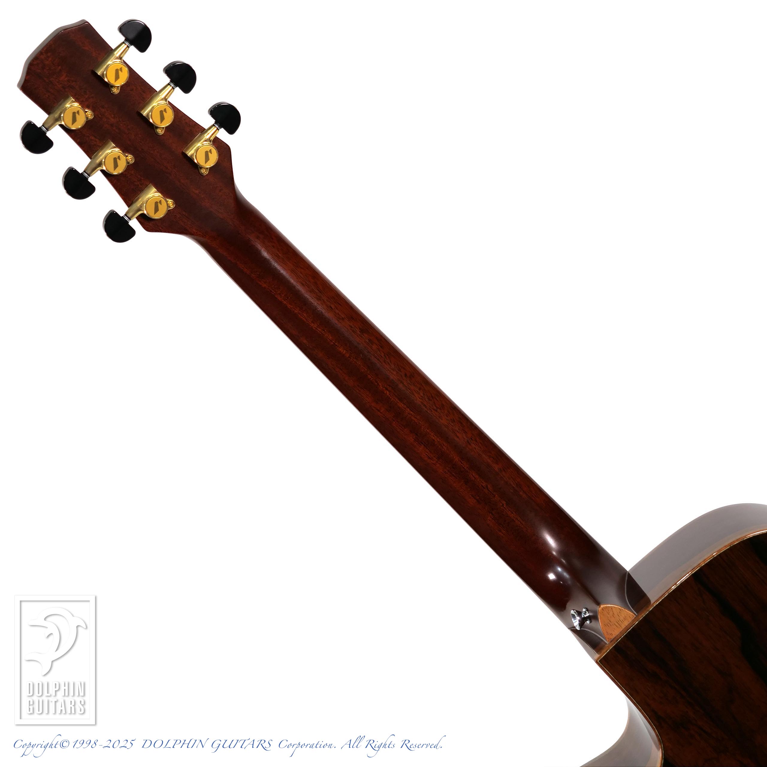 イングルマンスプルース特有の柔らかなレスポンスに、ハカランダ合板の煌びやかな高域と芯のある低域が加わり、バランスの取れた豊かな鳴りを提供します。ネックは44 mmナット幅の薄めのプロファイルで、ロングスケール(約652 mm)ながら運指しやすく、フィンガースタイルからストロークまで幅広く対応します。
