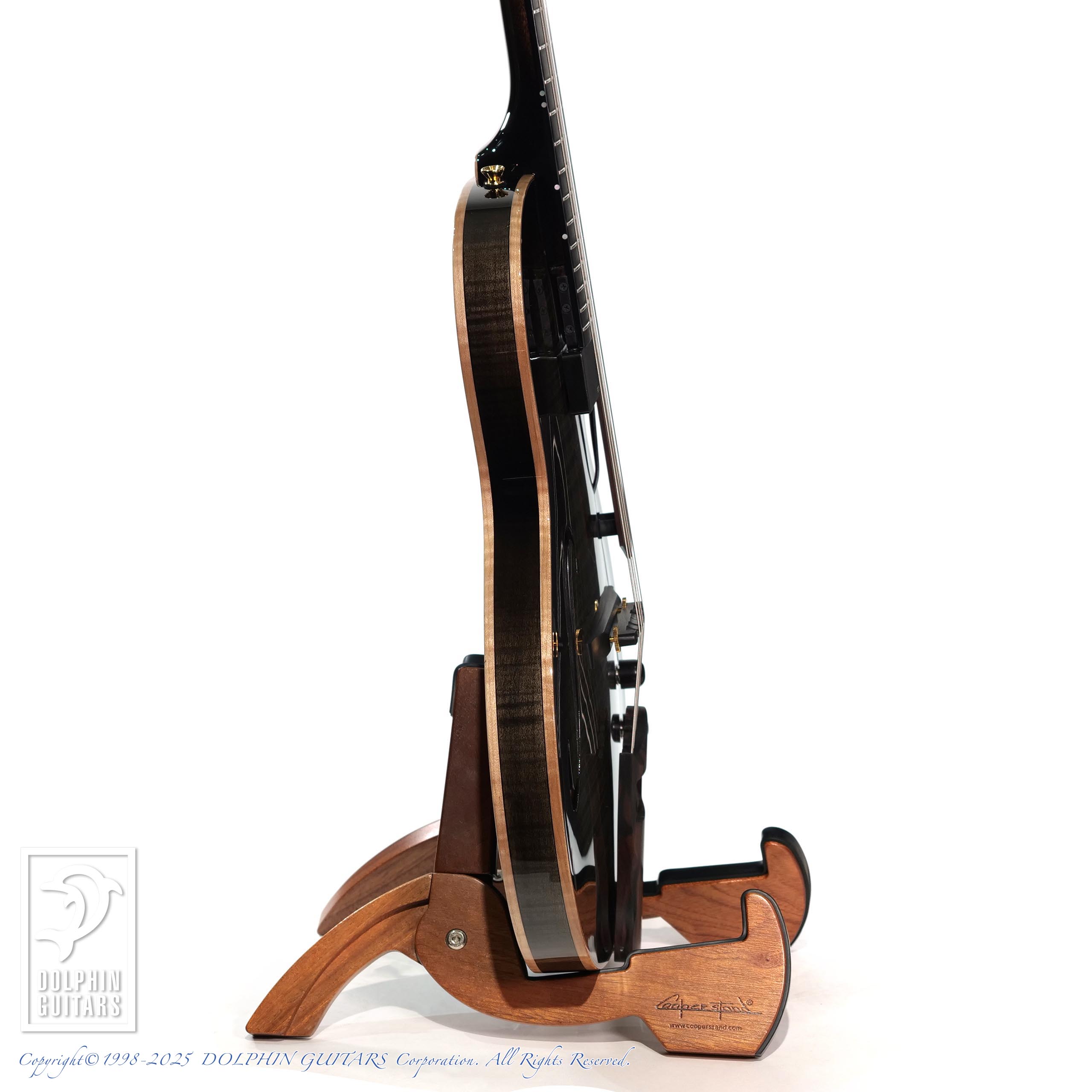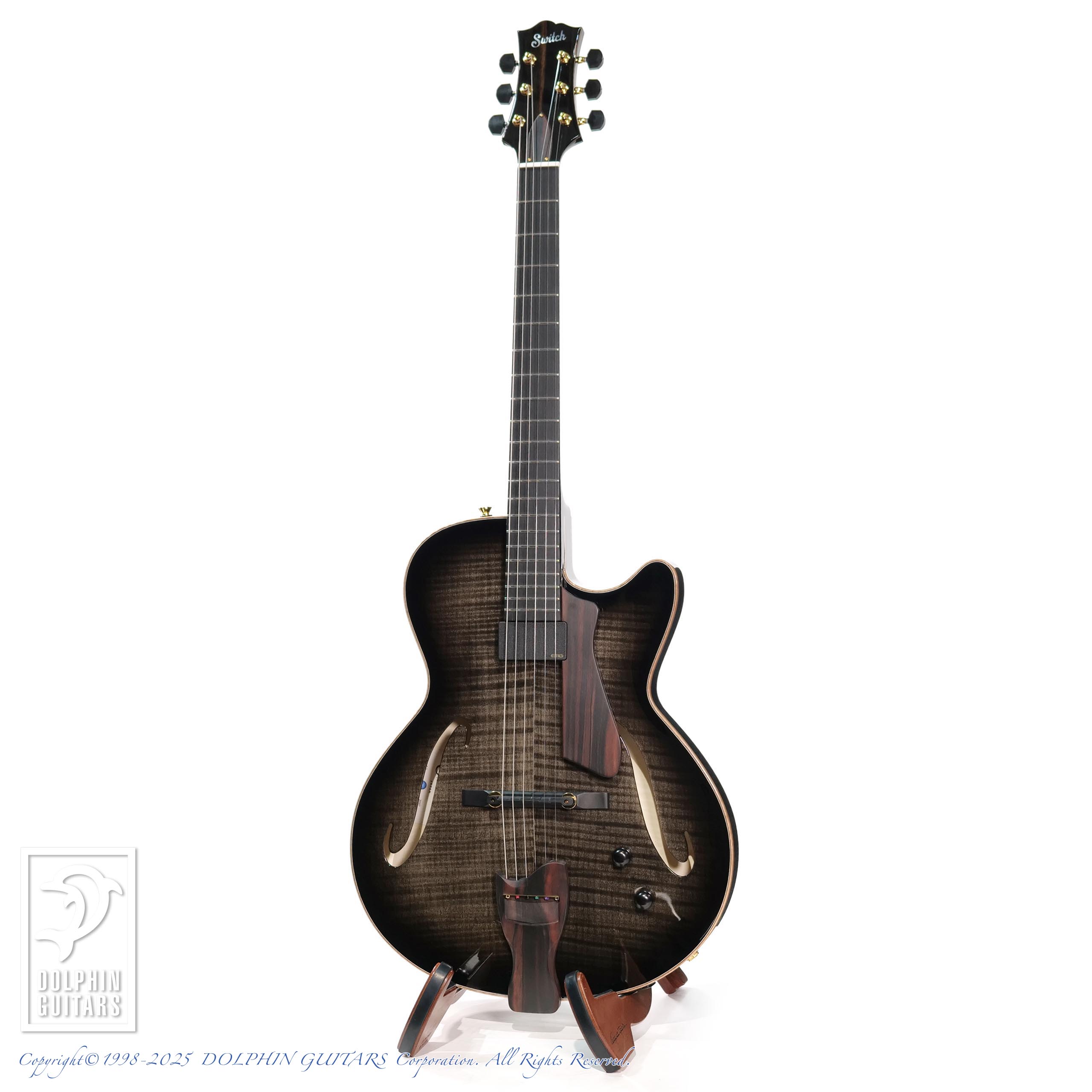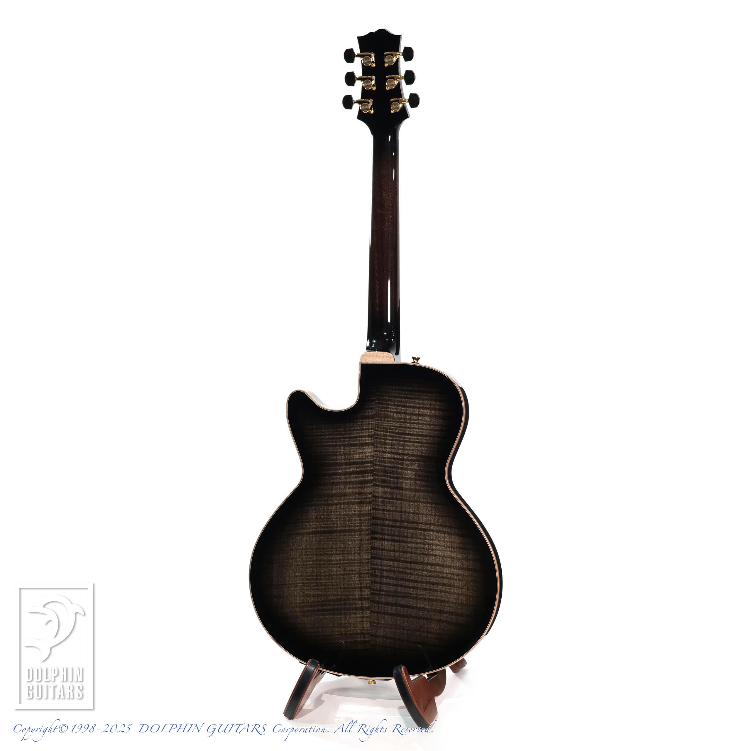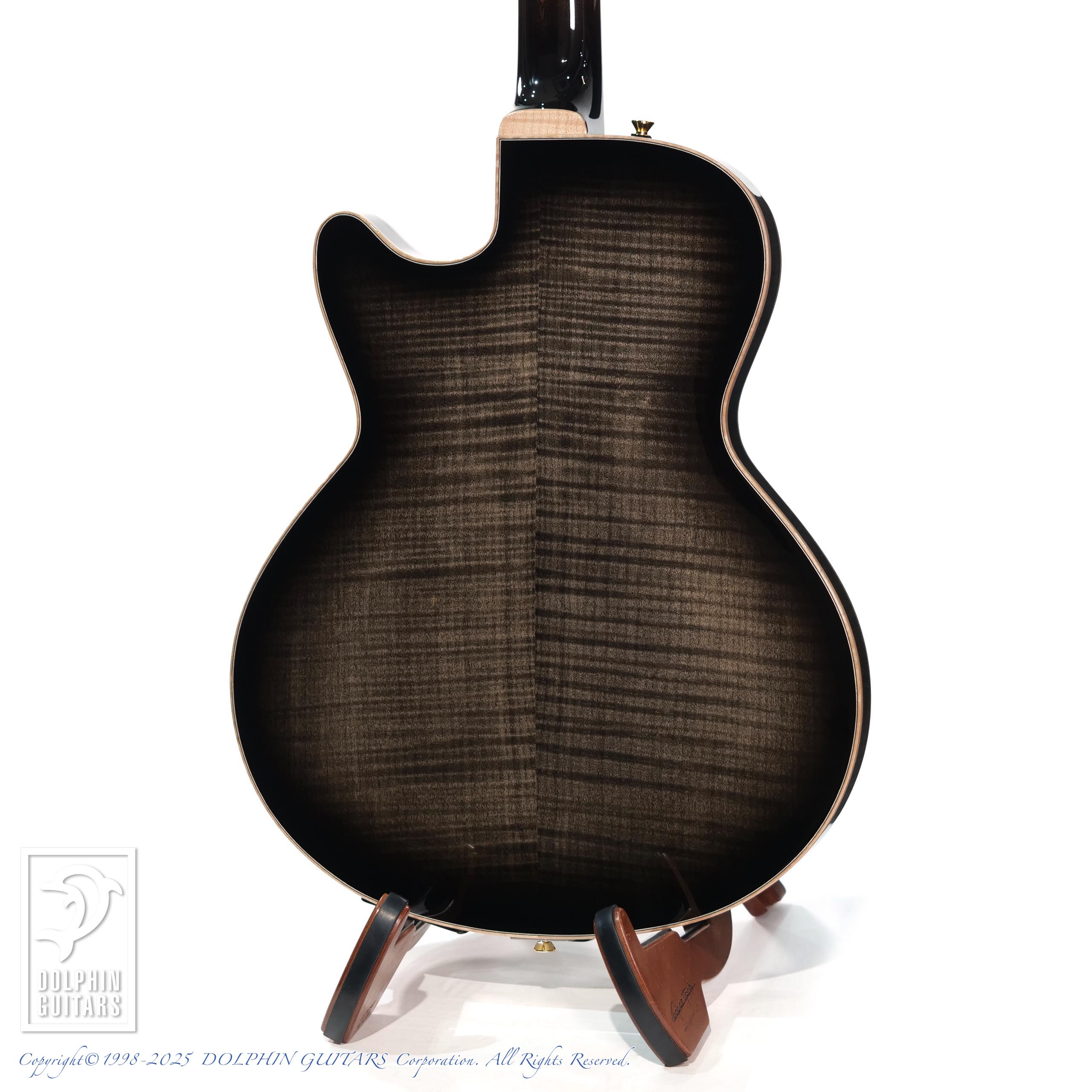モダンなSシェイプのサウンドホールや、フレイムメイプルの美しい杢目が洗練された現代的なシルエットを印象付けております。