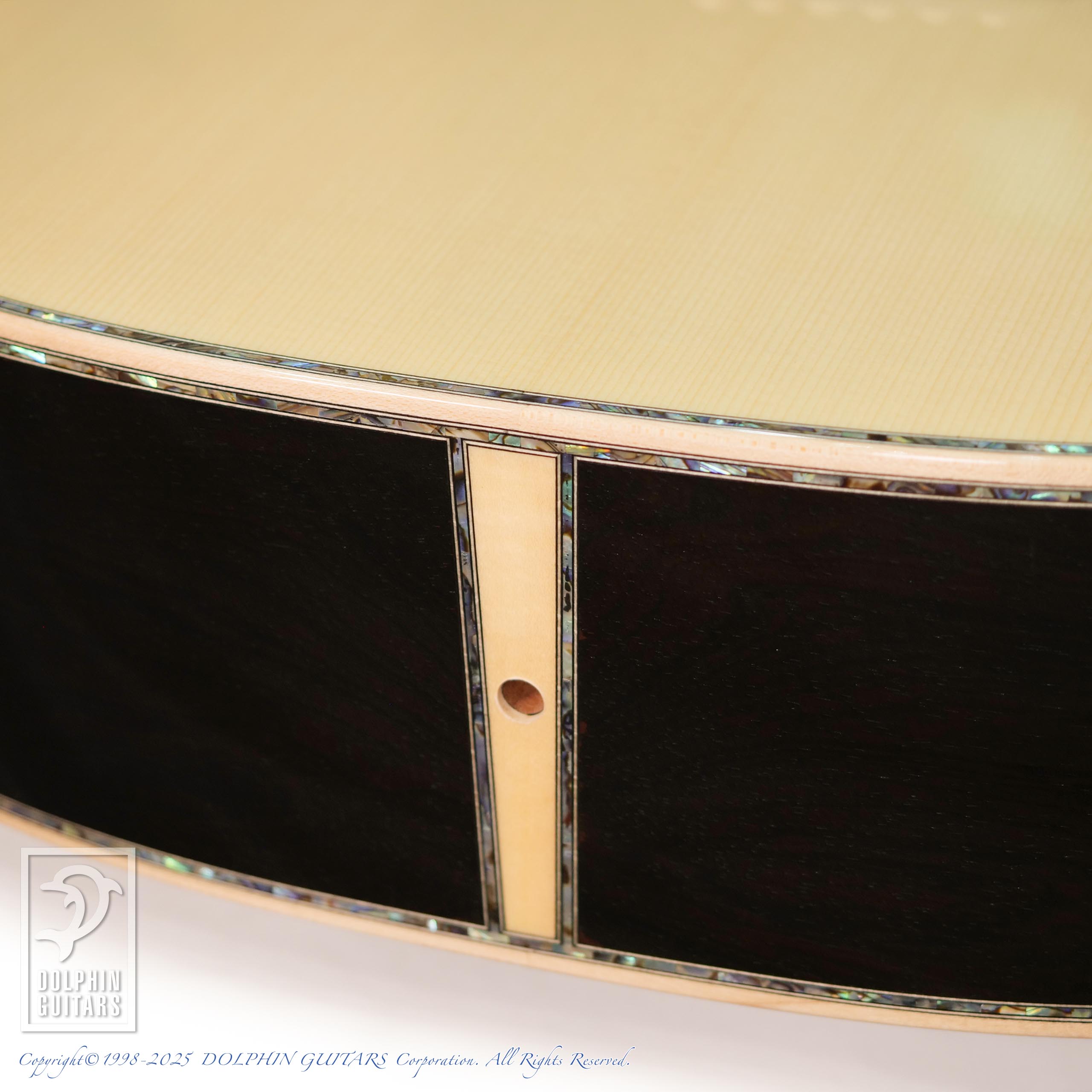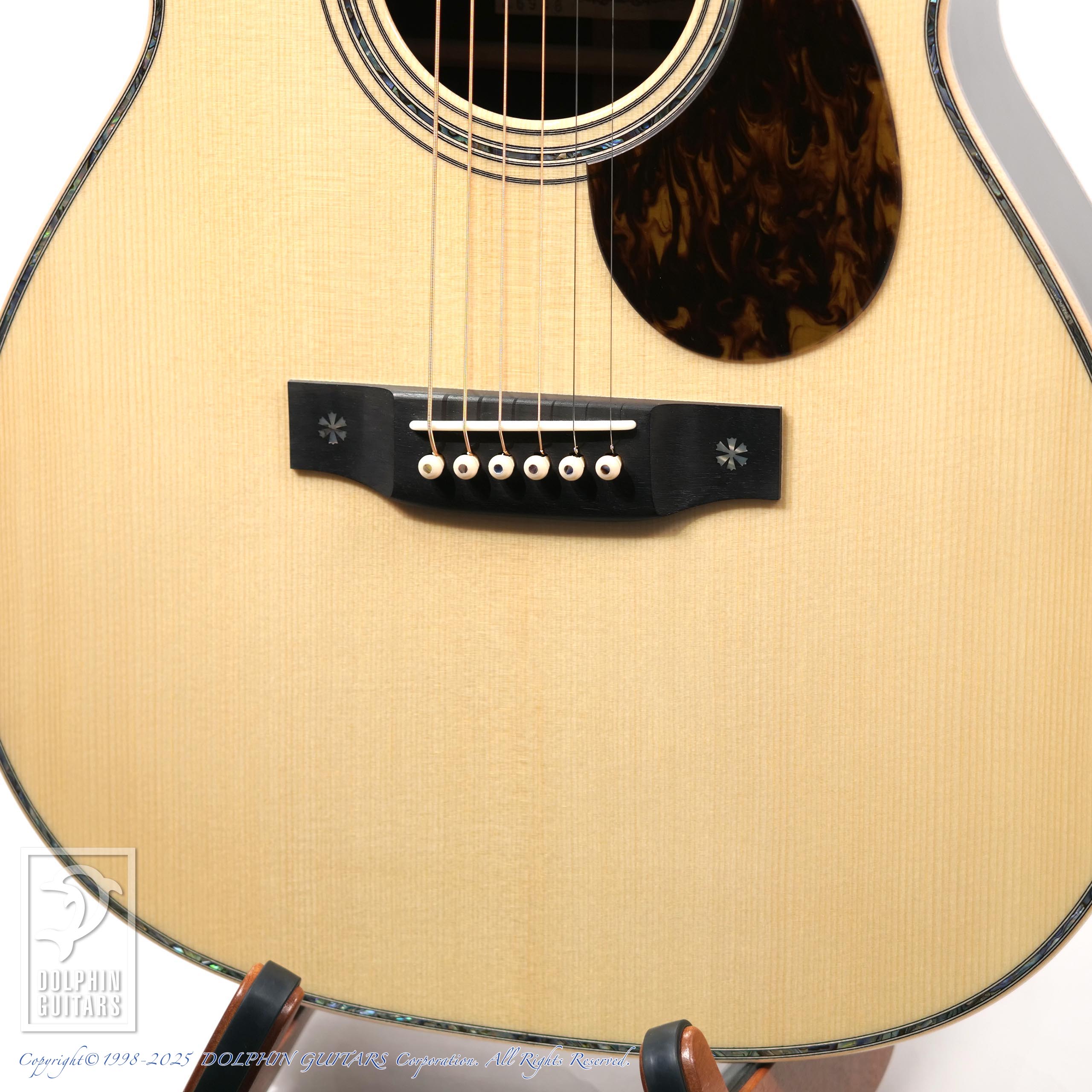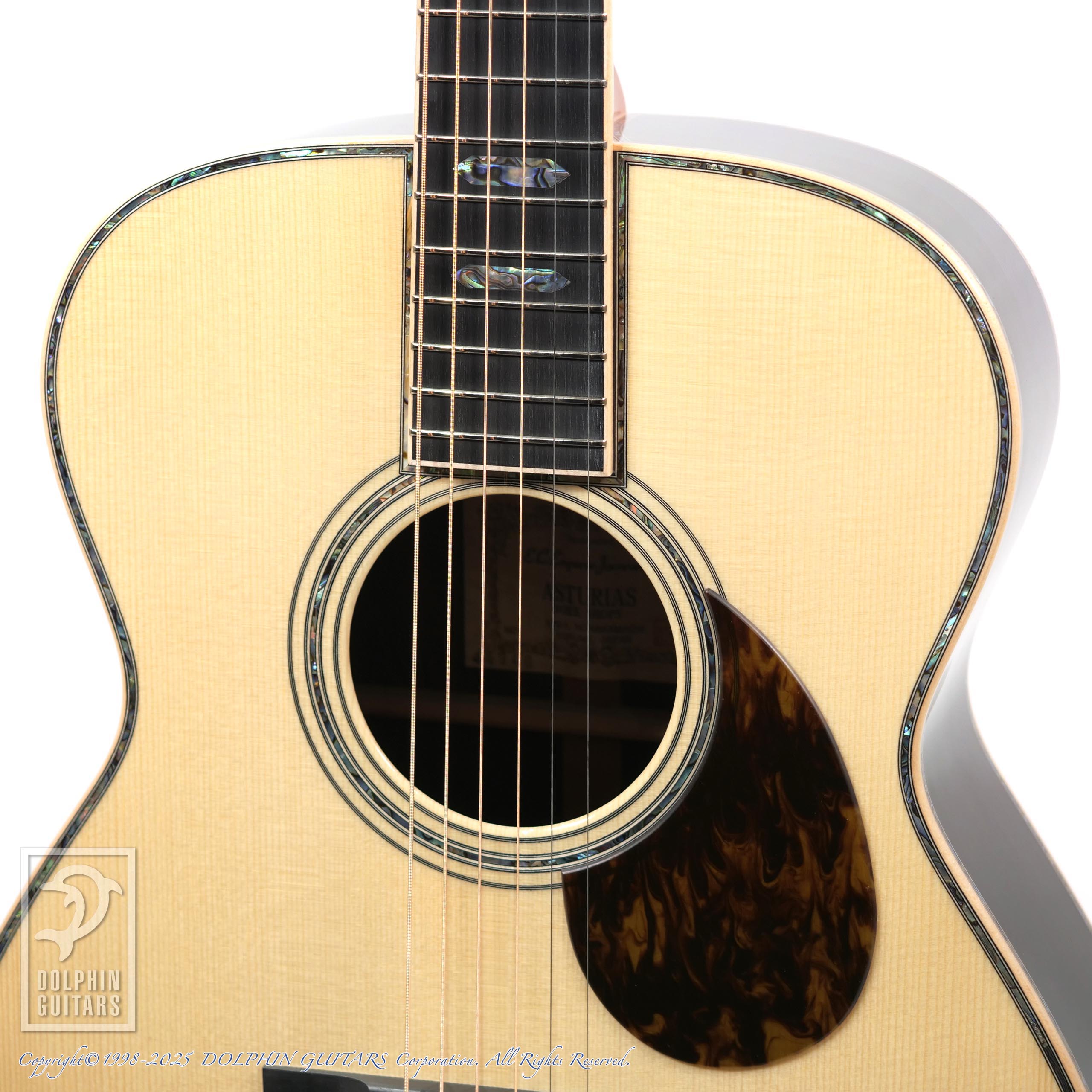 ヘッドからボディエンドまで贅沢に施されたメキシコ貝インレイのきらびやかさはもちろん、この1本を製作するために最高級材を使用。ハカランダの重厚感とキメ細かなジャーマンスプルース、内部にも徹底した拘りを持ち、ブレイシング材も磨き上げられ、強くハリのあるサウンドに色鮮やかなトーンなど、経験豊富なアストリアスクラフトマンが製作した最高級品は「エンペラー」のネーミングにふさわしいギターです。