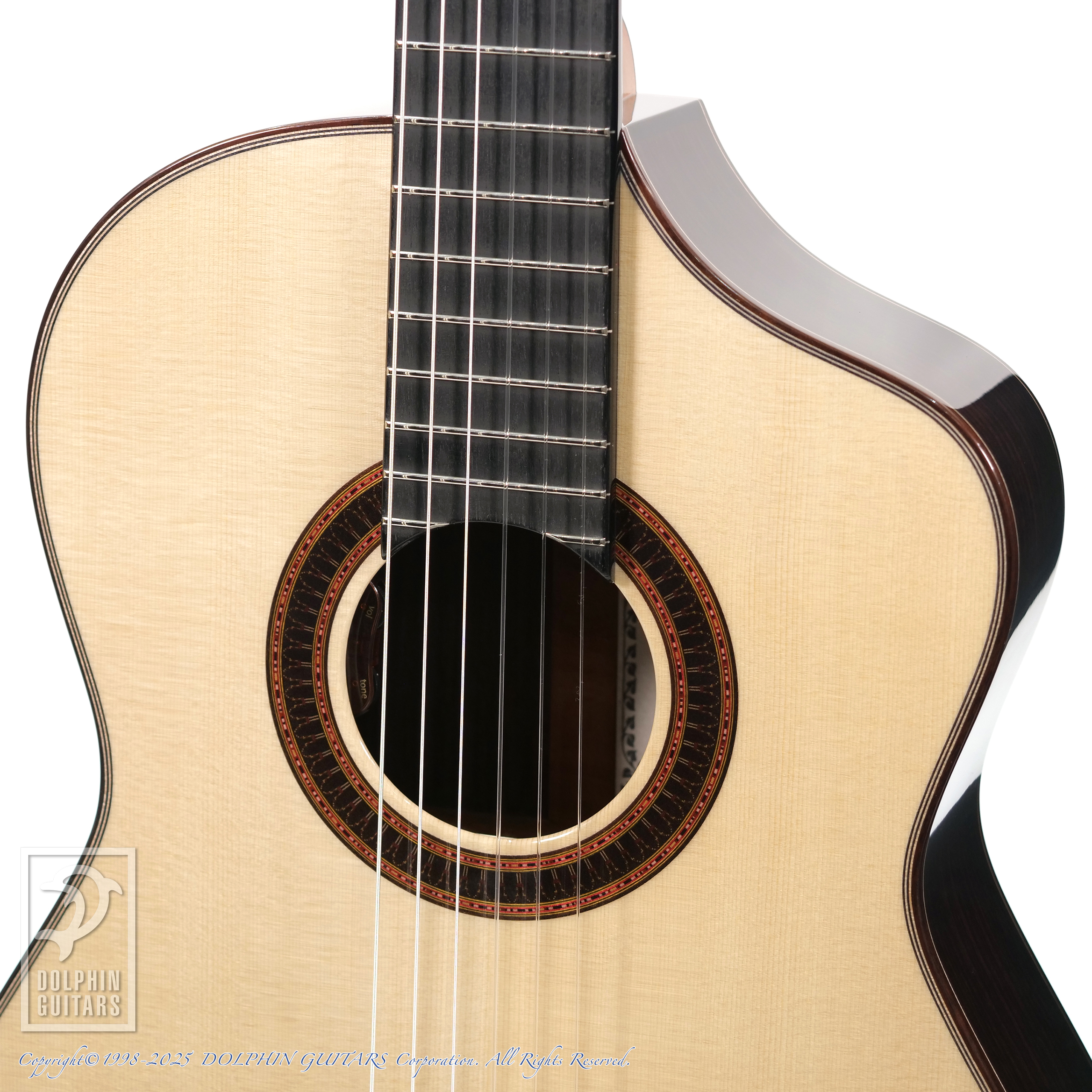 本器はクラシックギターに比べやや小振りなボディサイズ+630mmショートスケール+カッタウェイ仕様のSolo Classicoをベースに、薄ボディ+様々なカスタムを加え完成したVivoシリーズより、美しいジャーマンスプルースとローズウッドの王道仕様、Solo Classico Vivo。