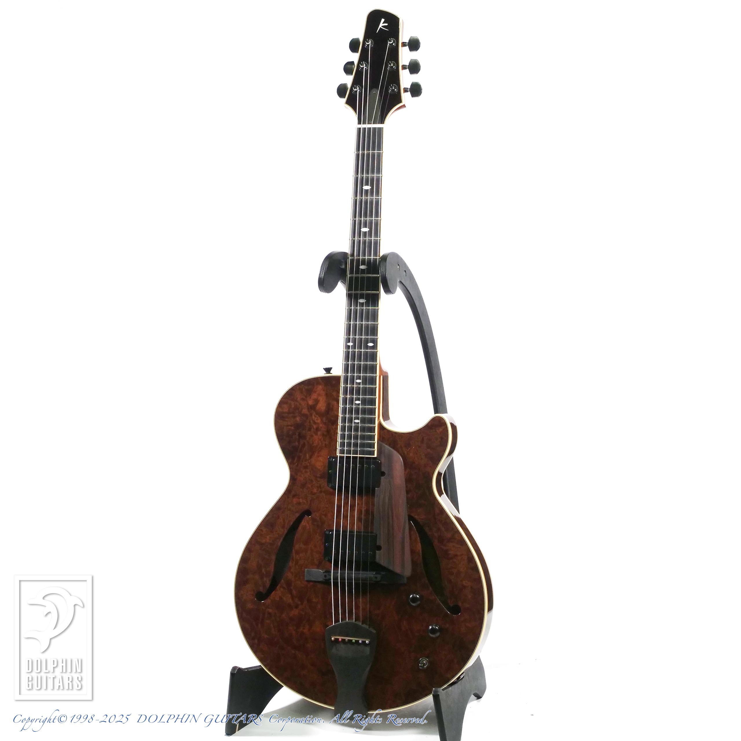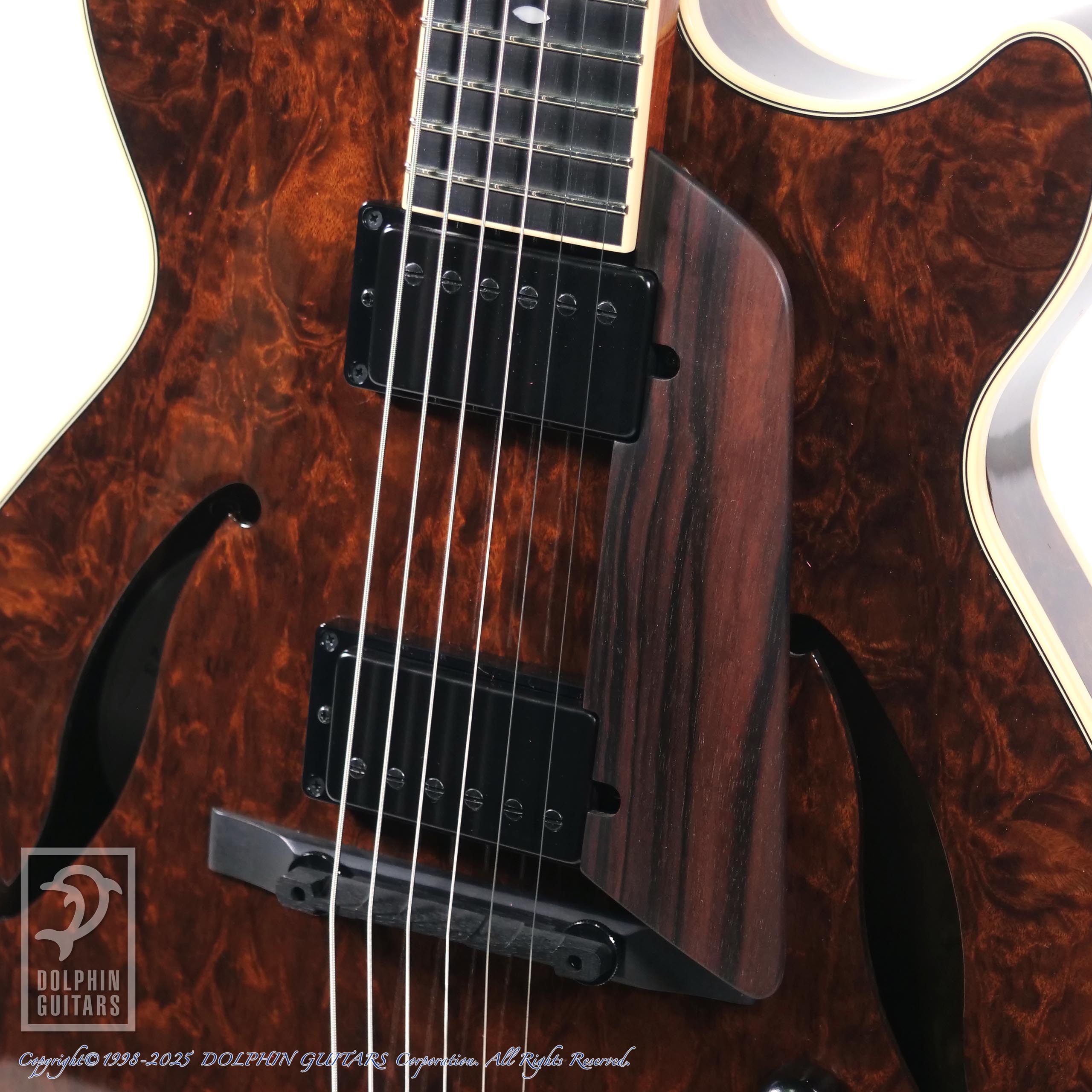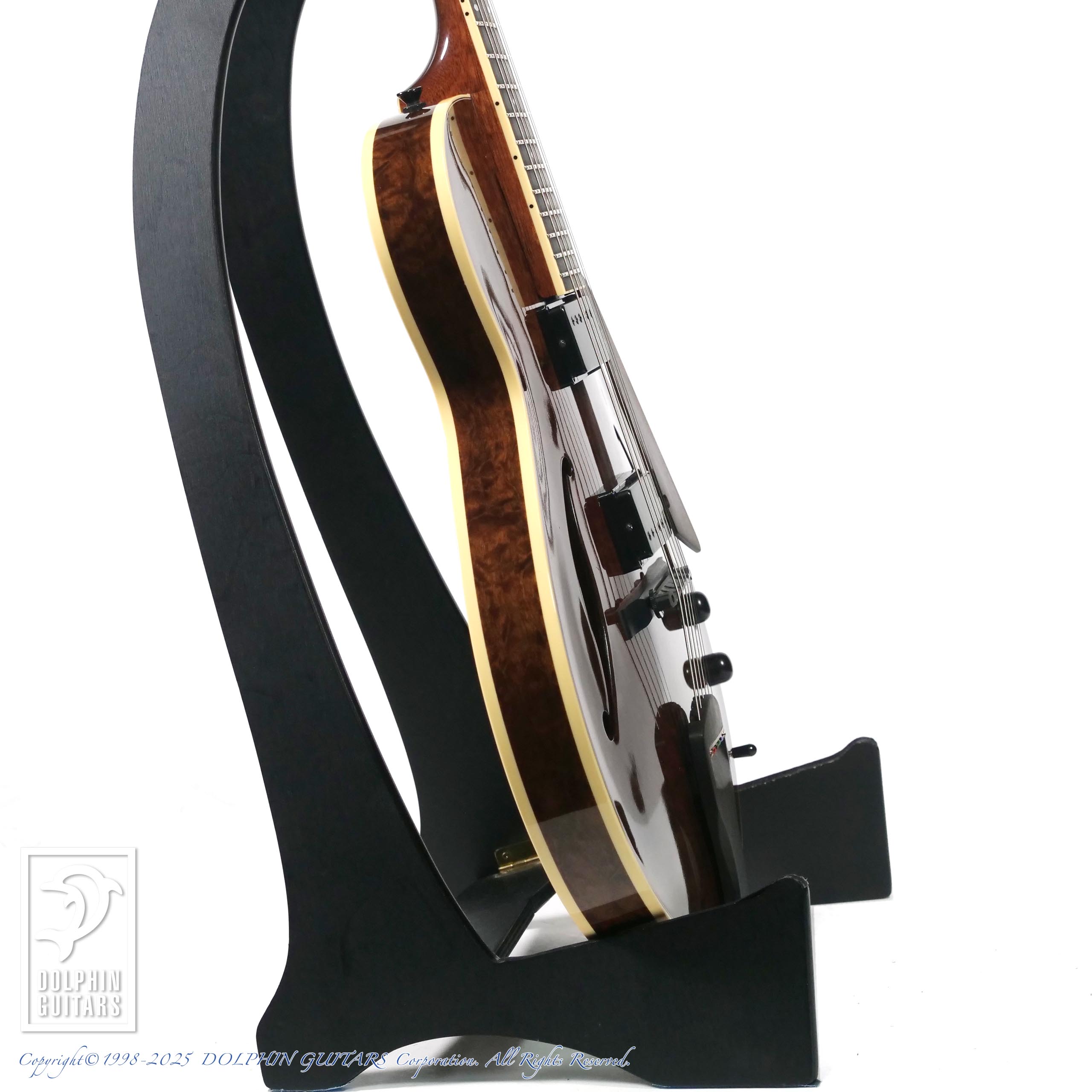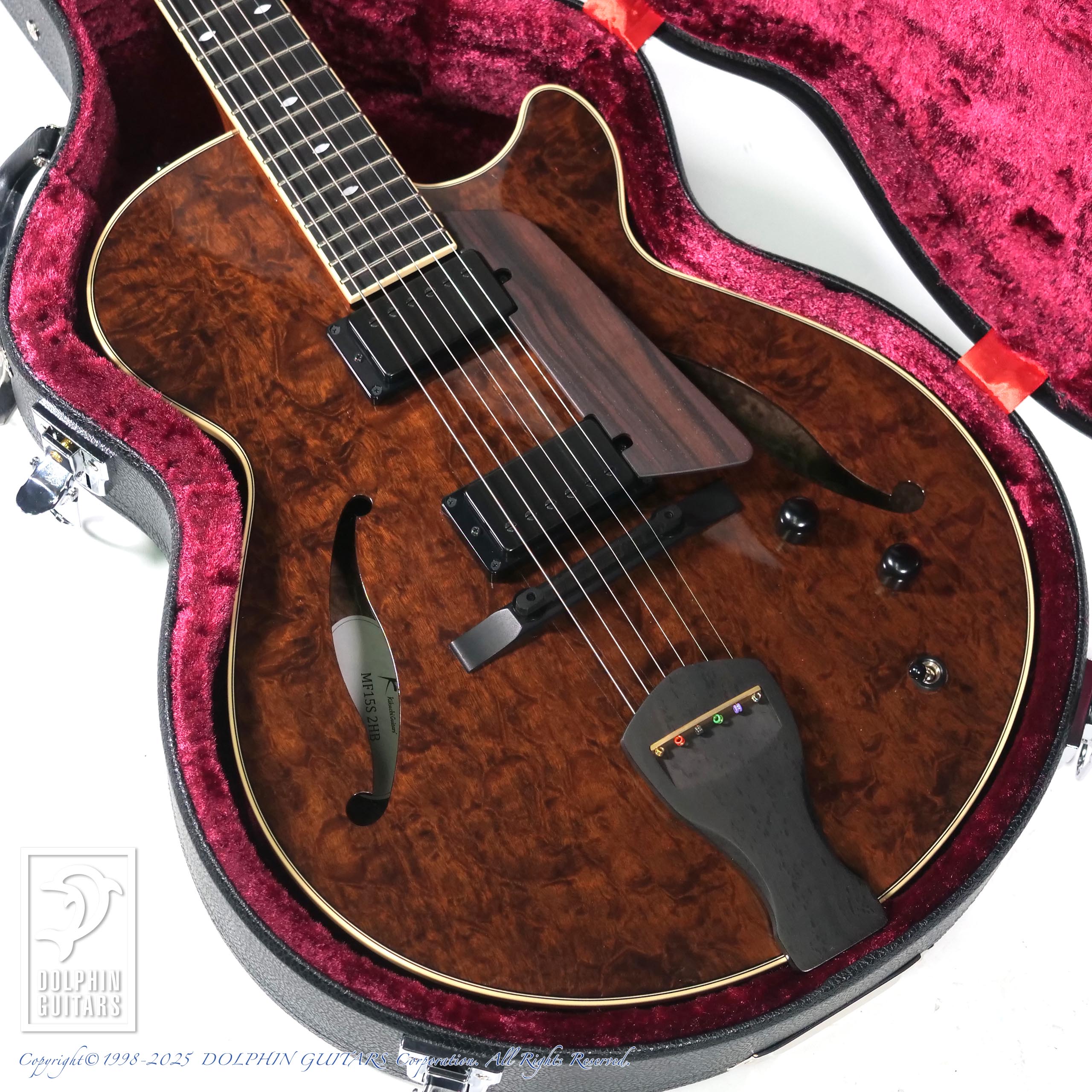 本器は15インチボディの2ピックアップ薄胴フルアコ、MF15S 2HB Imbuia Burl。