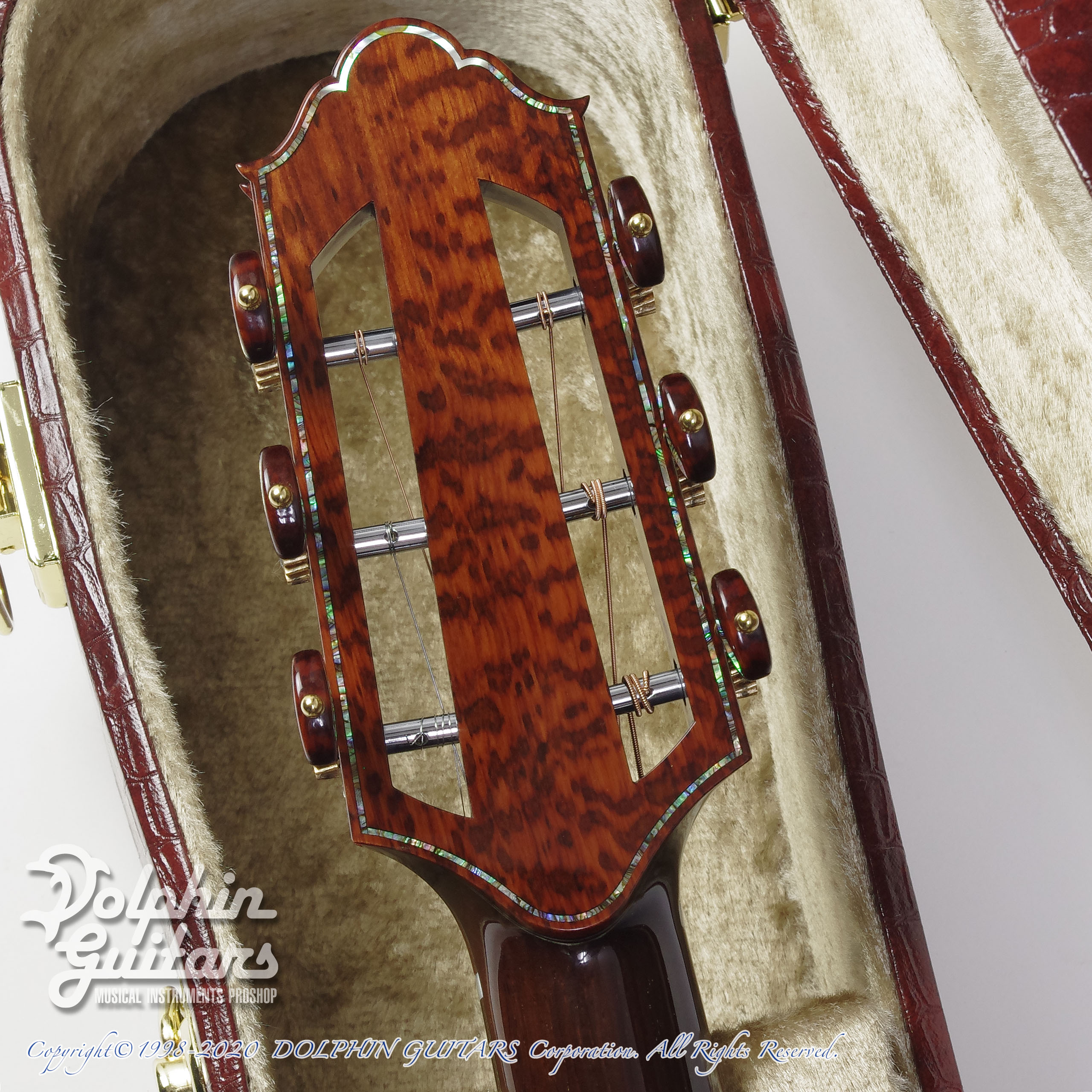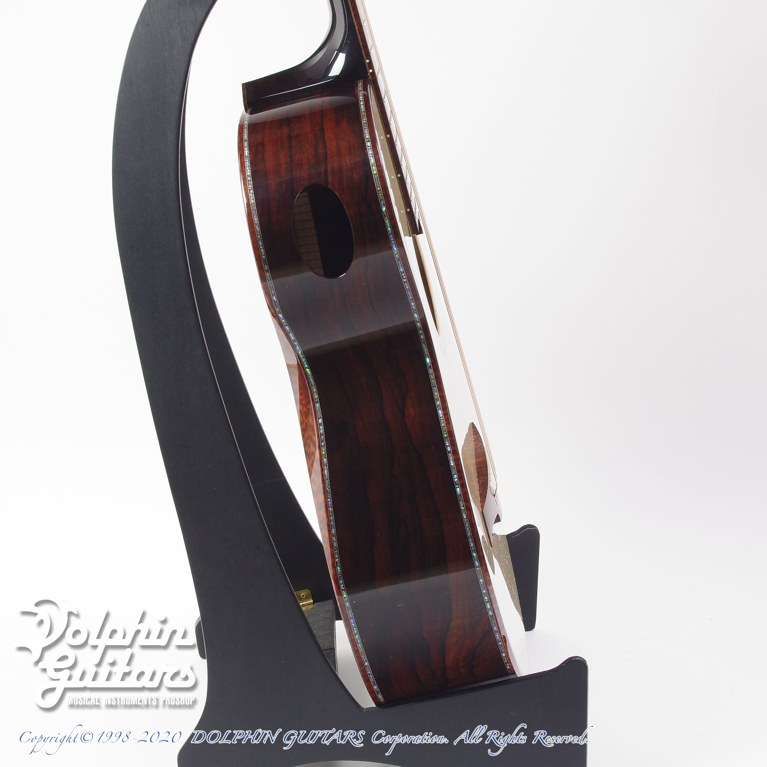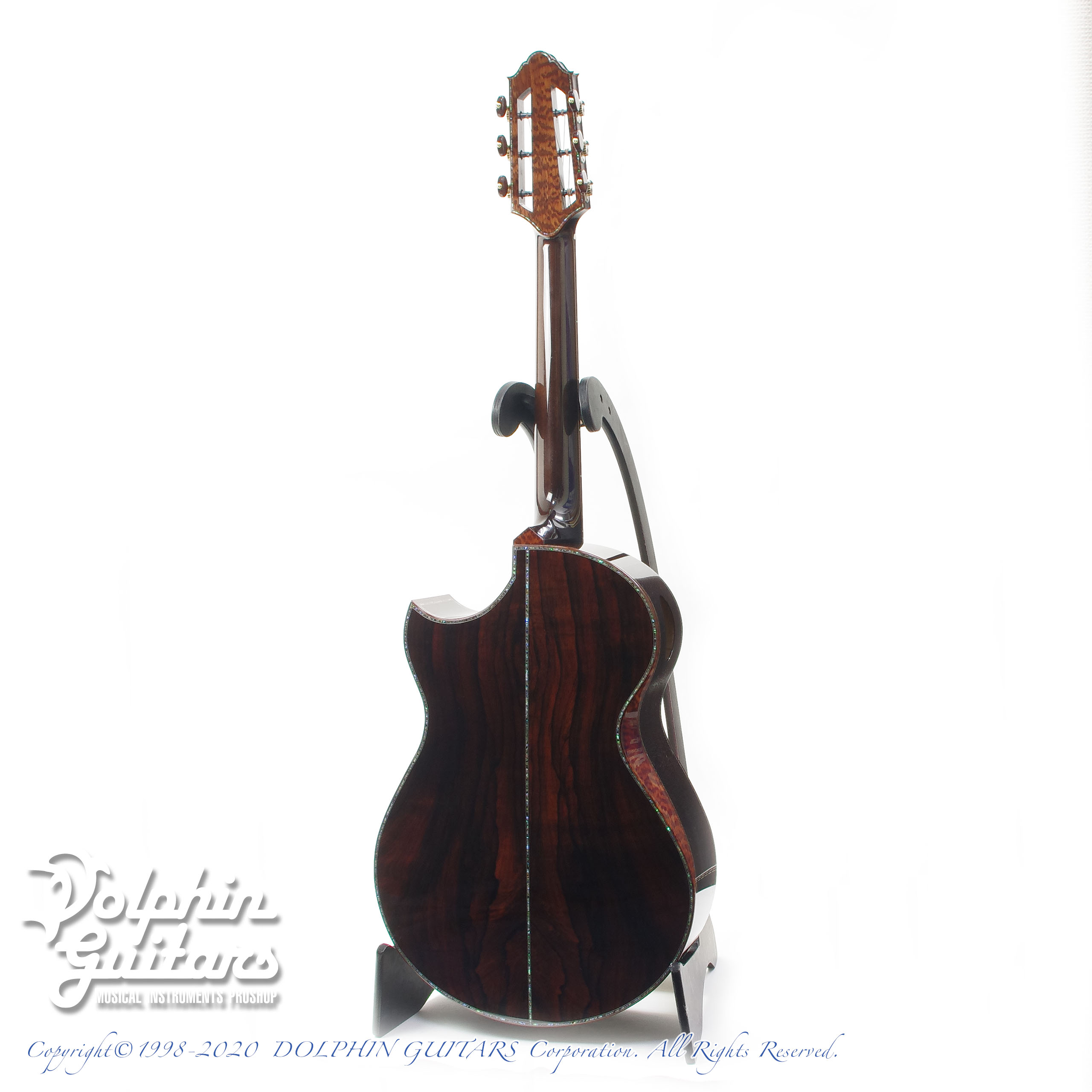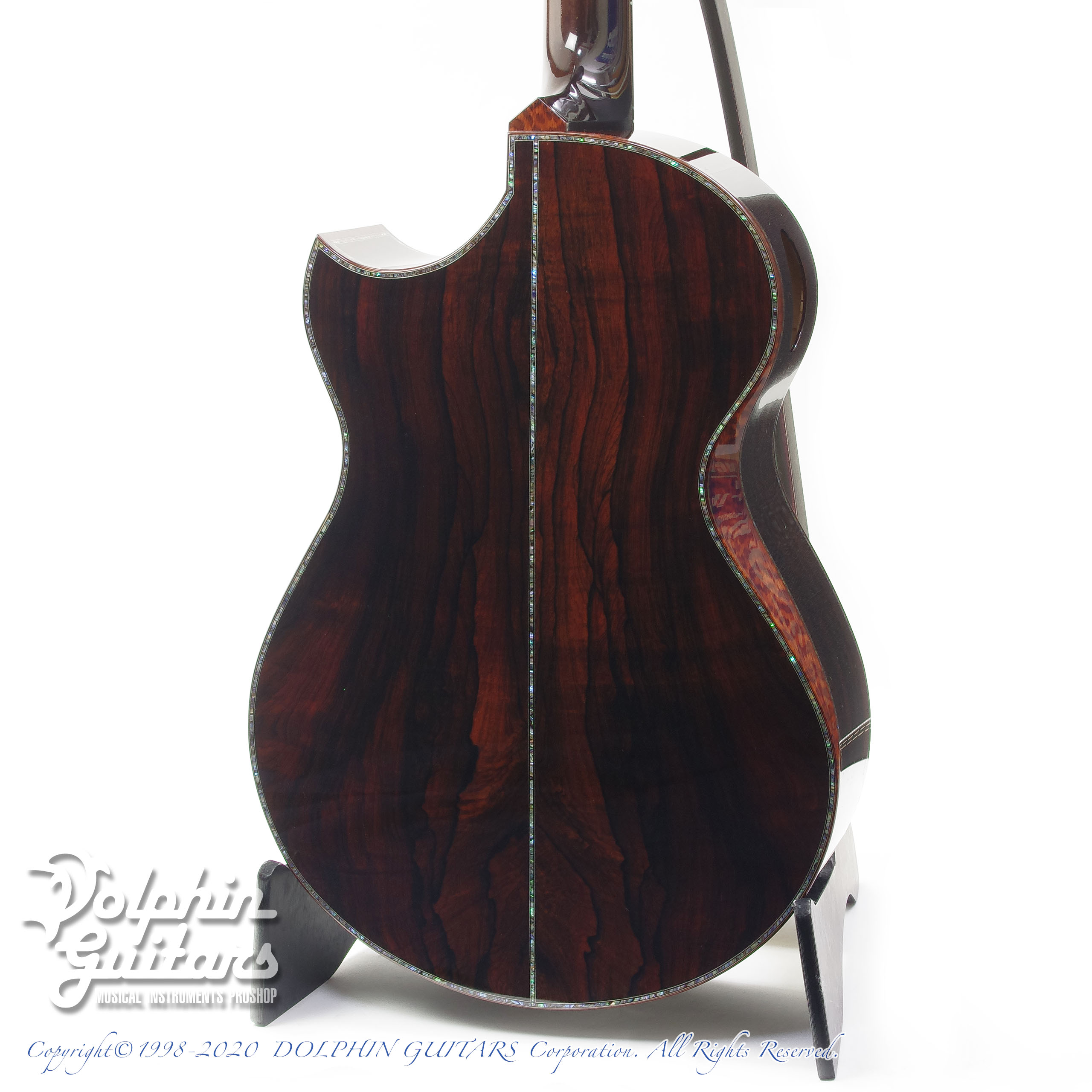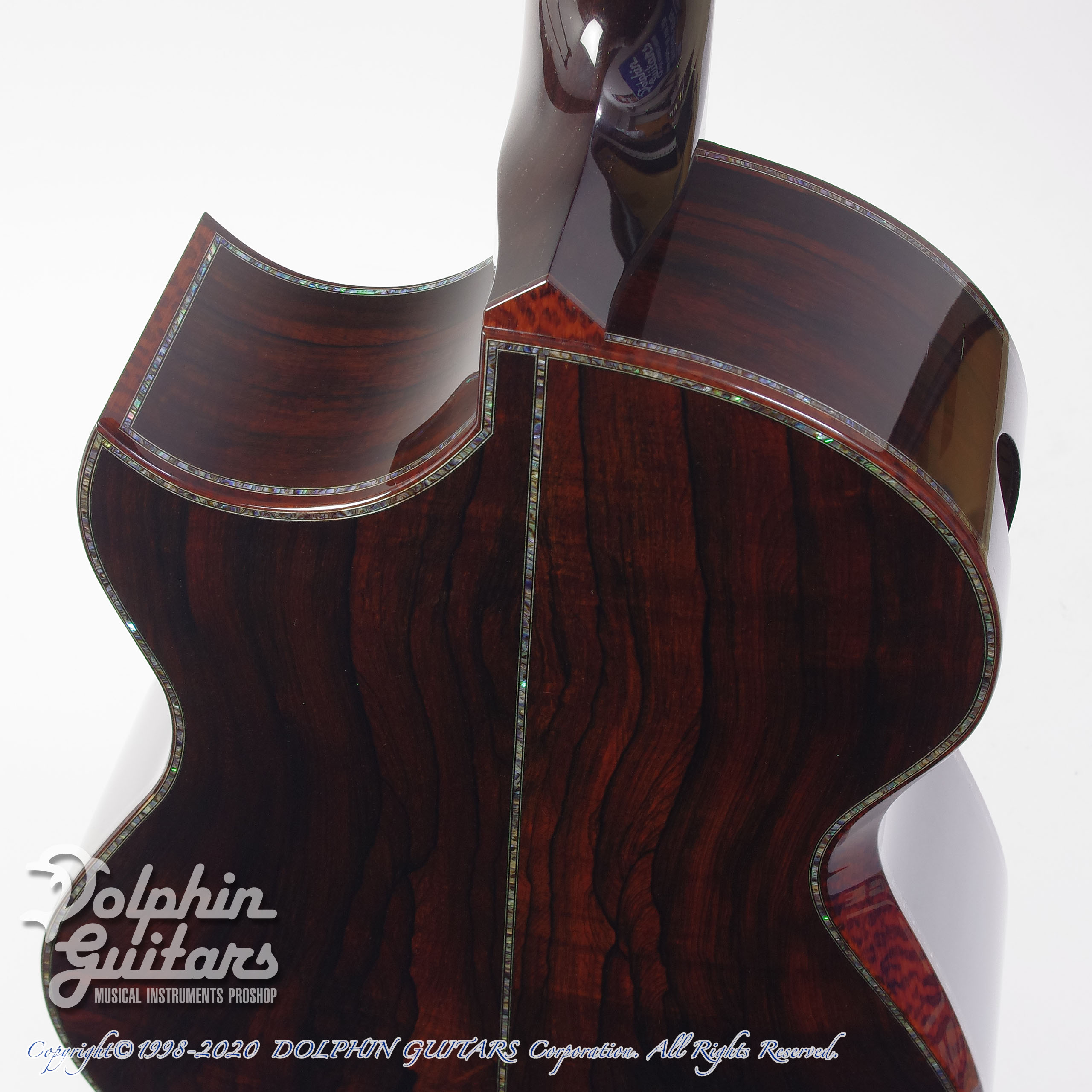 S&B材は最高級のハカランダを使用。ボディやネック・ヘッドと全面にアバロンの装飾を施し、バックコンター加工(リブレスト)やバインディング材に超高級材であるスネイクウッドを採用。