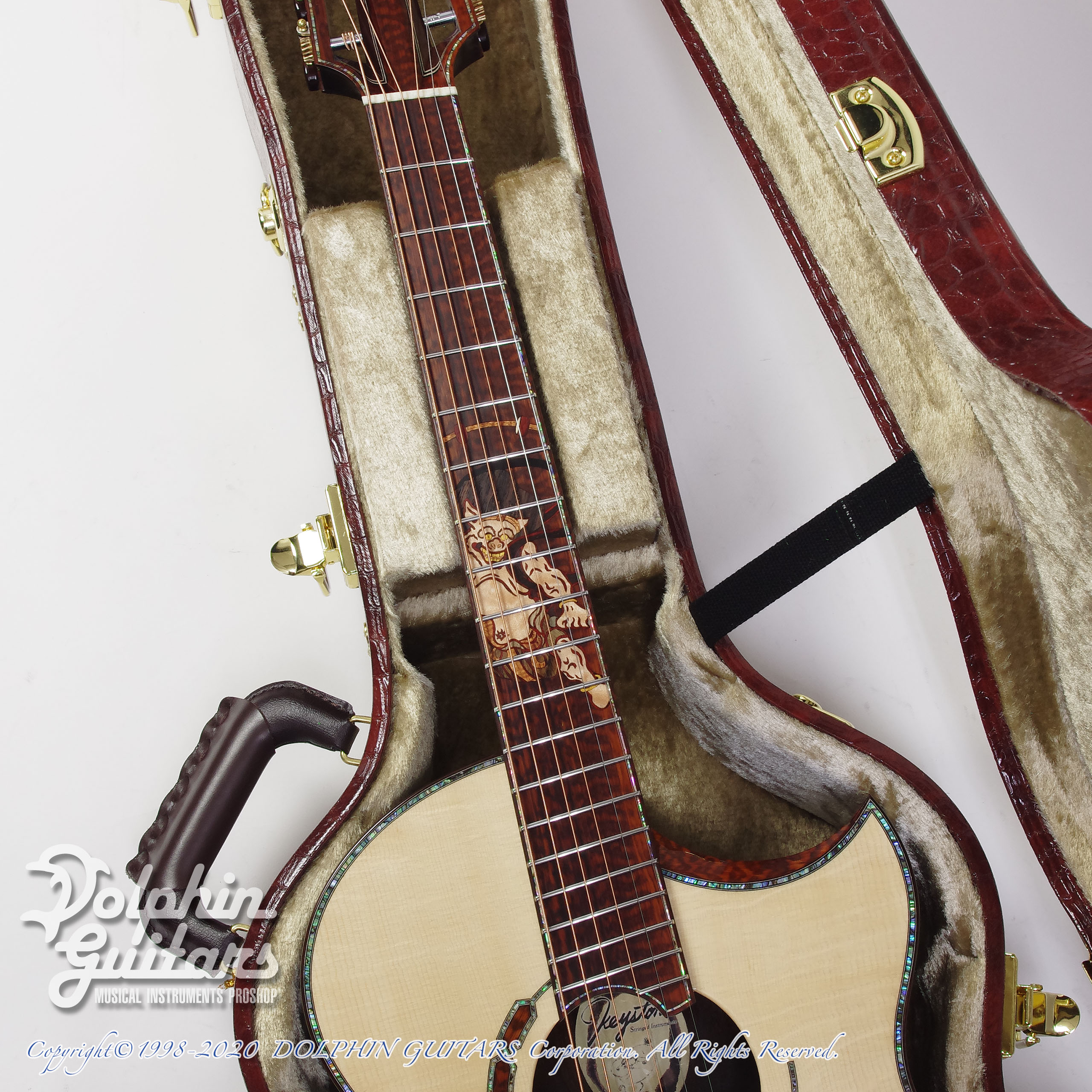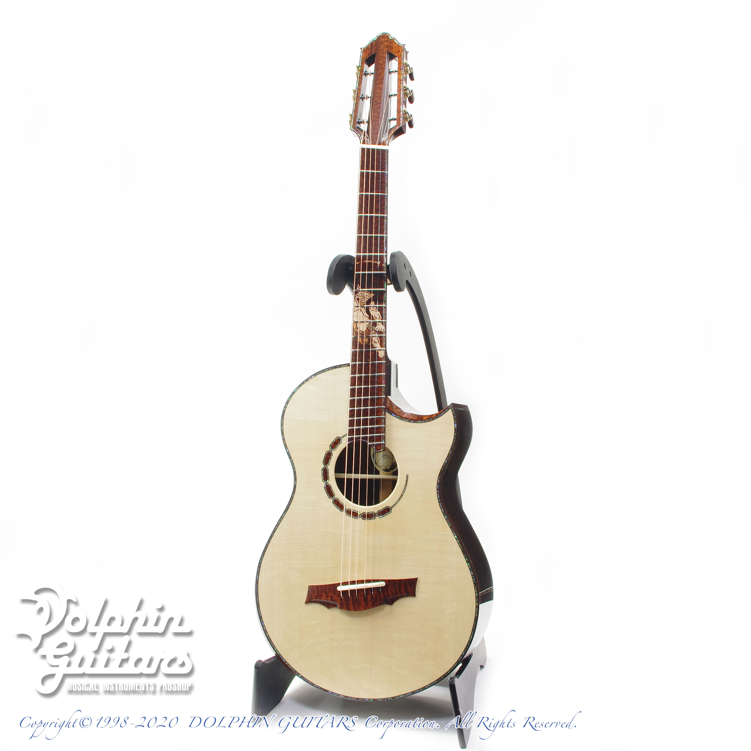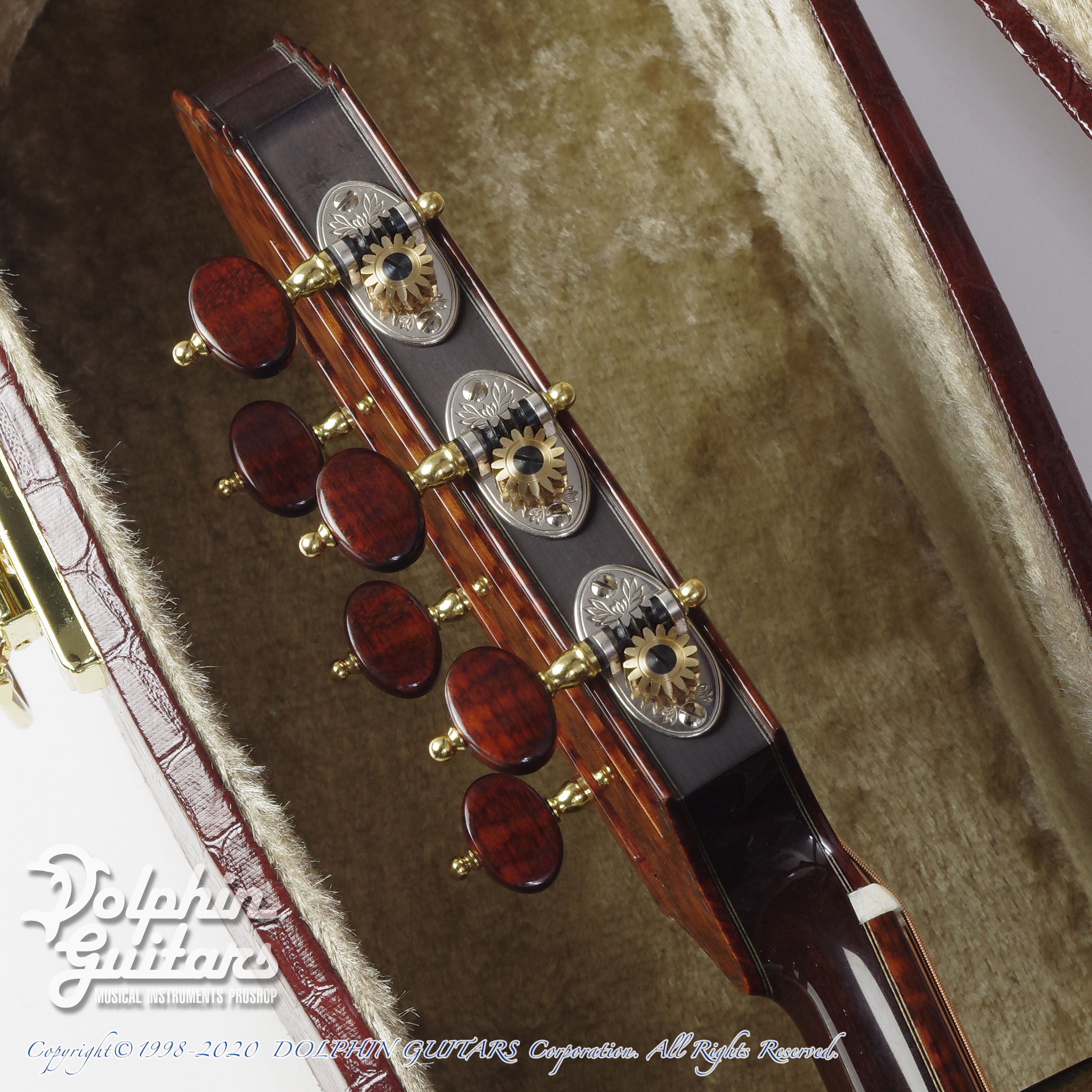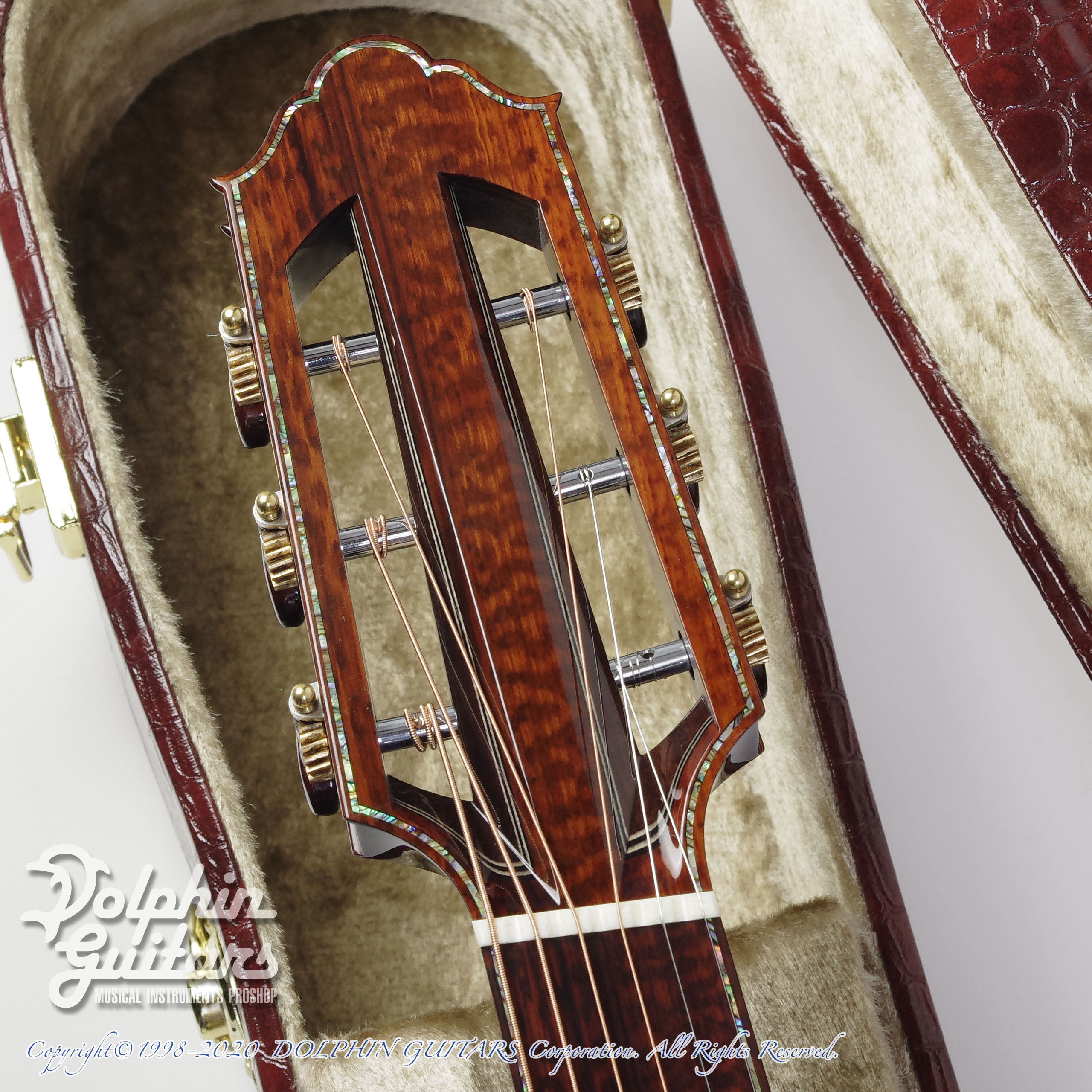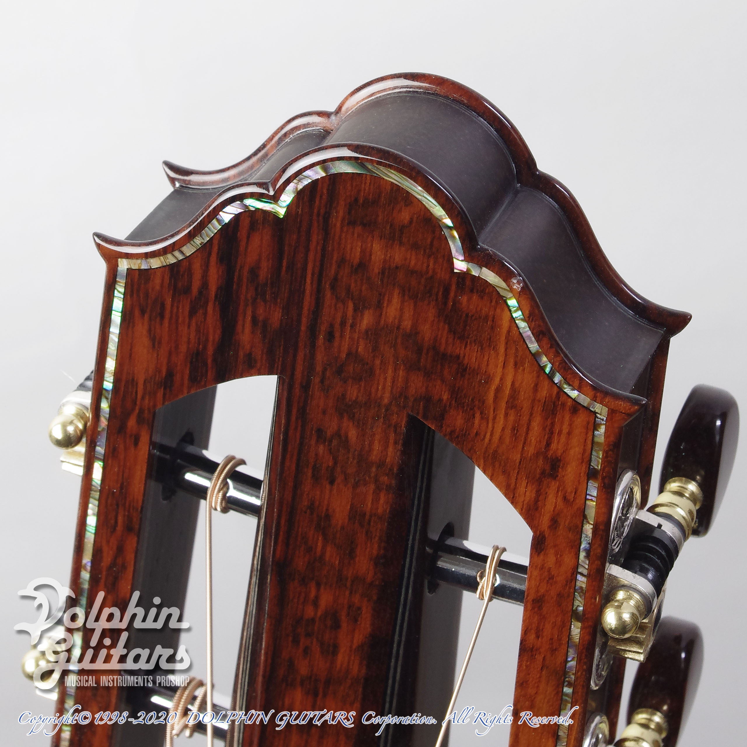 S&B材は最高級のハカランダを使用。ボディやネック・ヘッドと全面にアバロンの装飾を施し、バックコンター加工(リブレスト)やバインディング材に超高級材であるスネイクウッドを採用。
