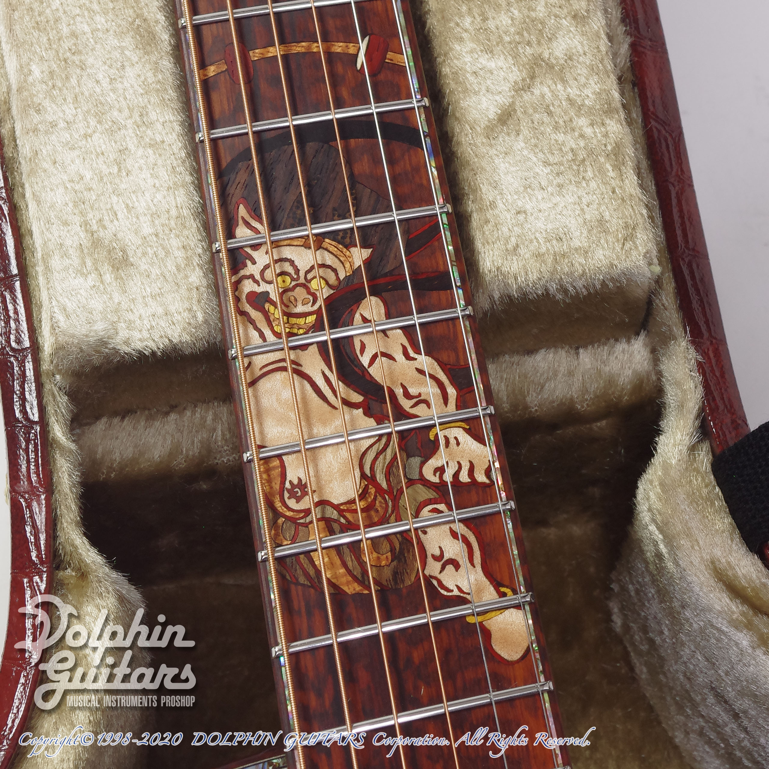 雷神の太鼓(雷鼓)に見立てたロゼッタ、スネイクウッド材を切り出し、アバロンと組み合わせた指板インレイト対になる一点もののデザイン。