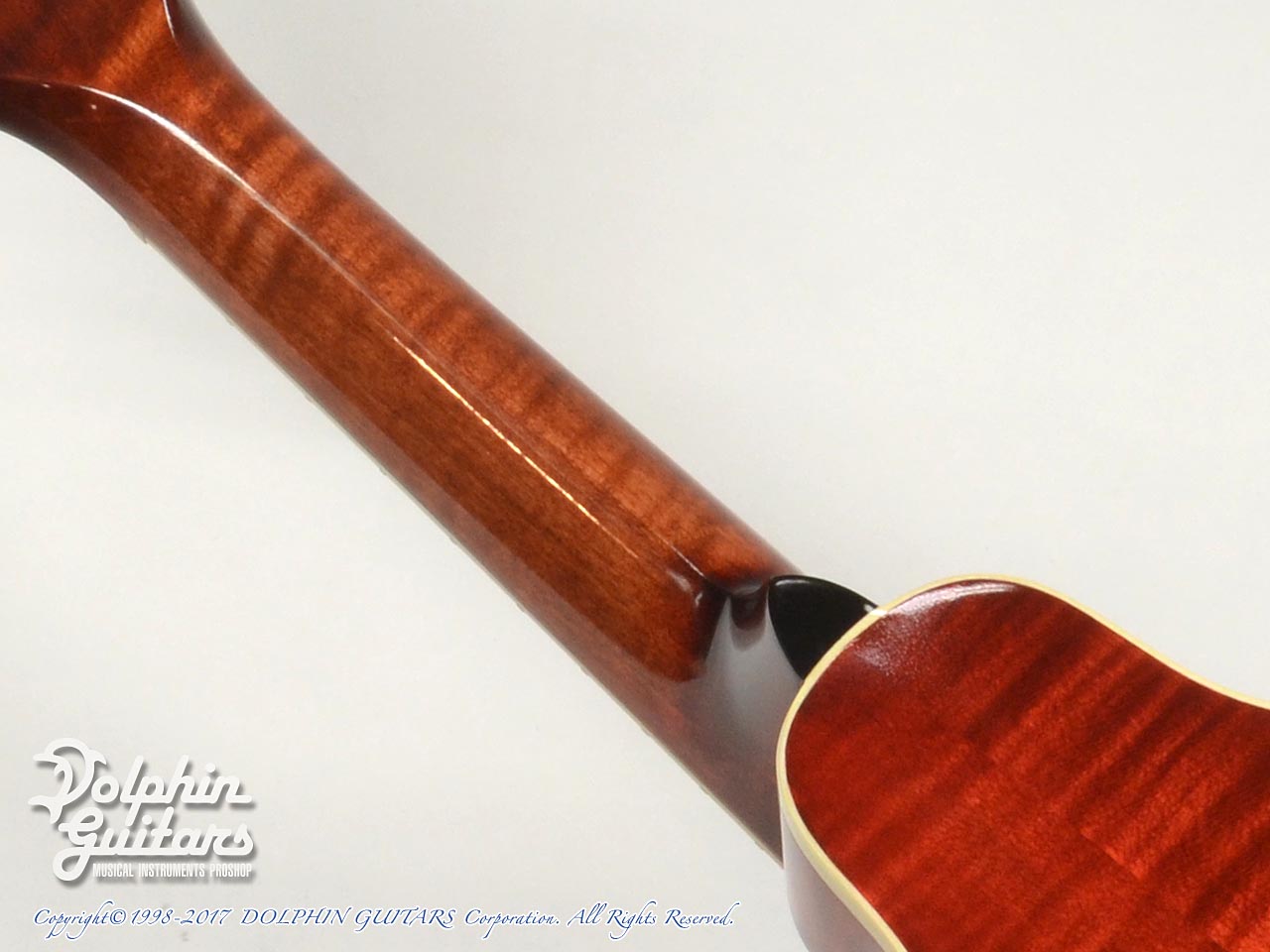 フィニッシュは、非常に手間のかかる、”シェラック”を採用、その薄さ故にウェザーチェクや傷が入りやすく大変デリケートですが、ボリューム感のあるウッディでまろやかな響きになり、弾き込む事で味わいが増していくことでしょう。
