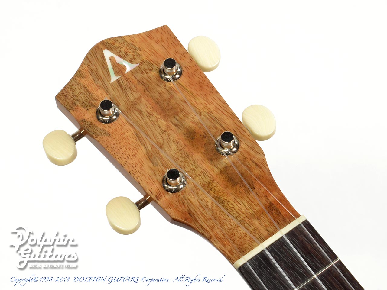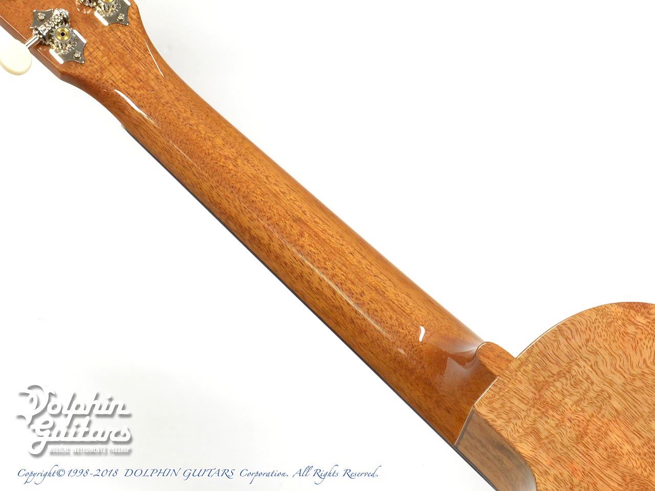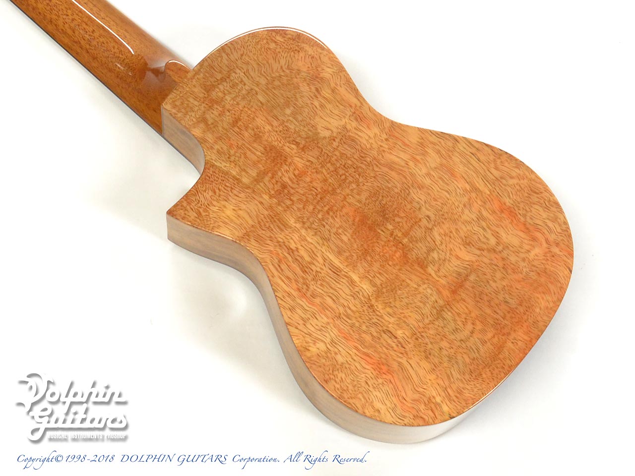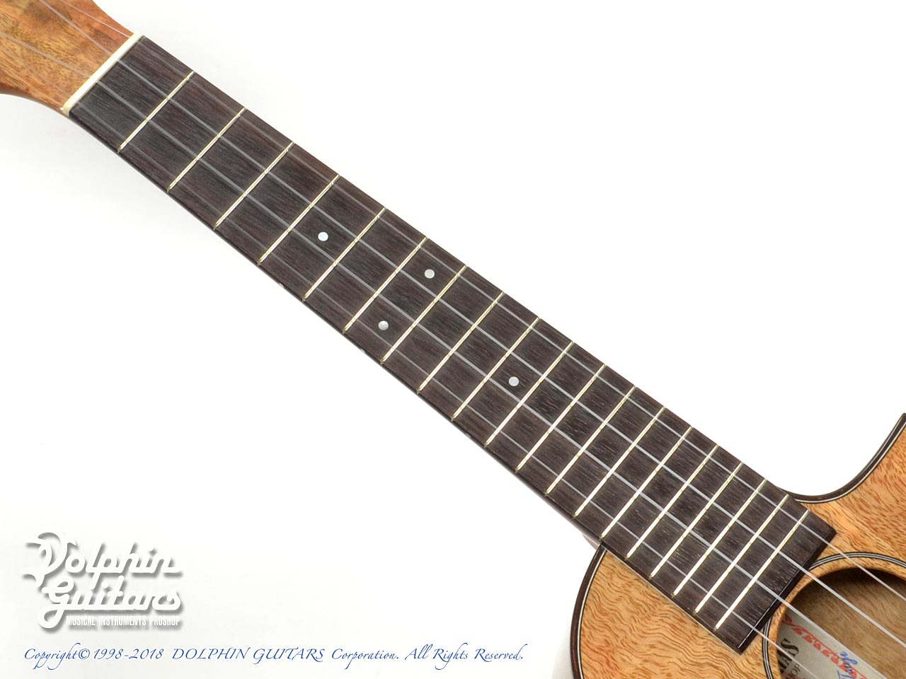 ボディは既存の「ソプラノ」「コンサート」といったサイズではなく、またハイポジションでのプレイアビリティを考え、フローレンタインのカッタウェイを施しています。ボディ内部のブレイシングはギター製作で培った知恵を絞って高さ、幅、形状、配置する位置などを熟慮して決定。ネックのスケールもソロ・プレイ時に苦にならない長さに設定されています。