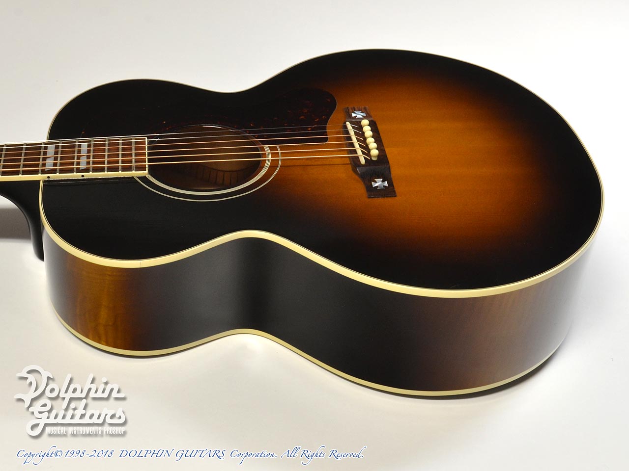 シトカ・スプルーストップ、フレイムメイプルS&B、マホガニー・ネック、ローズ指板&ブリッジ、ダブル・パラレログラム指板インレイ、マルタクロス・インレイ、スキャロップドXブレーシング、グローバー糸巻き、サンバーストカラー。