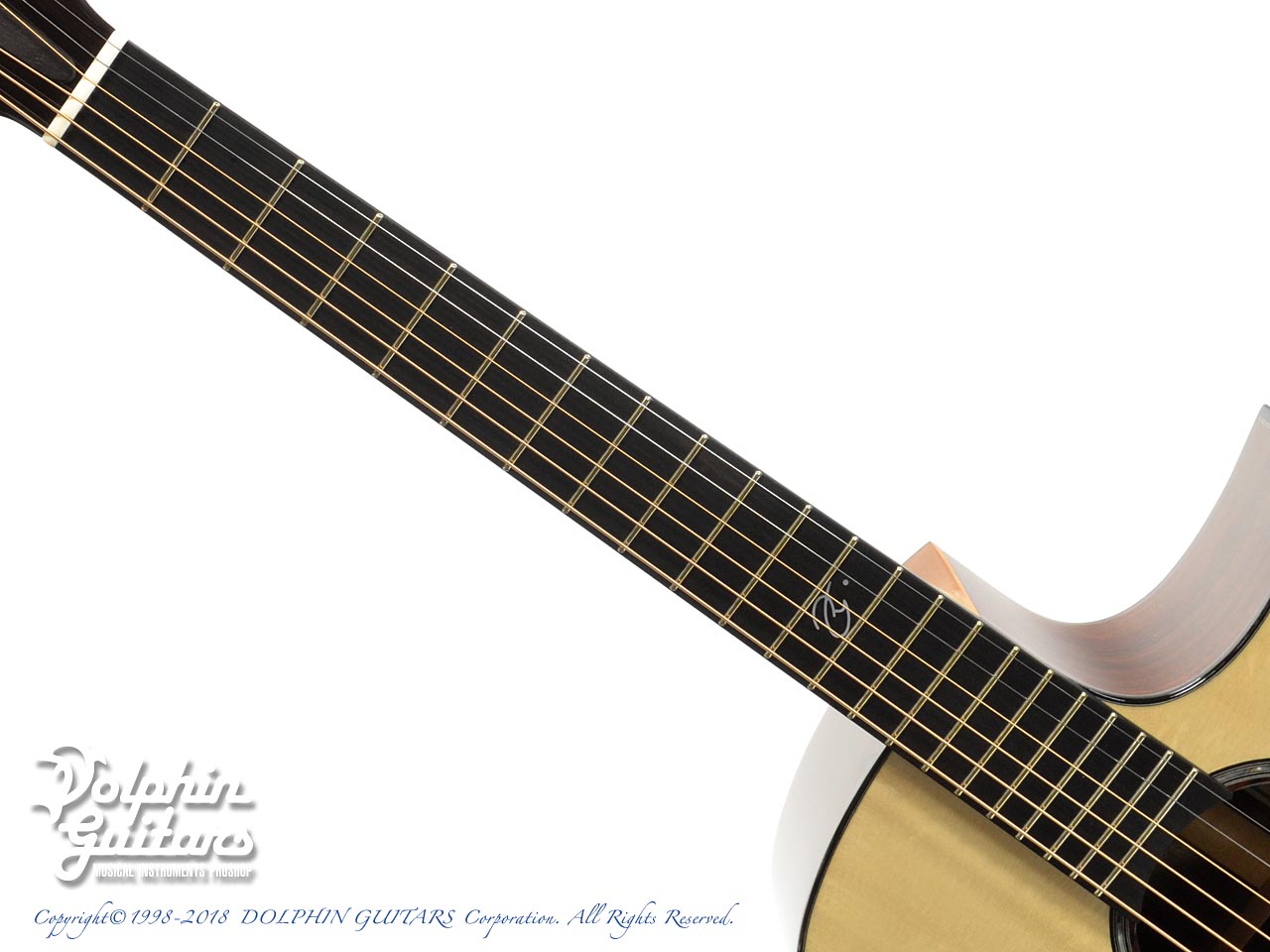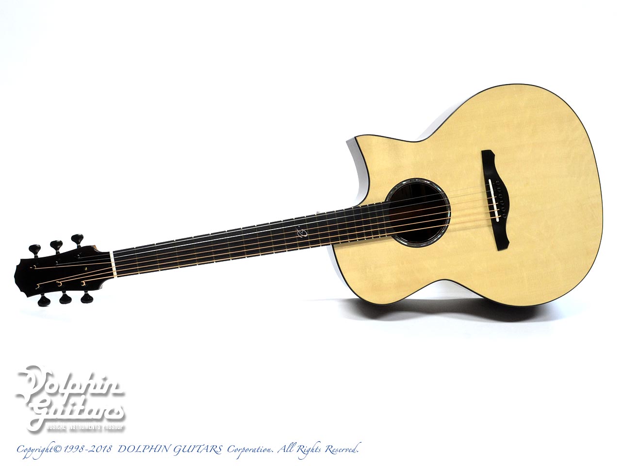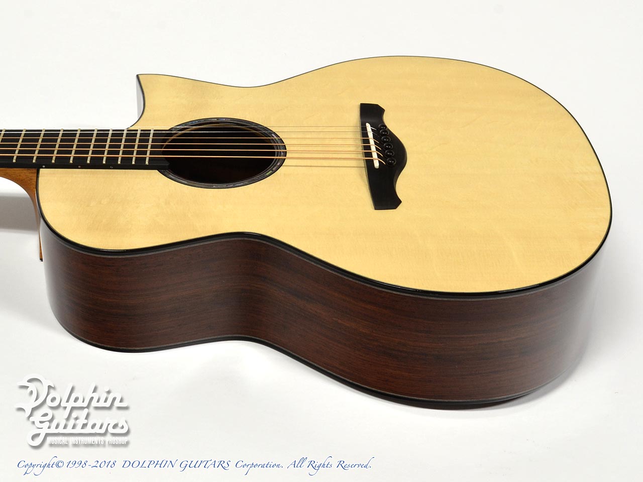 ベアクロウ・ジャーマン・スプルーストップ、マダガスカル・ローズウッド・サイド&バック、ホンジュラス・マホガニー1pネック、エボニー指板、駒&バインディング、アバロン+ウッド・ロゼッタ、フローレンタイン・カッタウェイ。
