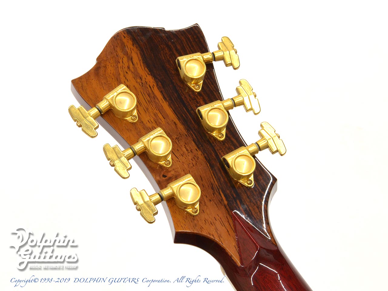 エピフォンの流れを汲んだ曲線が美しいヘッドシェイプにインペリアルタイプのペグ、個性的なインレイなどなど、派手なカントリー衣装にも負けない豪華な仕上がりです。もはやアートギターでしょう。