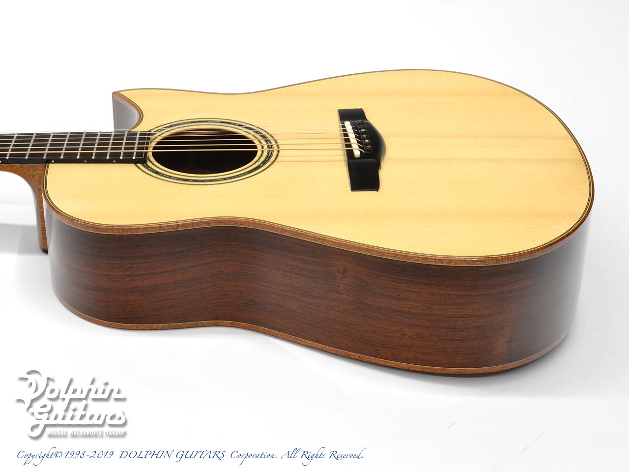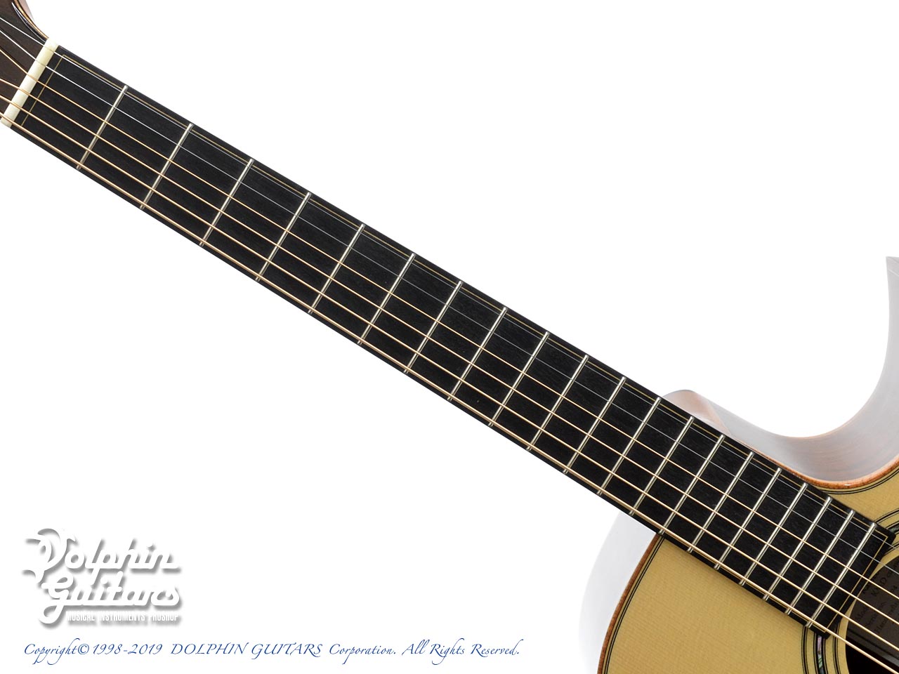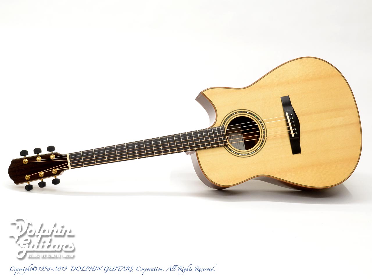 ヨーロピアンスプルース・トップ、マダガスカルローズウッド・サイド&バック、マホガニーネック、エボニー指板&駒、コア・ウッドバインディング、フローレンタインカッタウェイ、アバロン・ロゼッタ、ゴトー510糸巻き仕様。