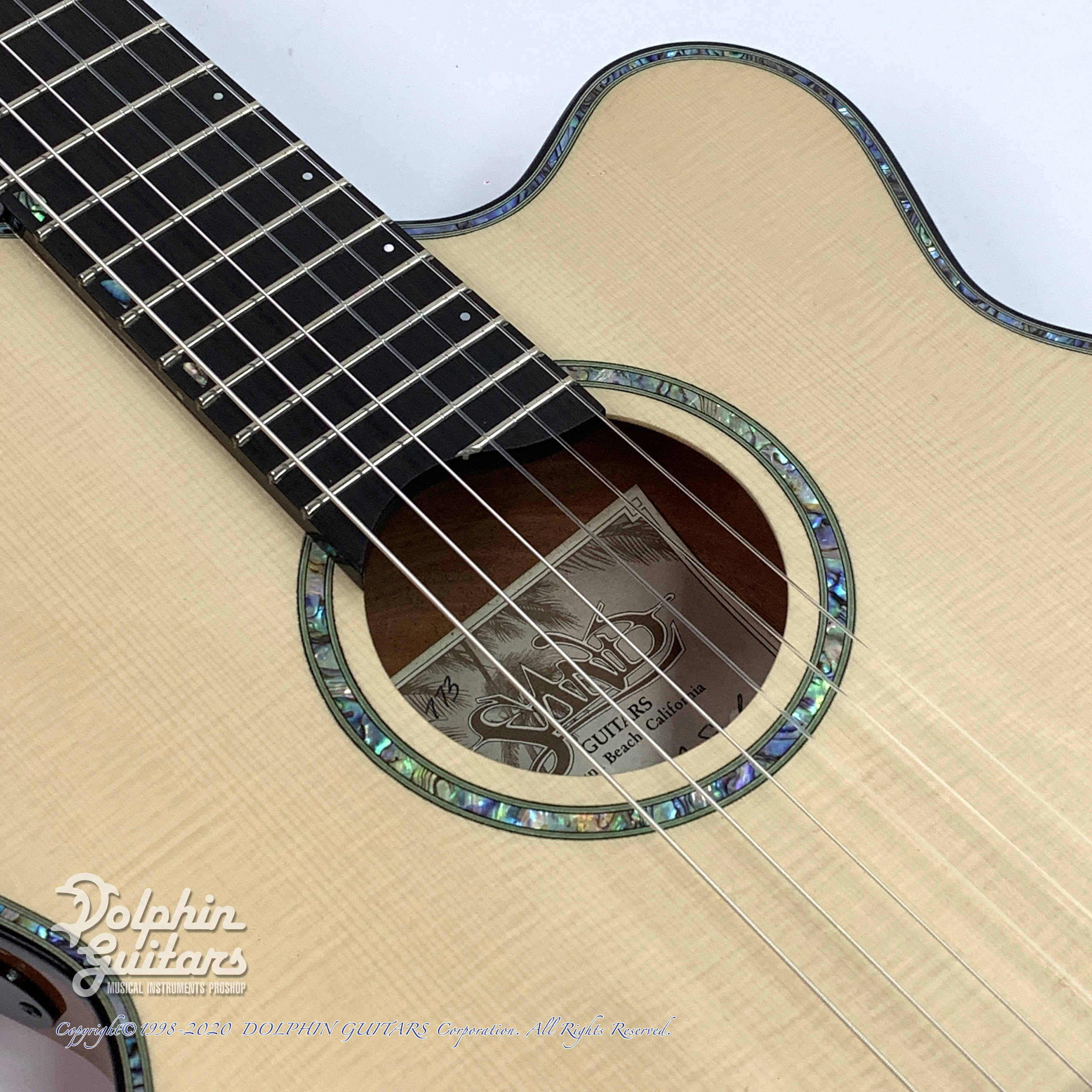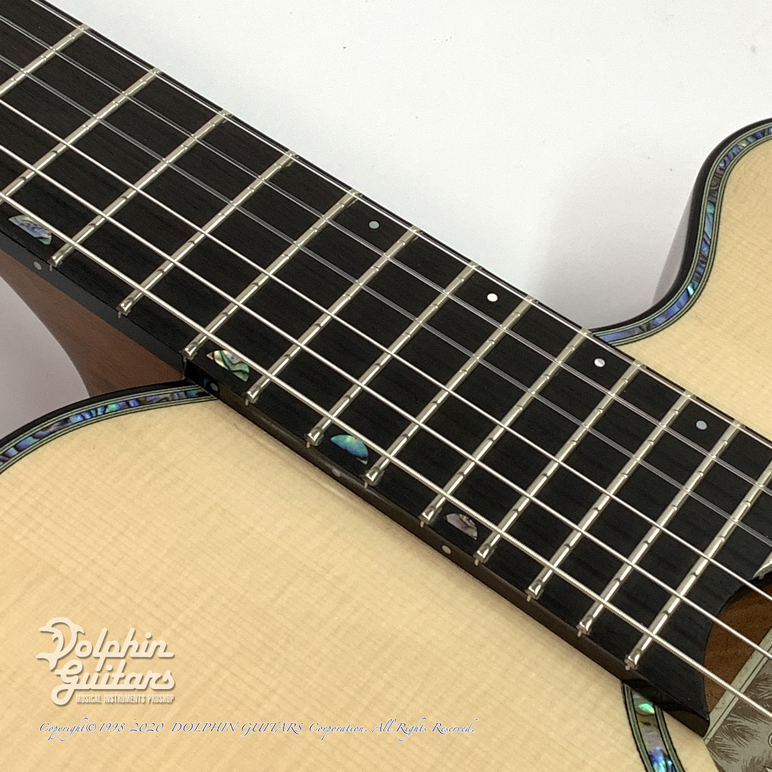 約60mmの丸みのあるボディの抱え心地はとても心地よく、約2.04Kgの軽さは疲れを一切感じません。また、48mm幅ネックに640mmスケールによるほどよく柔らかいテンションは、プレイヤー目線で良く考えられた設計です。このボディバランス、演奏性、各弦のテンションバランスの良さは特筆モンです!
