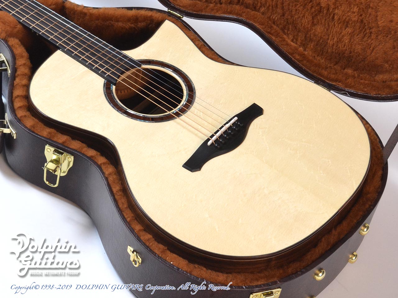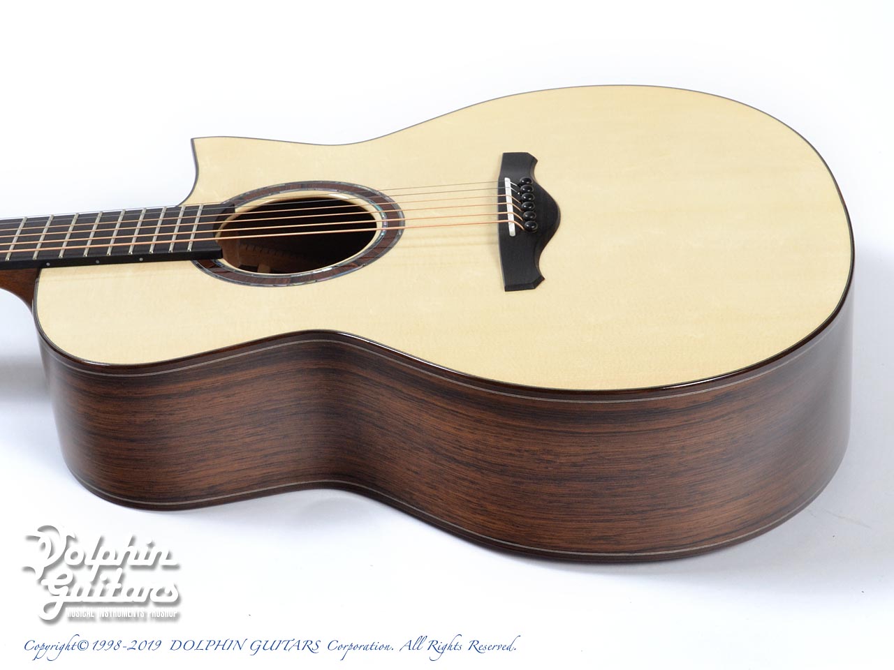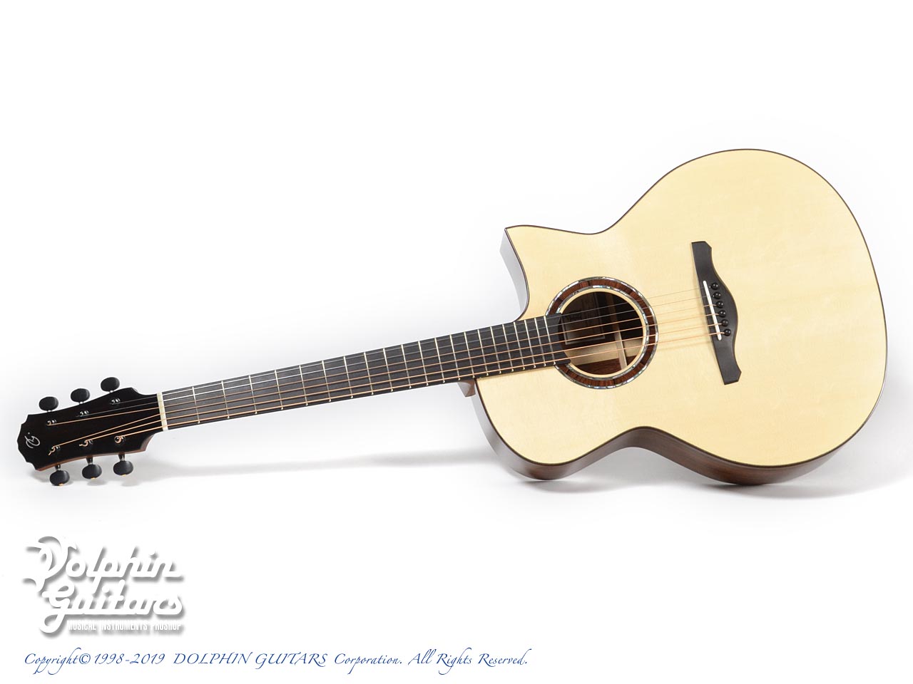 ベアクロウ・スイス・ムーンスプルーストップ、マダガスカル・ローズウッド・サイド&バック、ホンジュラス・マホガニー1pネック、エボニー指板&駒&バインディング、アバロン+ウッド・ロゼッタ、フローレンタイン・カッタウェイ。