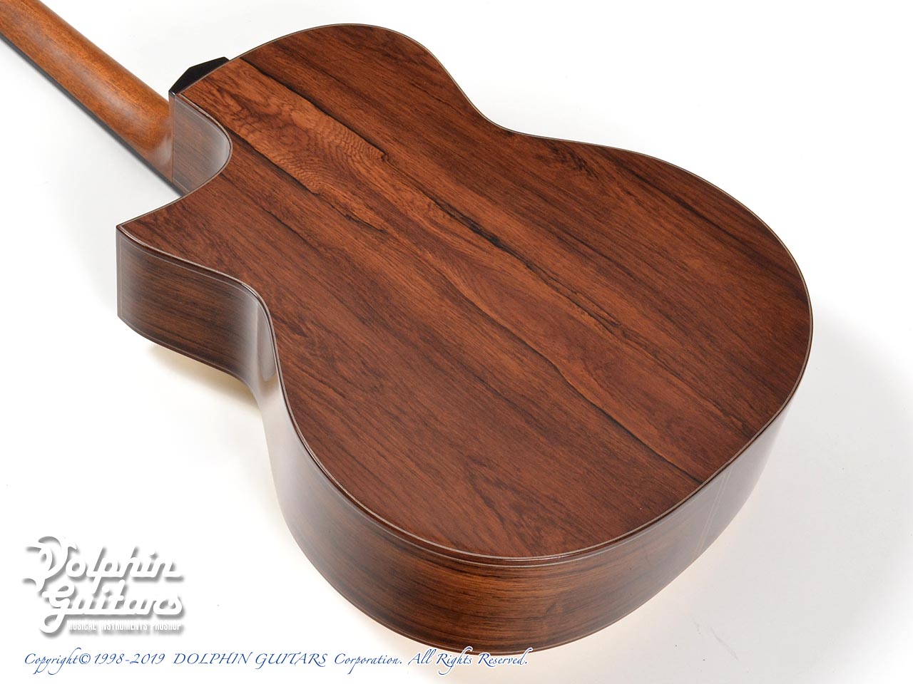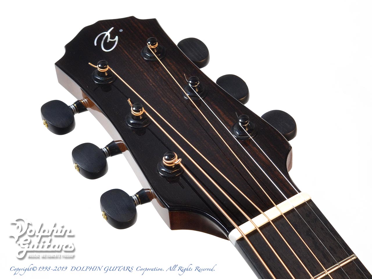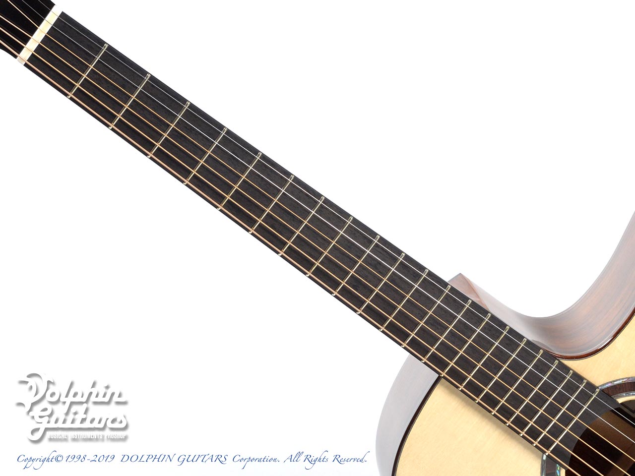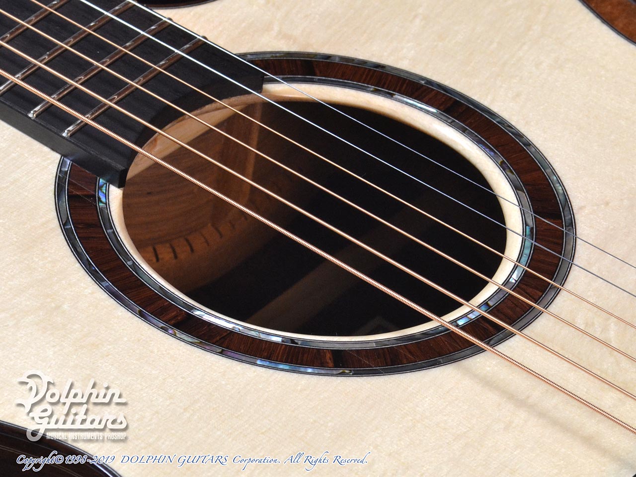 ベアクロウ・スイス・ムーンスプルーストップ、マダガスカル・ローズウッド・サイド&バック、ホンジュラス・マホガニー1pネック、エボニー指板&駒&バインディング、アバロン+ウッド・ロゼッタ、フローレンタイン・カッタウェイ。